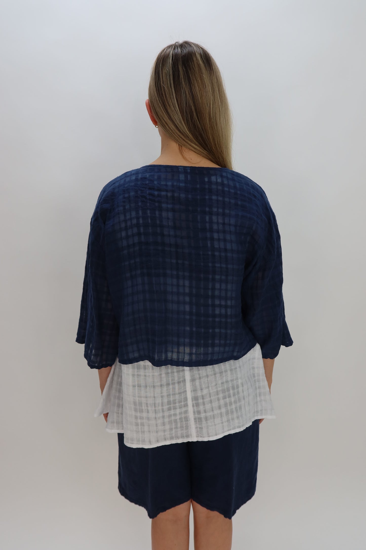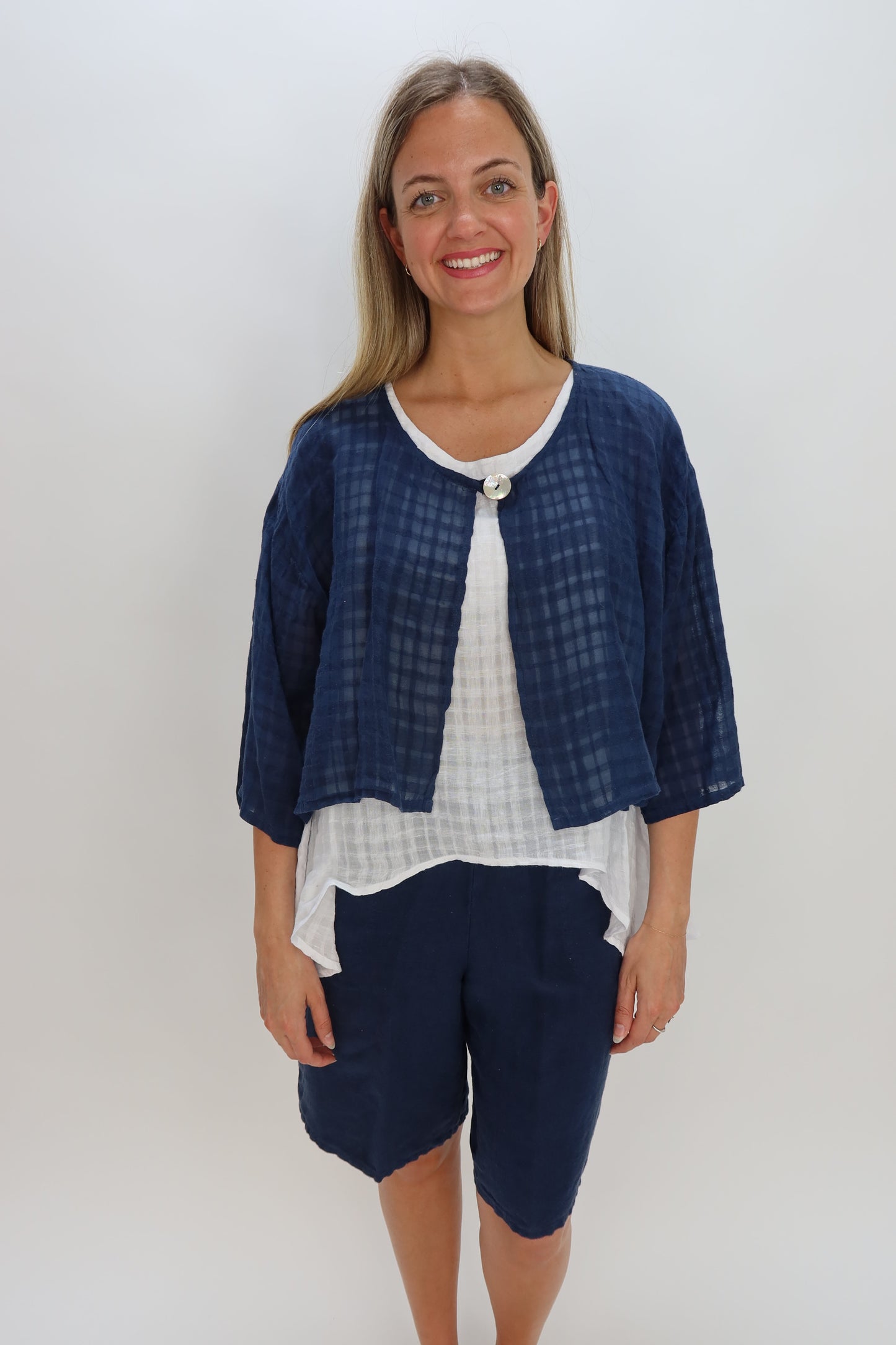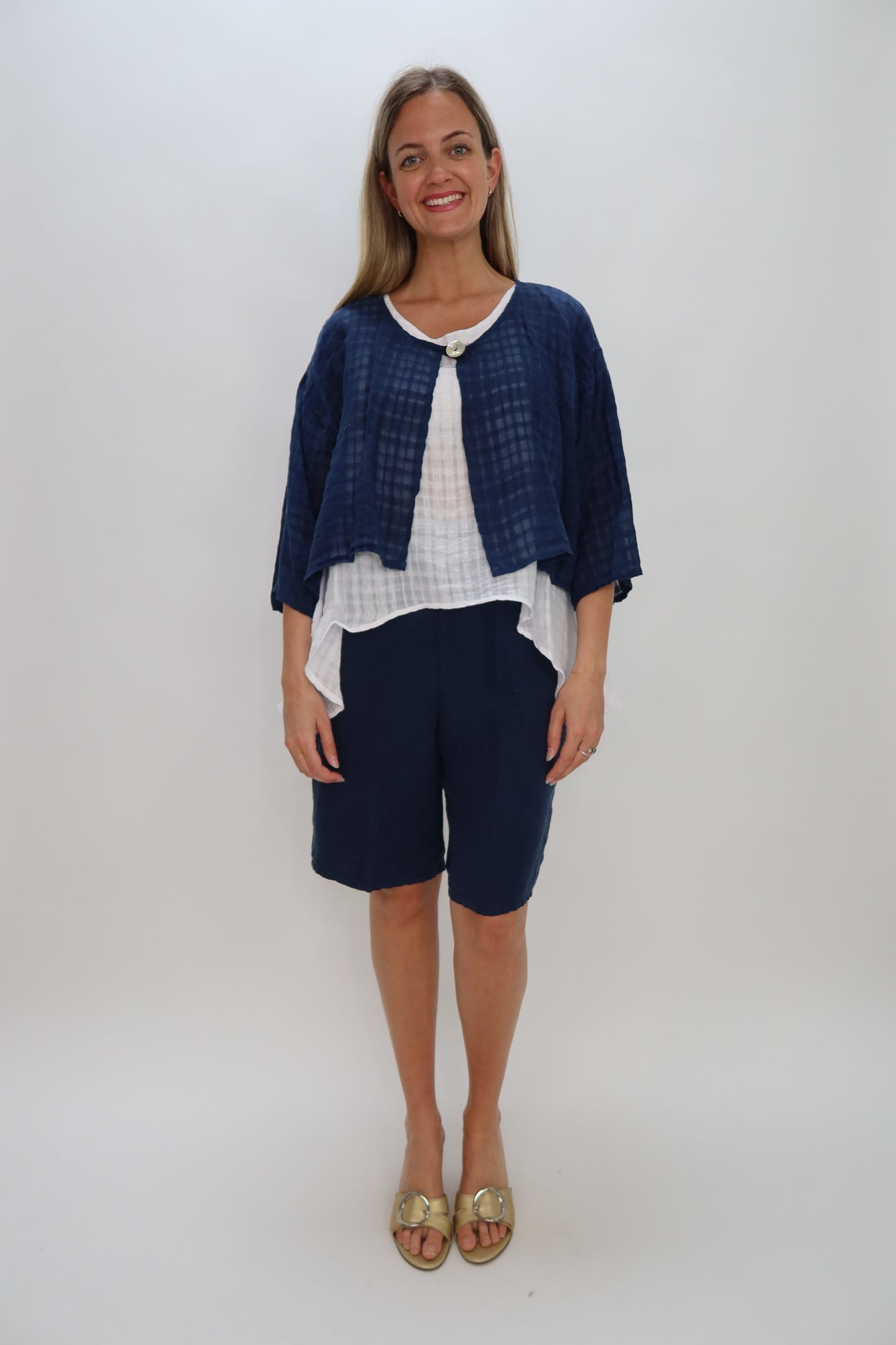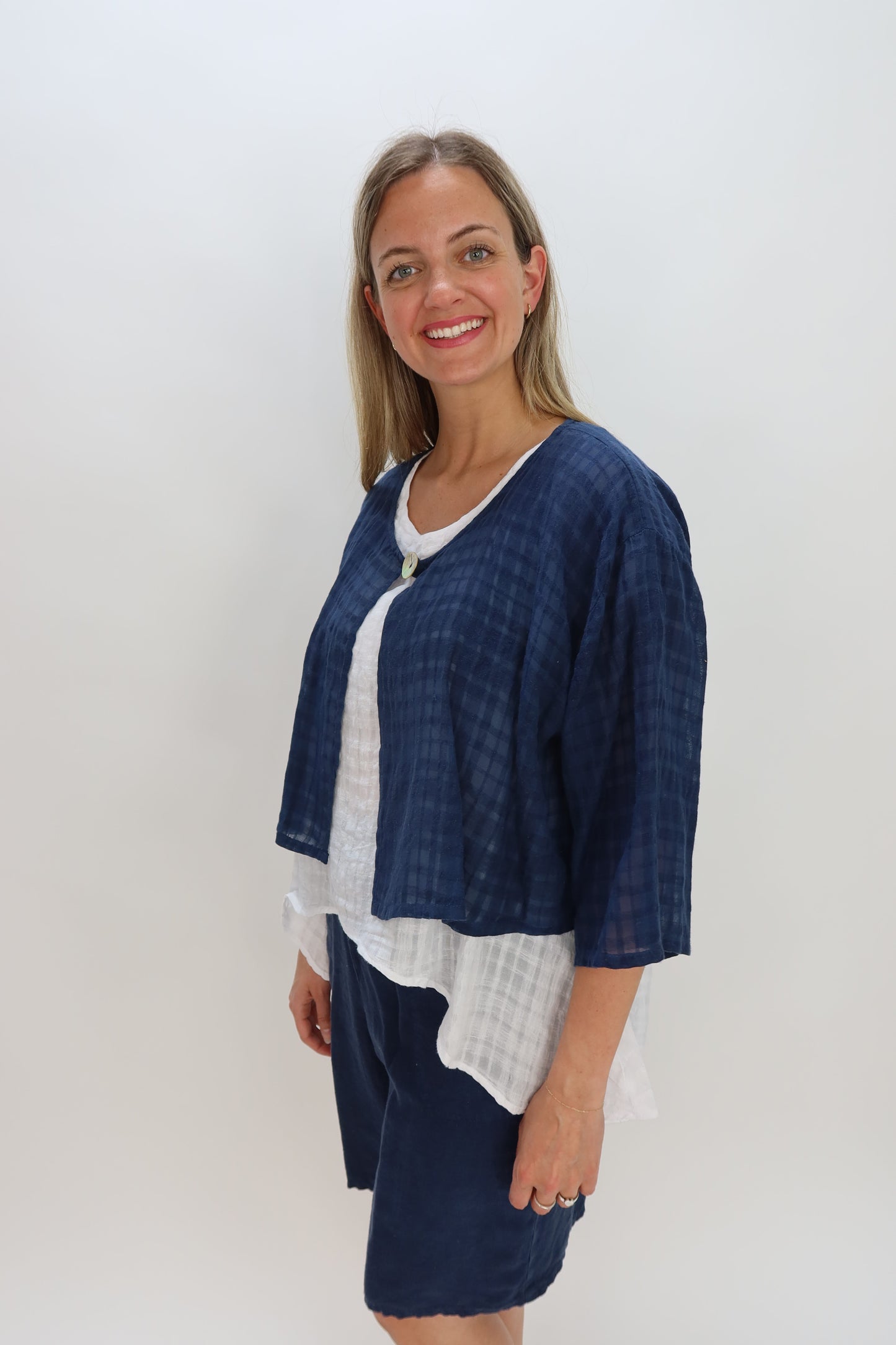 Navy Blue Waffle Bolero 100% Linen Button Closure Top