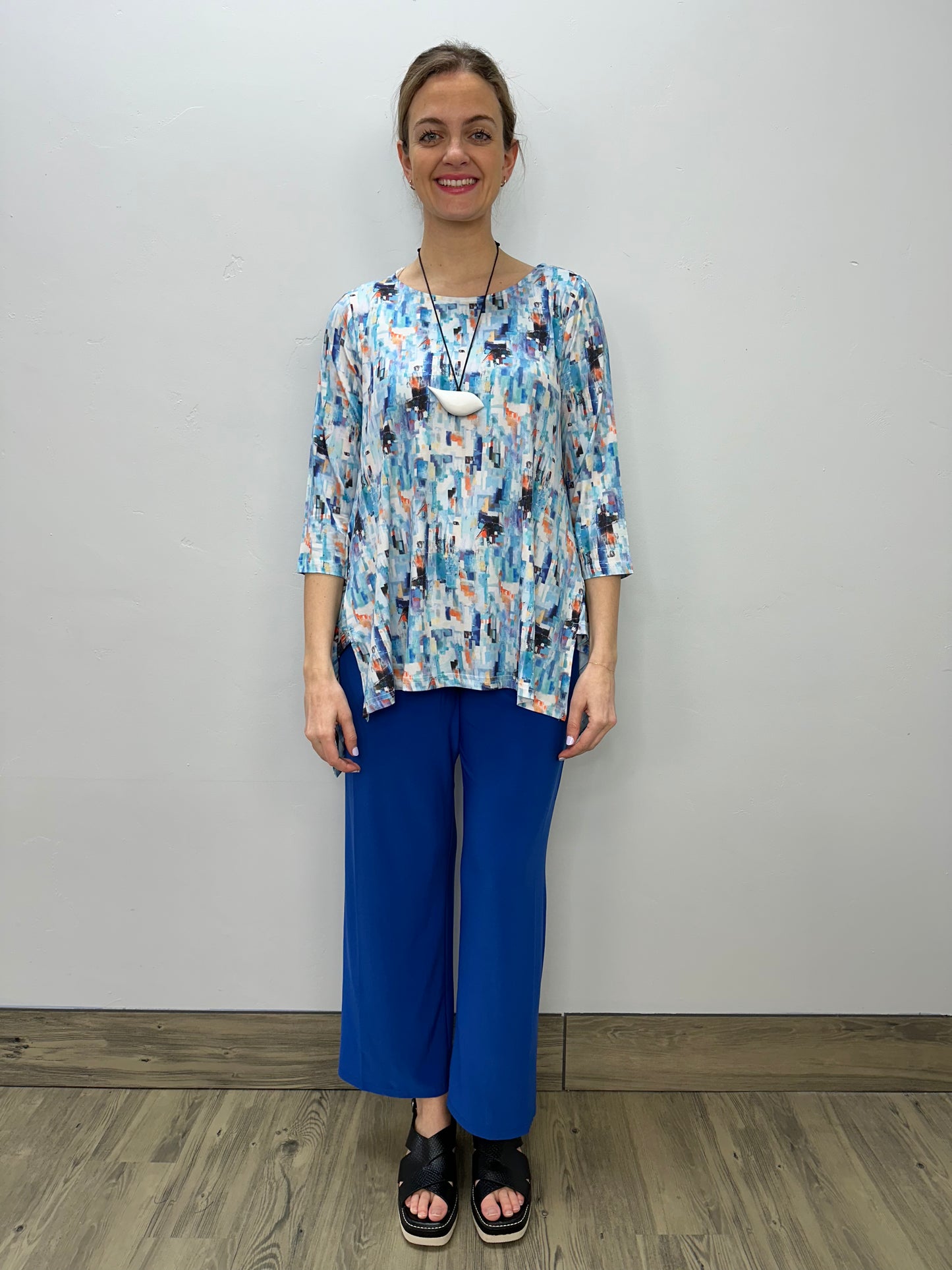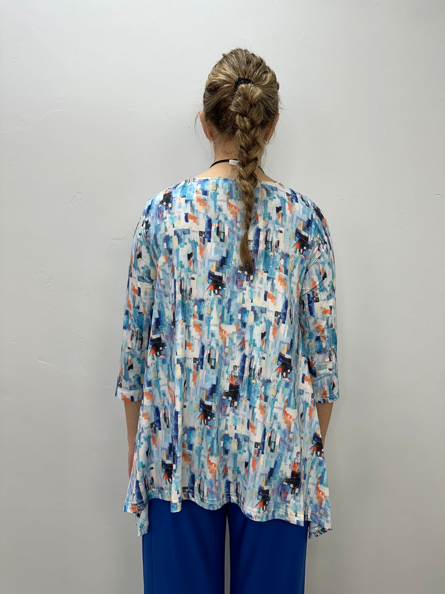 Abstract Blue Block 3/4 Sleeve Shark-bite Pattern Tunic