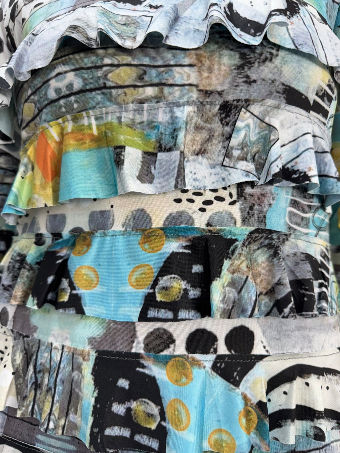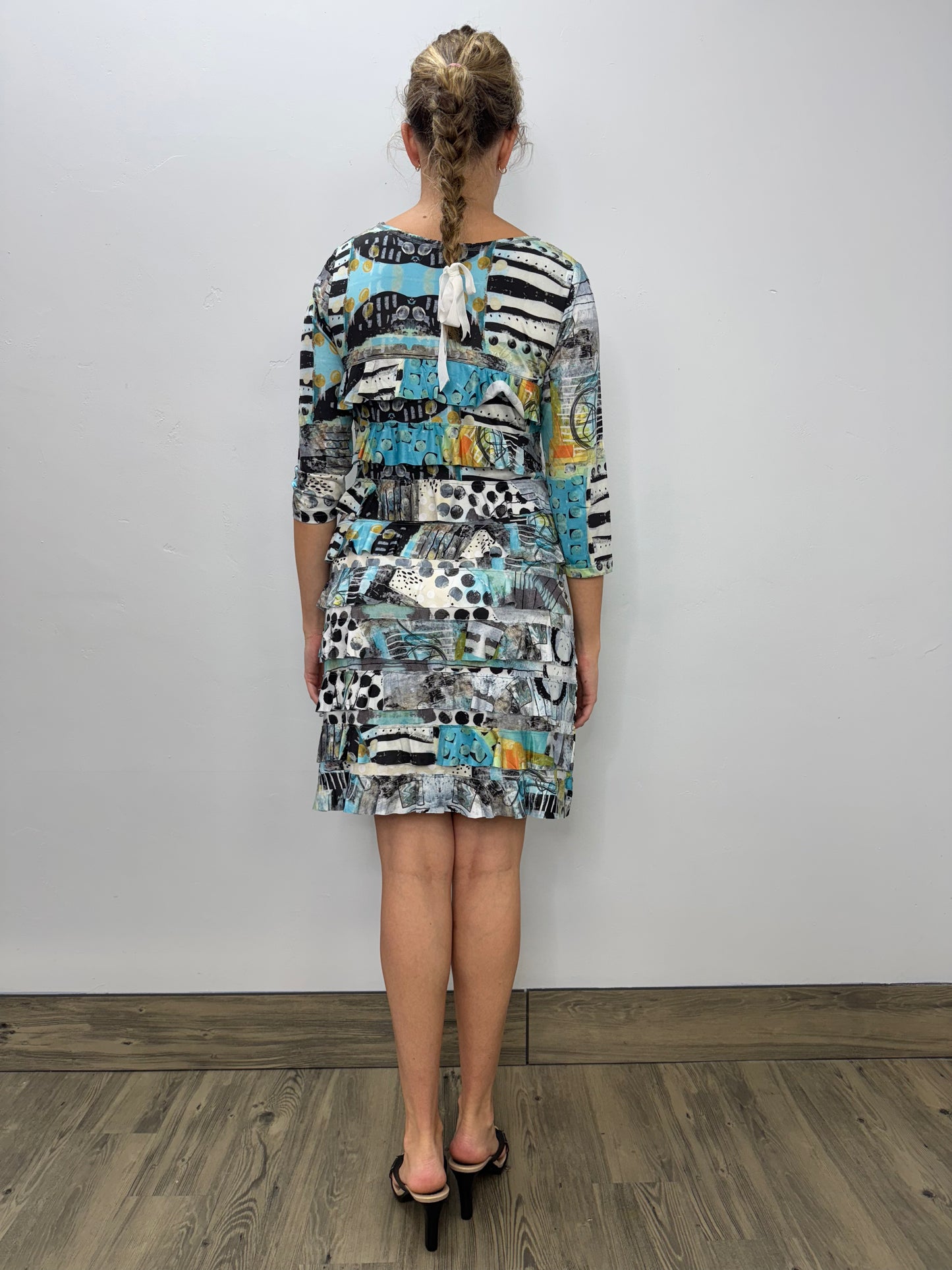A true to size fit with plenty of stretch, this Blue and Yellow Abstract Painting Tango Mango ruffle dress is designed with a scoop neck and 3/4 sleeves.