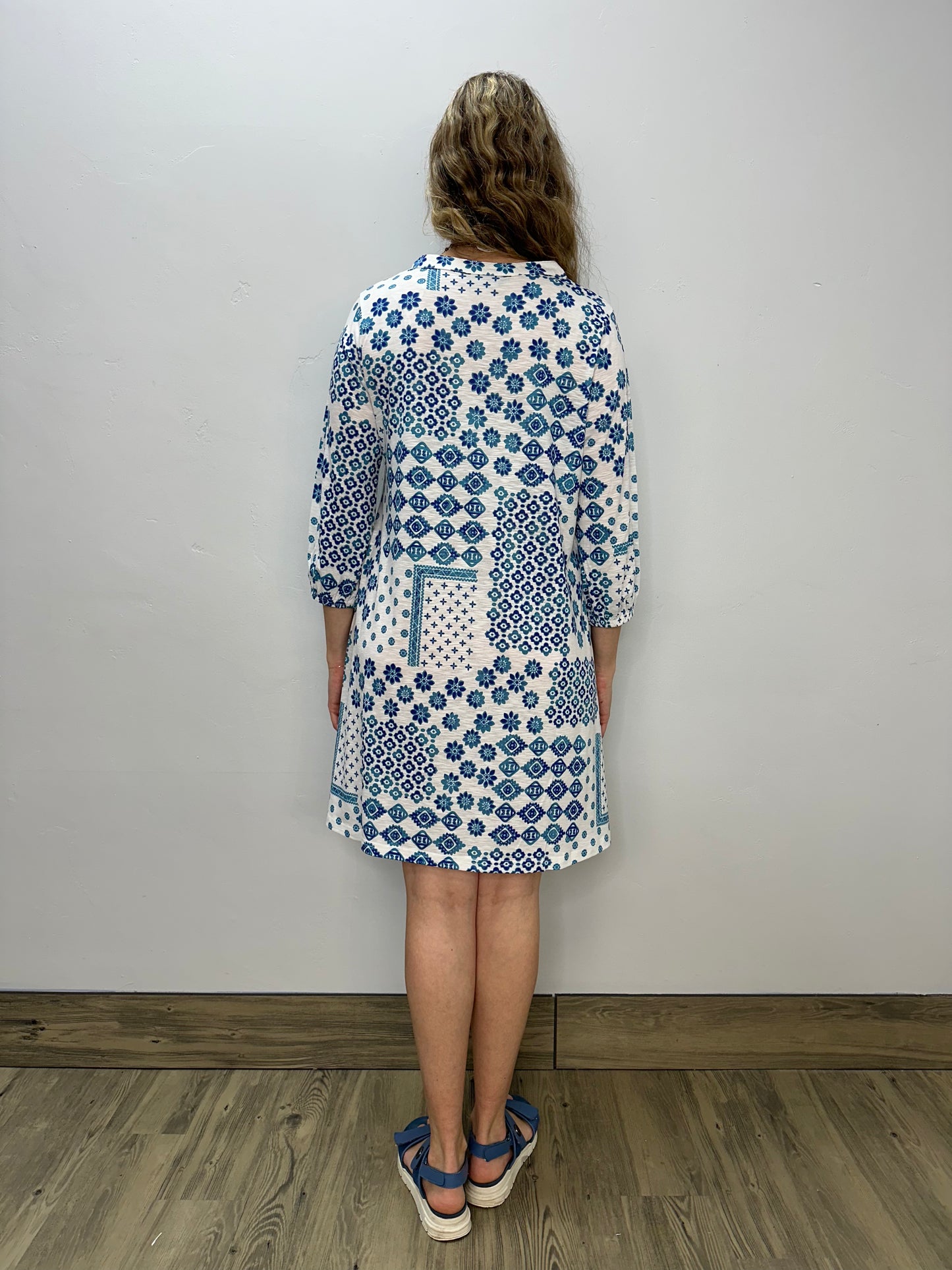 Experience a perfect blend of style and comfort with our Blue Pattern V Neck 3/4 Sleeve Dress. The beautiful blue pattern and flattering v neck design will make you stand out, while the 3/4 sleeves and knee length keep you comfortable all day long. Upgrade your wardrobe with this must-have dress!
