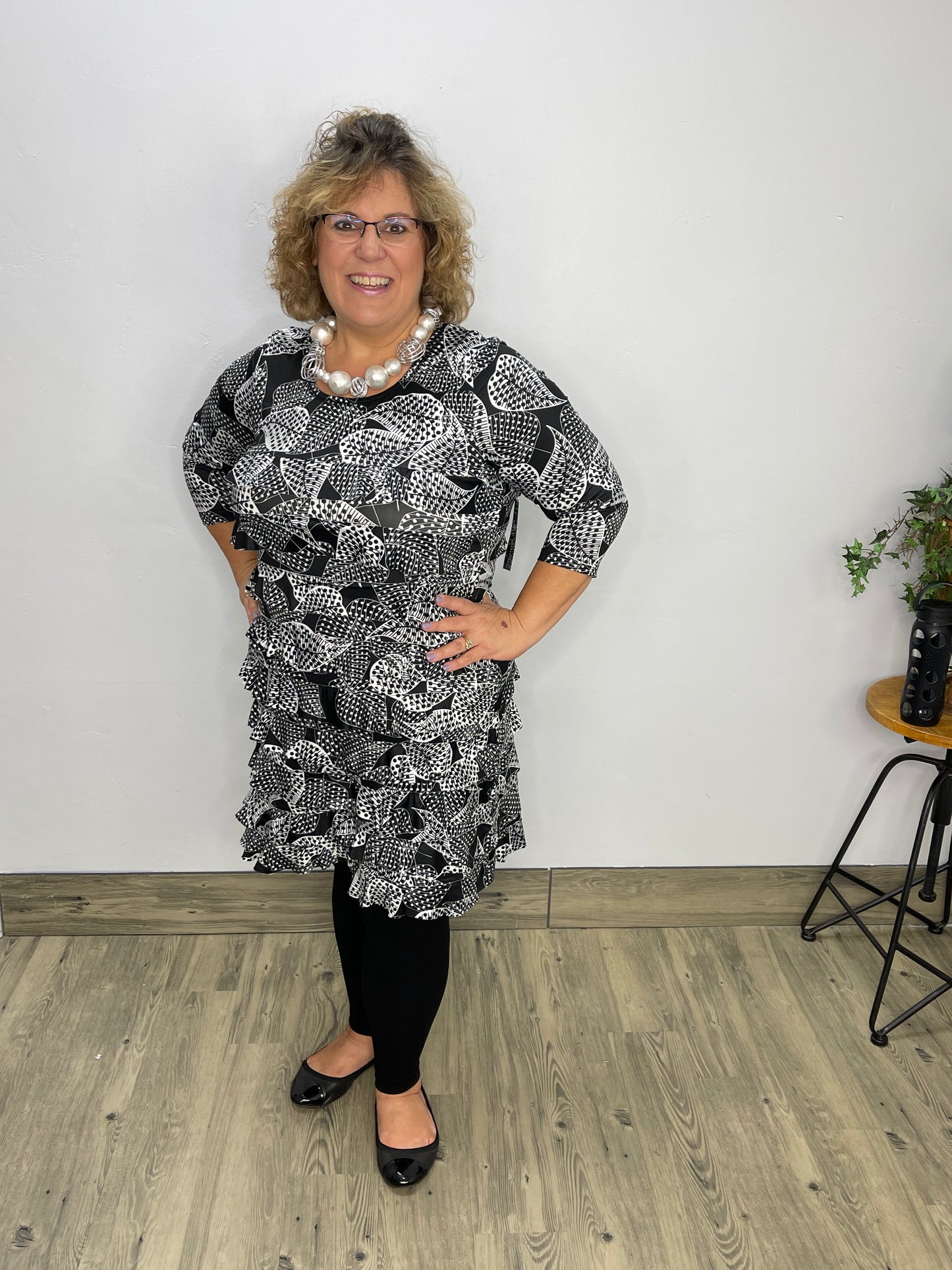 A true to size fit with plenty of stretch, this black and white Tango Mango ruffle dress is designed with a scoop neck and 3/4 sleeves.