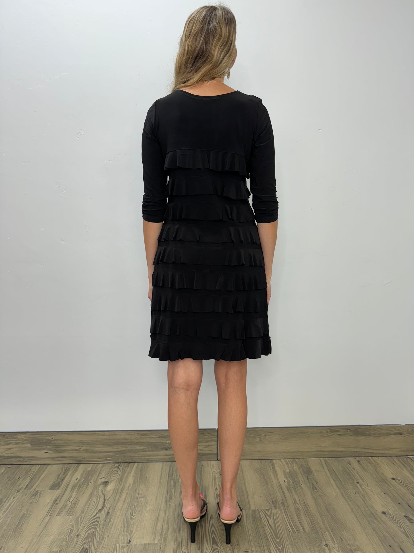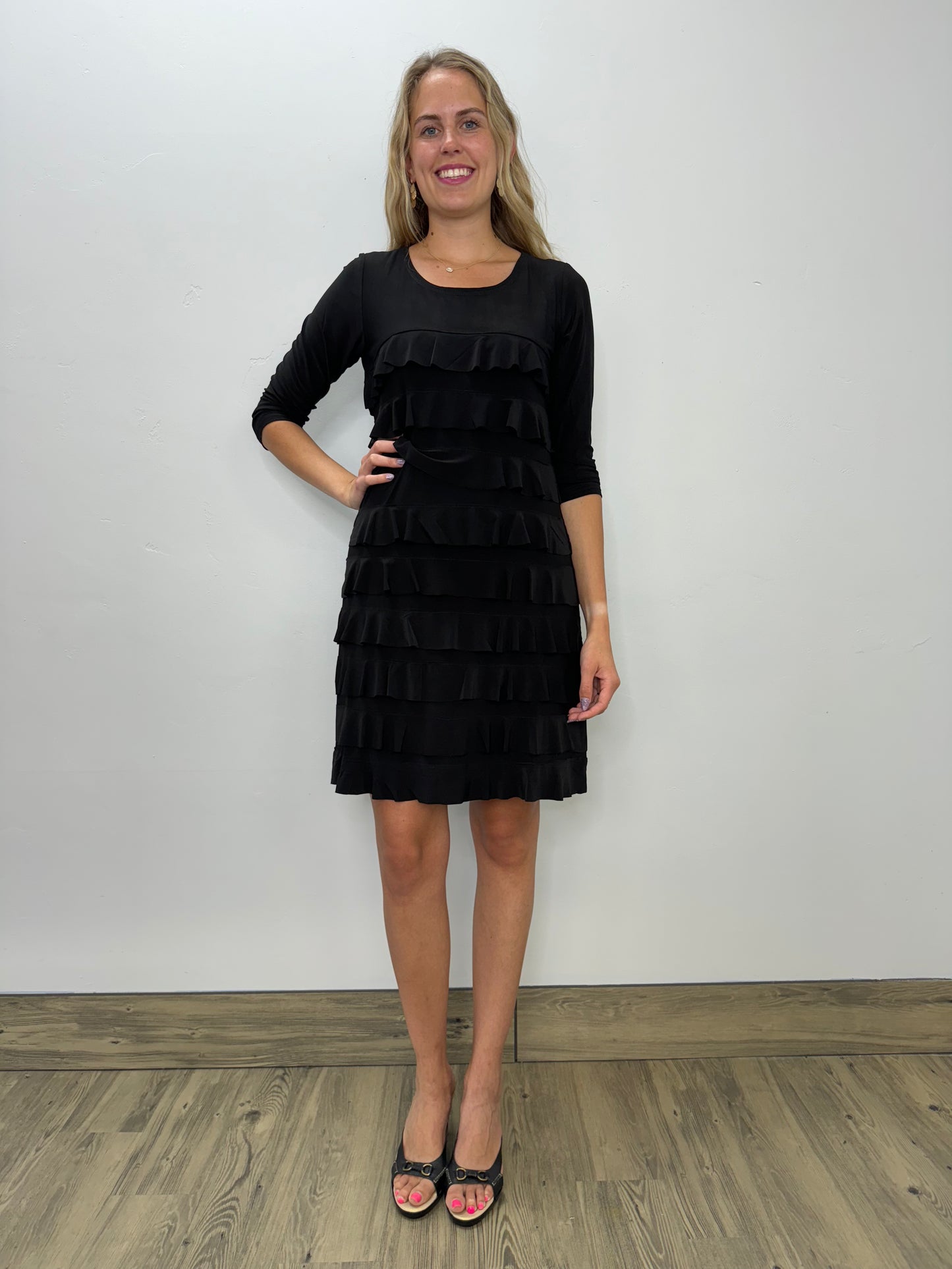 Solid Black Scoop Neck Ruffle Dress with 3/4 Sleeve - PRE ORDER