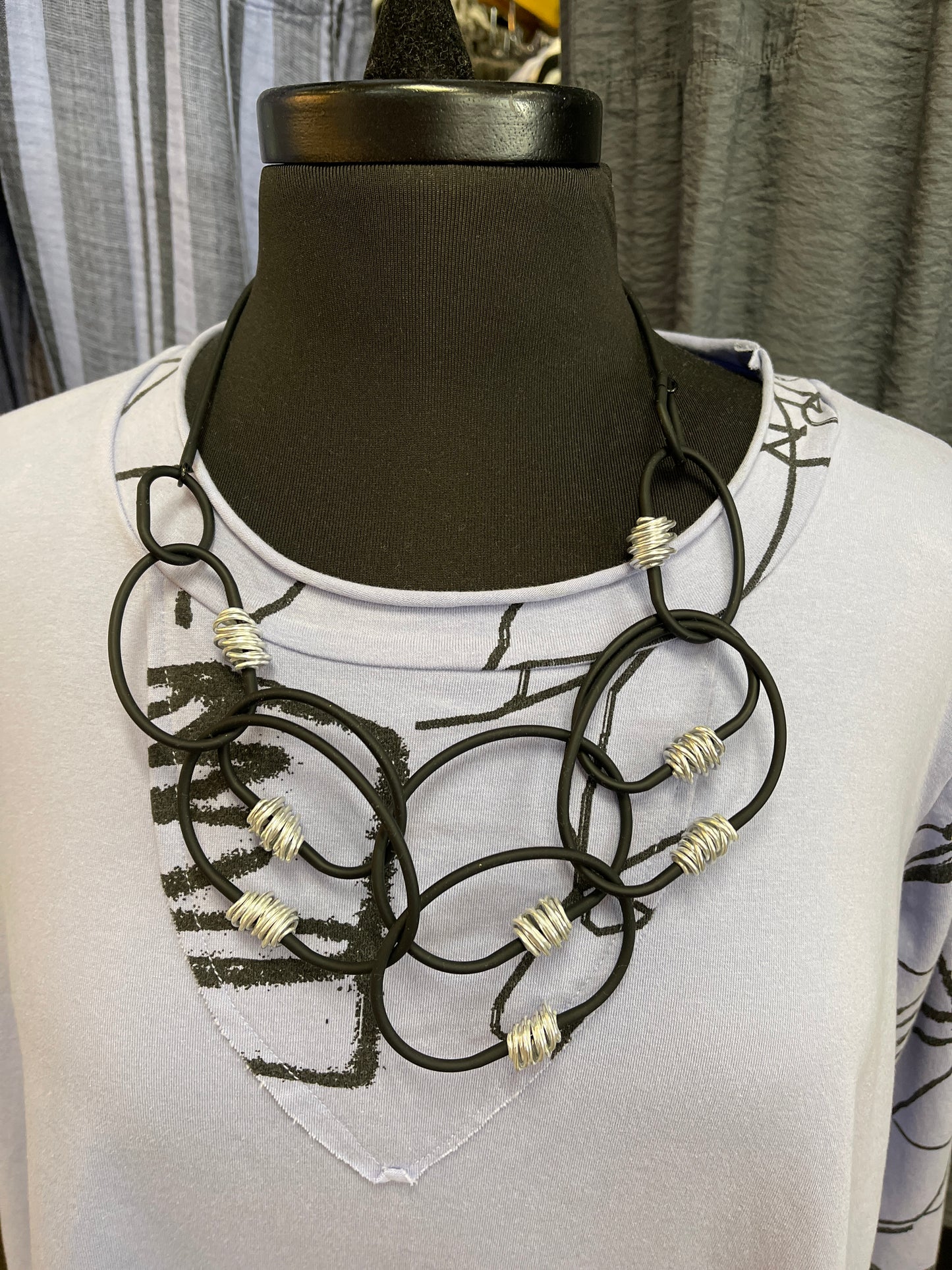 This Aluminum Handmade Necklace is created by our one-of-a-kind artist using recycled aluminum and inner tube to create unique and artistic wearable art.
