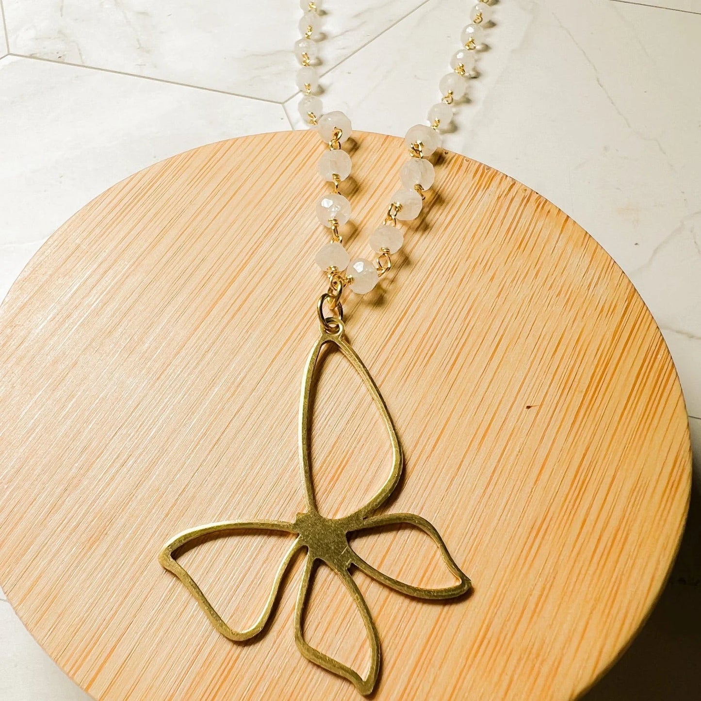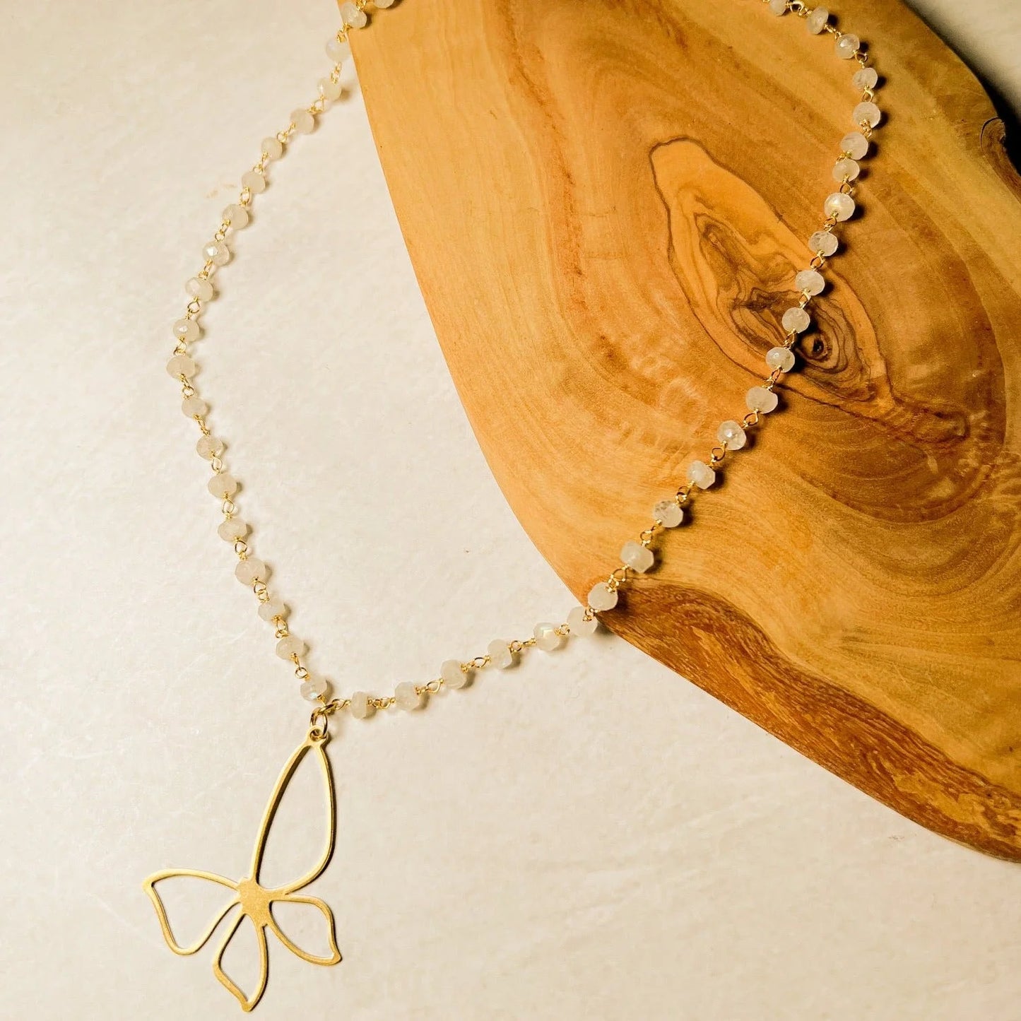 Belora is a french word that means "To be beautiful now". Our whimsical butterfly necklace has an organic artsy style to it that encompasses a spirit of freehearted beauty. Belora is combined with a delicate gemstone chain of your choice in Labradorite (A stone for protection), or Moonstone (A stone of strength). Whether you wear this beauty to the gardens, a zoom meeting, or to the cafe, you will feel the free-spirited graceful vibe these beauty brings!