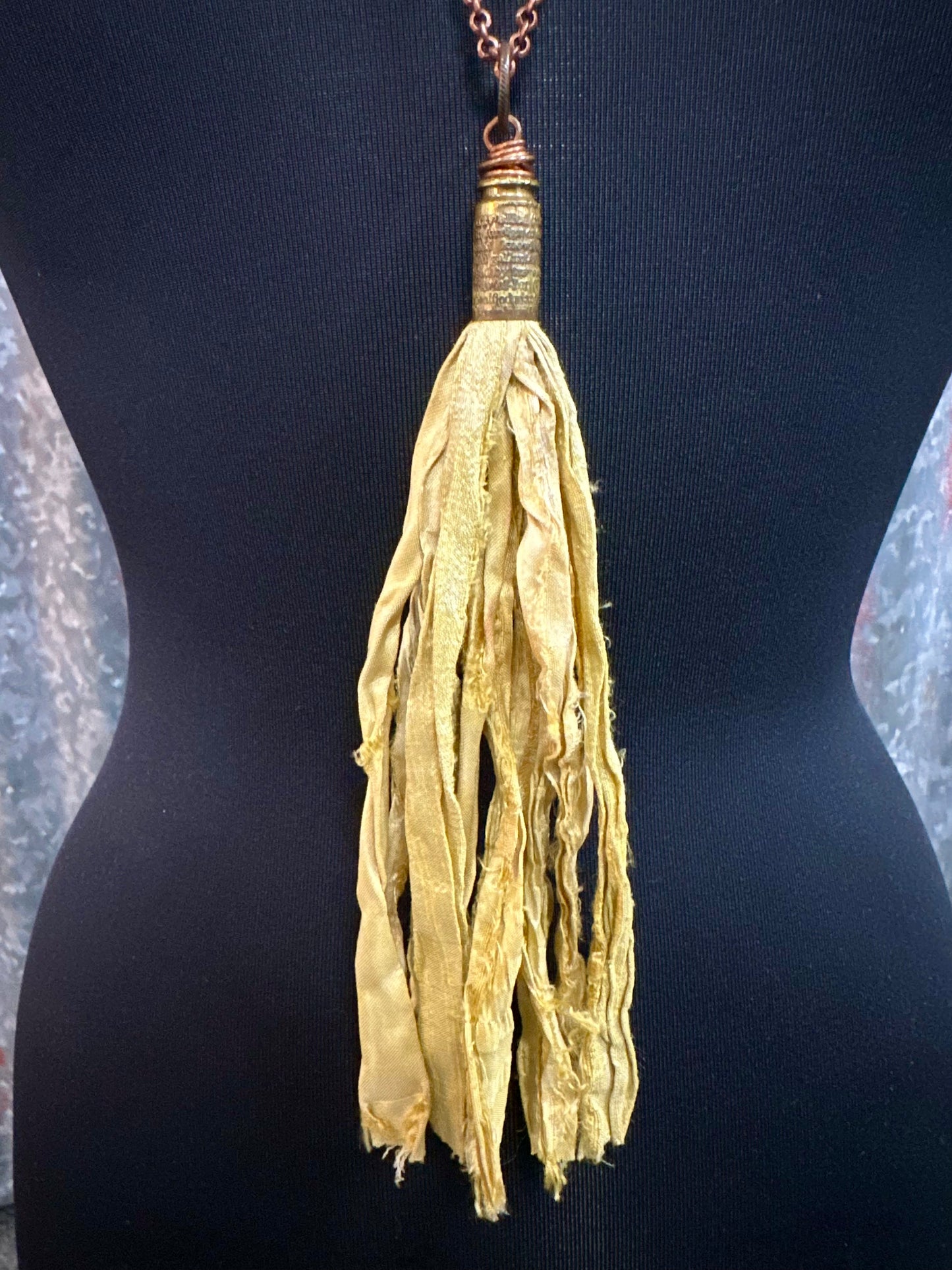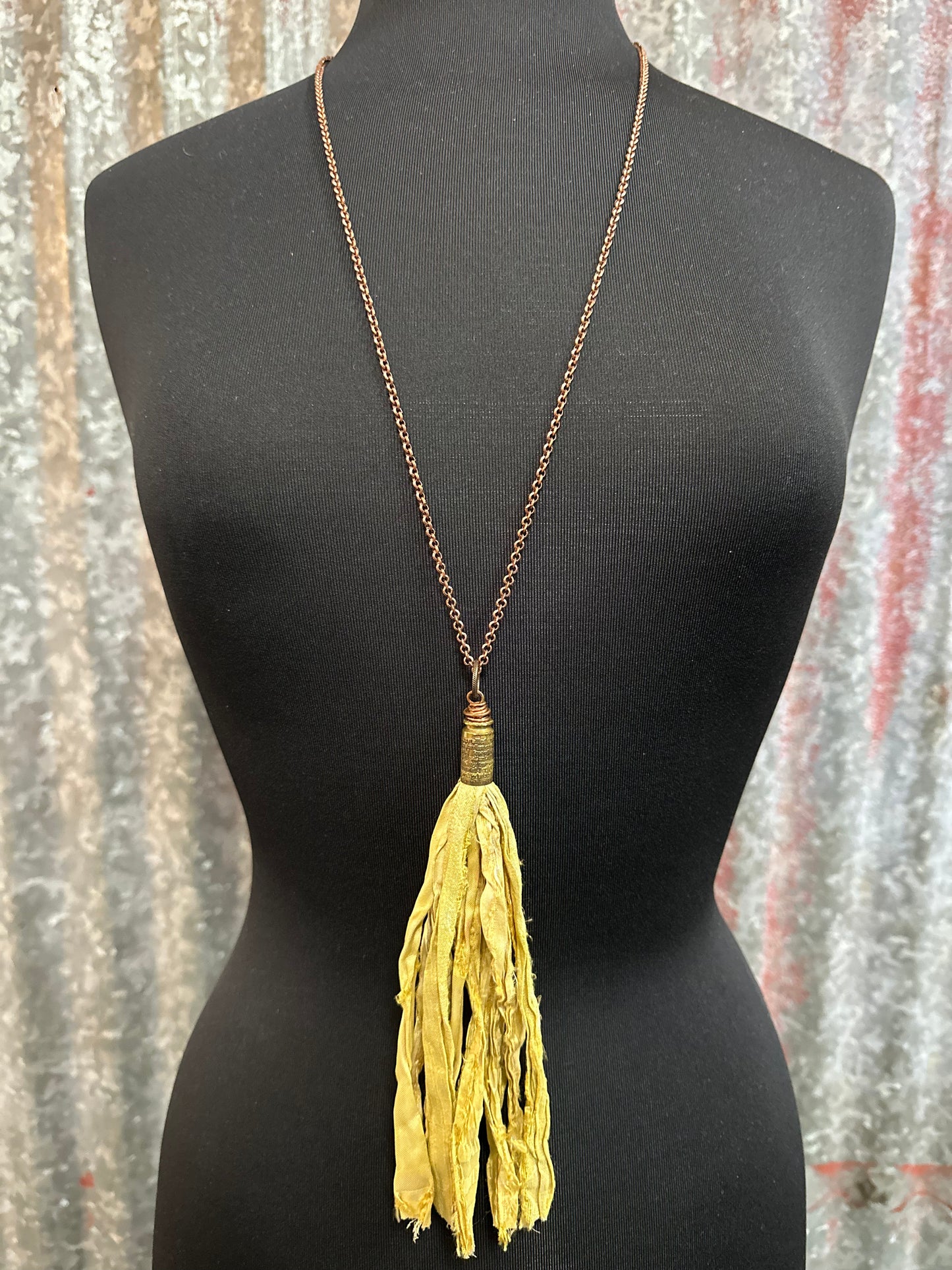 Add a touch of elegance and edge to any outfit with our Daffodil Yellow, Handmade, one of a kind, Silk Tassel Bullet Casing Necklace. The custom copper chain enhances the unique design, making it a one-of-a-kind piece. Perfect for those looking to make a statement and stand out from the crowd. Dare to be bold!