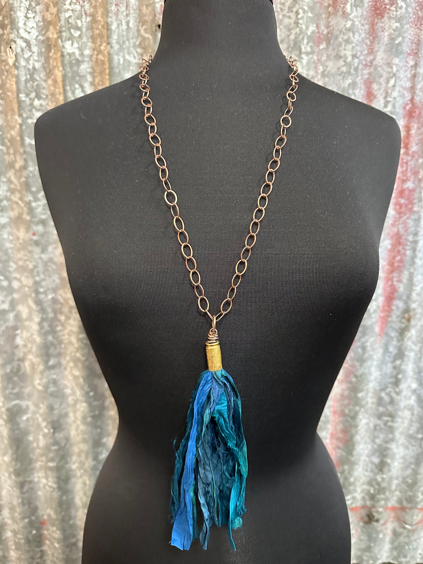 Add a touch of elegance and edge to any outfit with our Deep Teal, Handmade, one of a kind, Silk Tassel Bullet Casing Necklace. The custom copper chain enhances the unique design, making it a one-of-a-kind piece. Perfect for those looking to make a statement and stand out from the crowd. Dare to be bold!