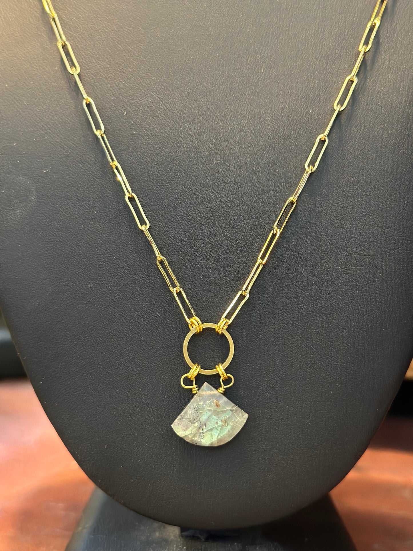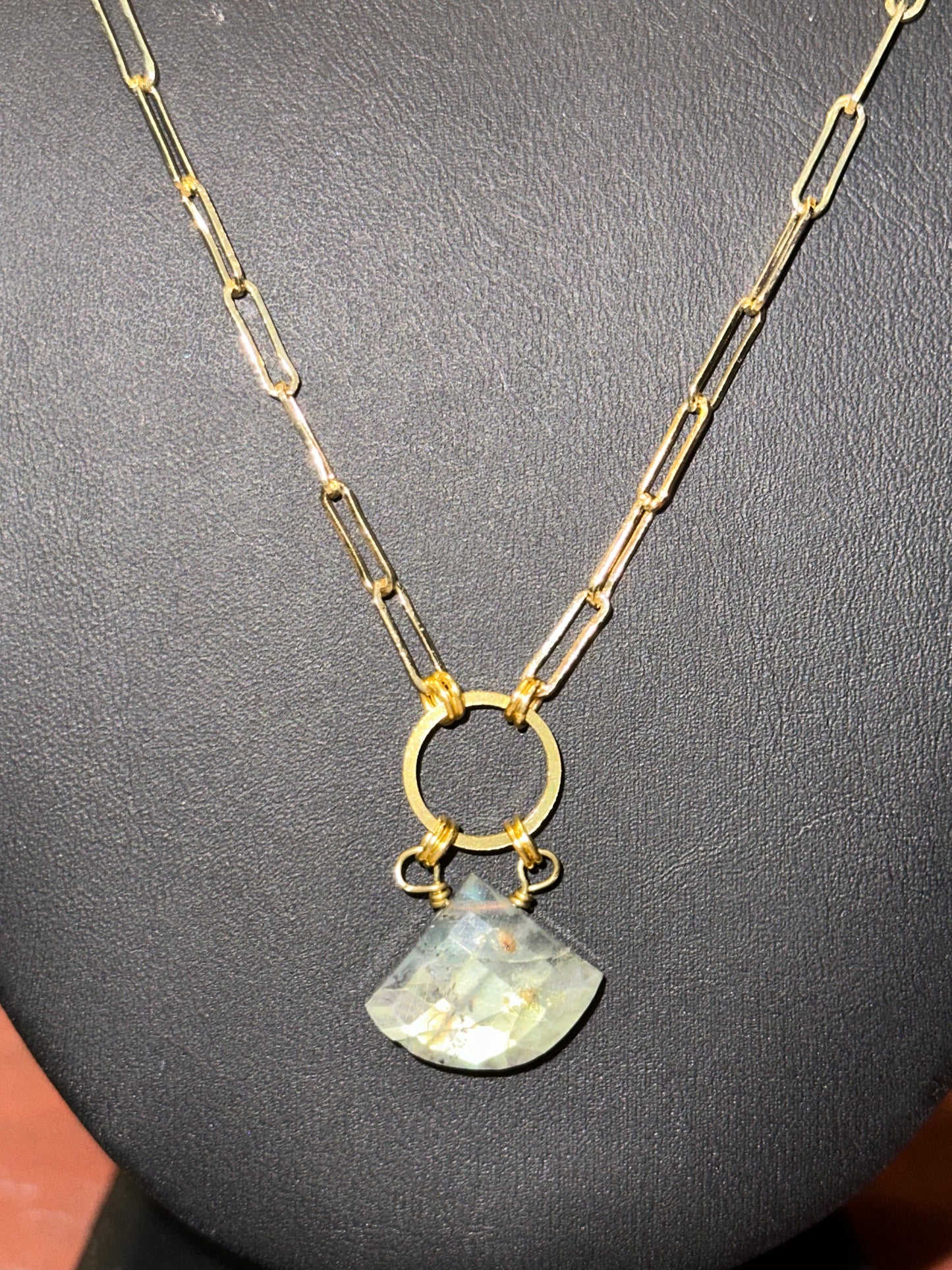 Specialty cut labradorite gemstone framed with brass wire. You can choose bronze, black, or gunmetal faceted chain and the length is 16” with a 2” extender on the back.