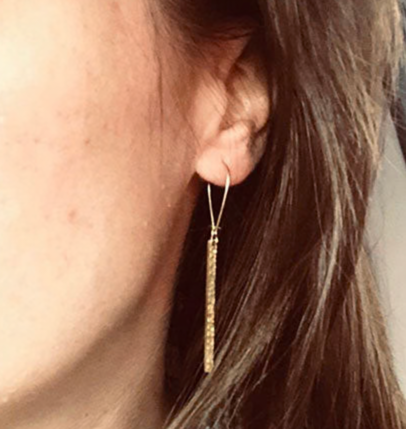 A hammered brass 3D bar makes for a simple easy to wear earring.