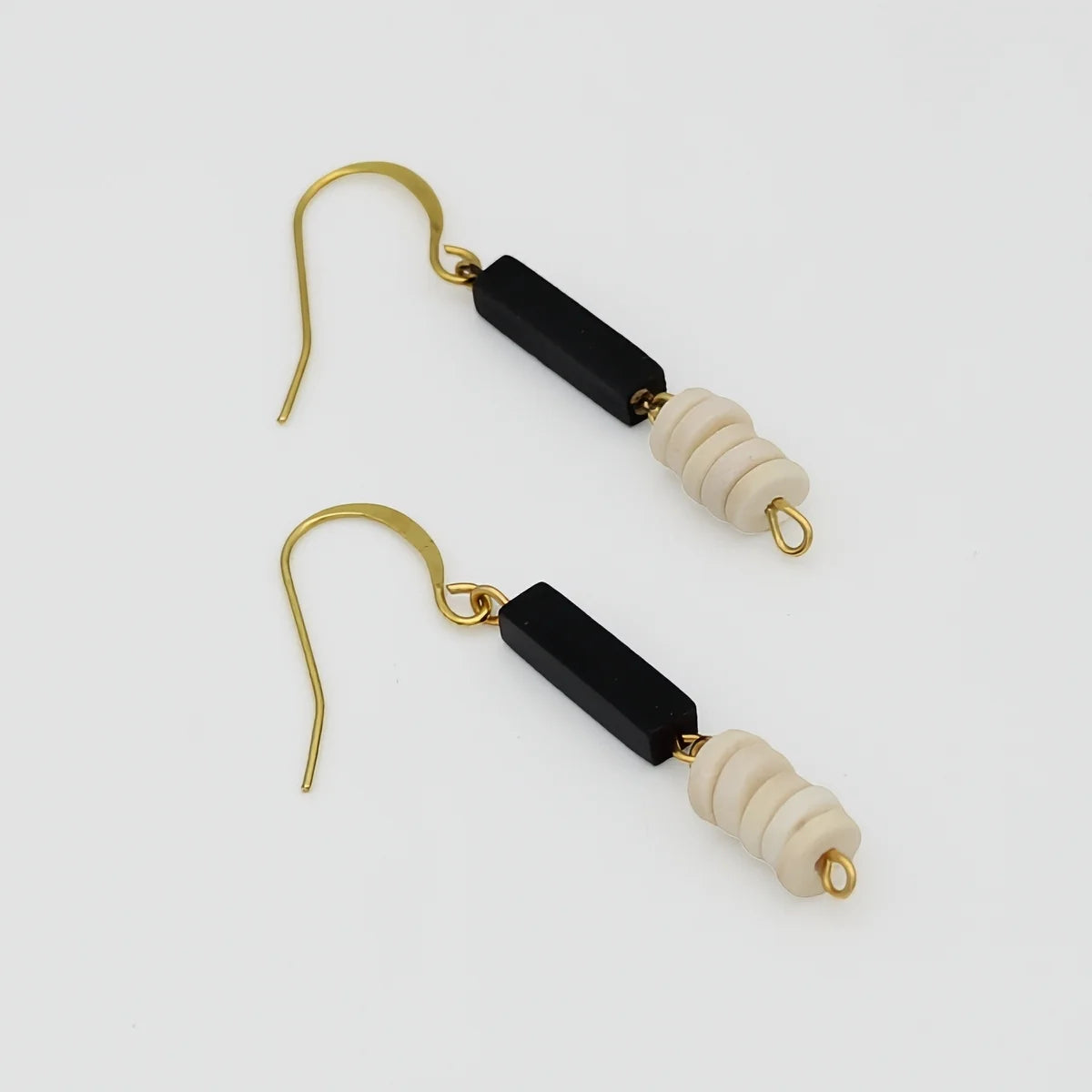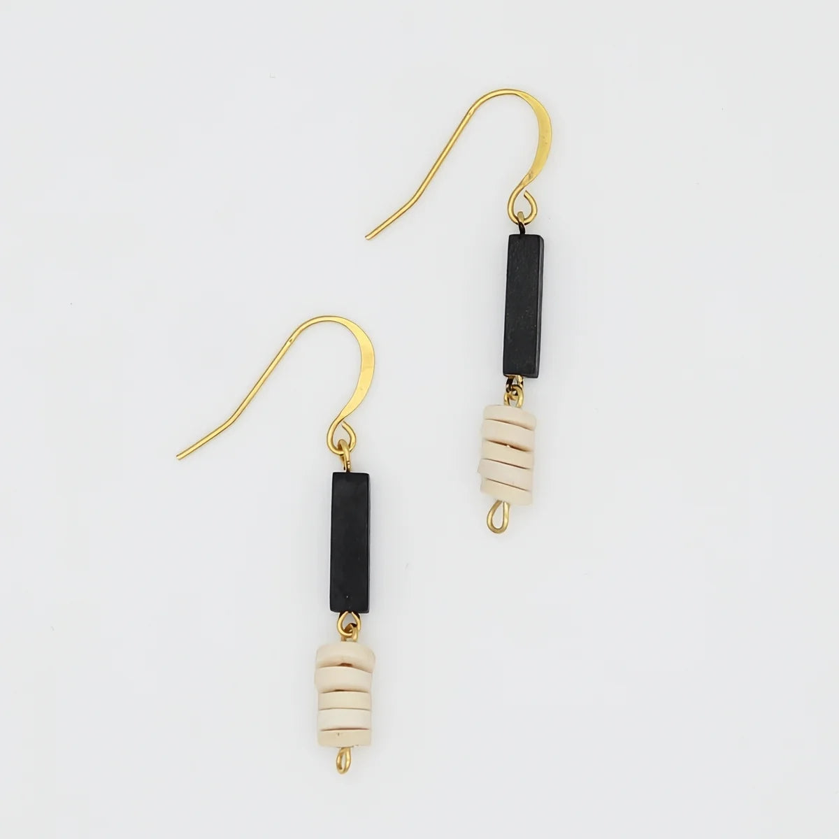 Elevate your style with our Ivory and Black Dangle Earrings. These handmade earrings feature ivory wood ball beads and black rubber tube hanging on a gold plated french hook. Perfect for a statement look with our necklaces, or solo for a sophisticated touch. Perfect for those who appreciate unique, handcrafted accessories.