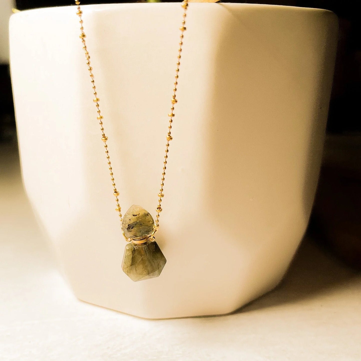 Everyone needs a little bit of Magic up their sleeve... Jeanie is a petite working bottle necklace. The top unscrews and there is a steel a vessel inside. Here you can keep a few drops of your favorite potion ready and available (essential oils, perfume, vodka, tequila... ). The bottle itself is made of carved gemstone and has the most beautiful iridescence to it. The bottle is hung on our signature "fancy" chain made of delicate faceted jewelers brass. At the back is a 2" extension so you can adjust the necklace as best.