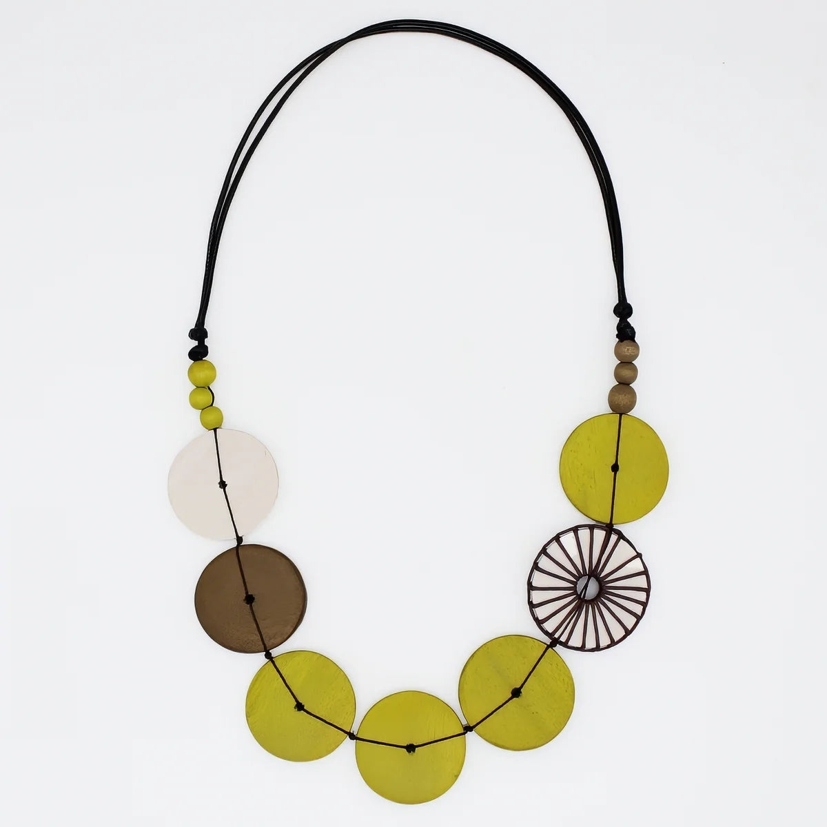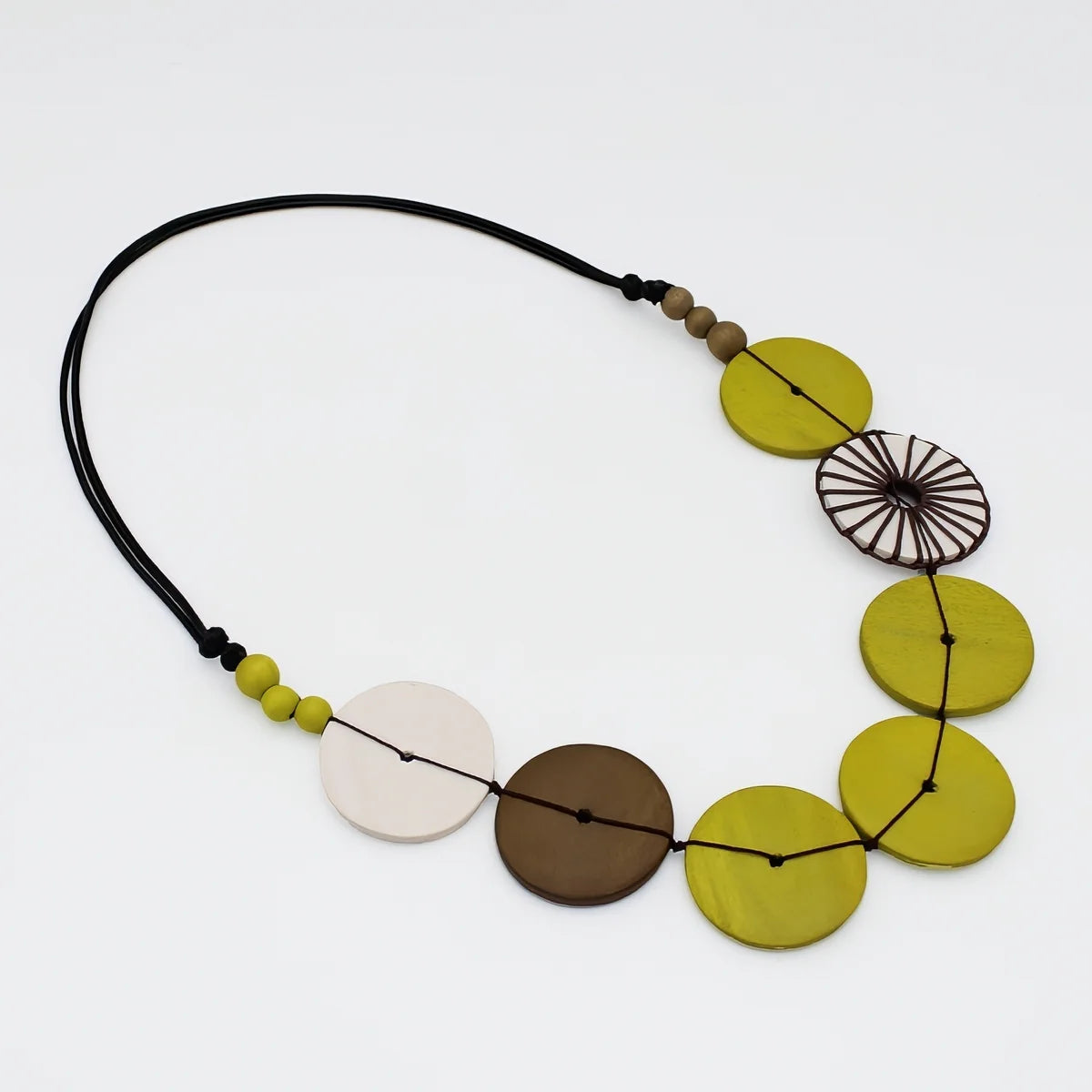 Lime and Brown Wooden Circles Wrapped Bead Adjustable Necklace