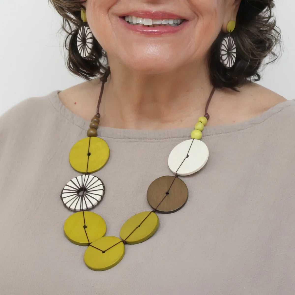 Discover a show-stopping accessory that will instantly elevate your look - our Lime and Brown Wooden Circles Wrapped Bead Adjustable Necklace. This lime necklace boasts a unique design, carefully handcrafted to capture attention from every angle. The combination of vibrant wood beads and the contrasting accents in brown, lime green and white create a striking and harmonious effect in a lightweight design.