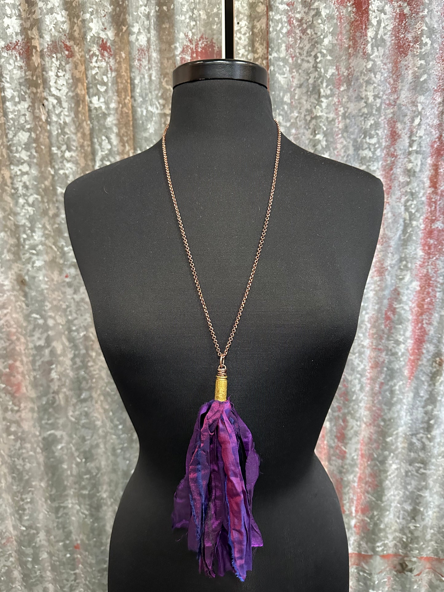 Add a touch of elegance and edge to any outfit with our Purple, Handmade, one of a kind, Silk Tassel Bullet Casing Necklace. The custom copper chain enhances the unique design, making it a one-of-a-kind piece. Perfect for those looking to make a statement and stand out from the crowd. Dare to be bold!