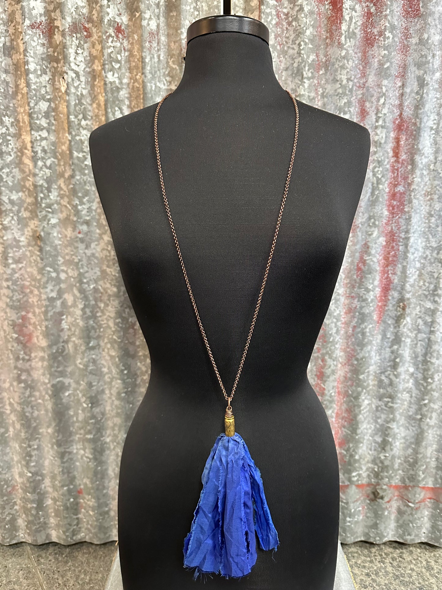Add a touch of elegance and edge to any outfit with our Royal Blue, Handmade, one of a kind, Silk Tassel Bullet Casing Necklace. The custom copper chain enhances the unique design, making it a one-of-a-kind piece. Perfect for those looking to make a statement and stand out from the crowd. Dare to be bold!