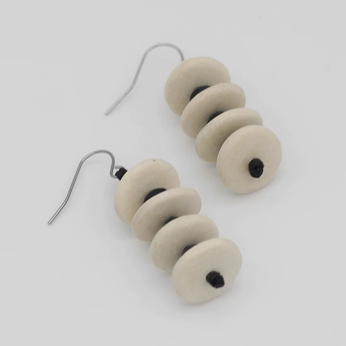 Make a bold statement with these exceptional White Tiggy statement earrings. Combining the stunning colors of white and black, these earrings boast a unique design that will surely turn heads. Crafted with flat and round wood beads on a french wire, they offer a lightweight and comfortable fit. Elevate your style and showcase your artistic flair with these exquisite earrings.