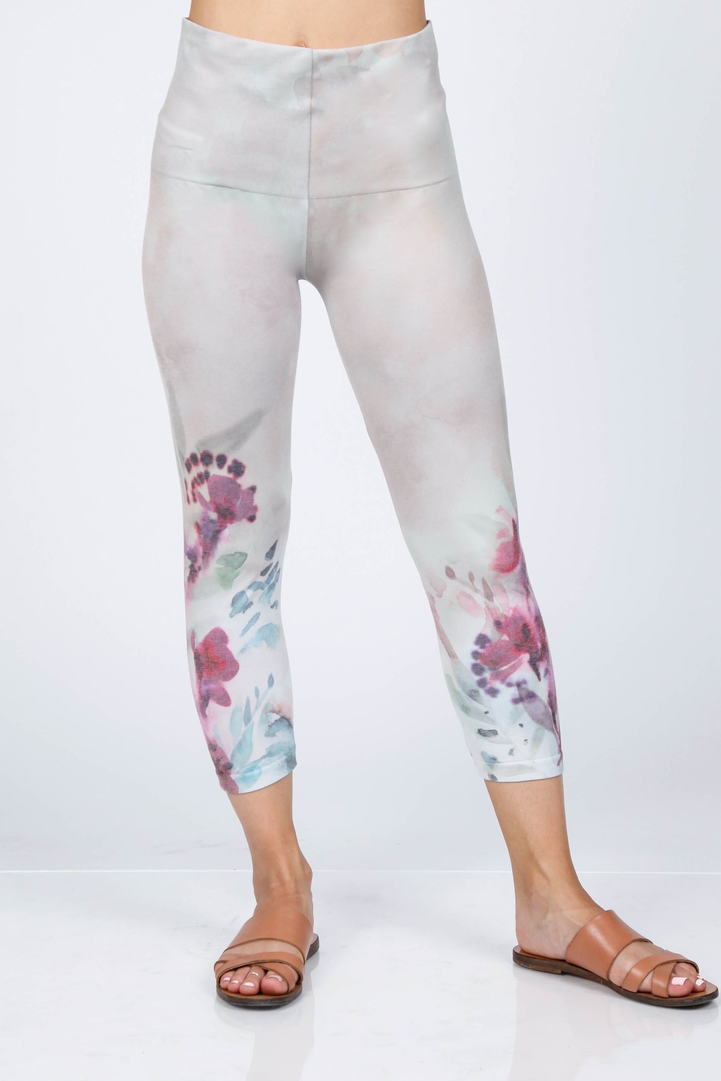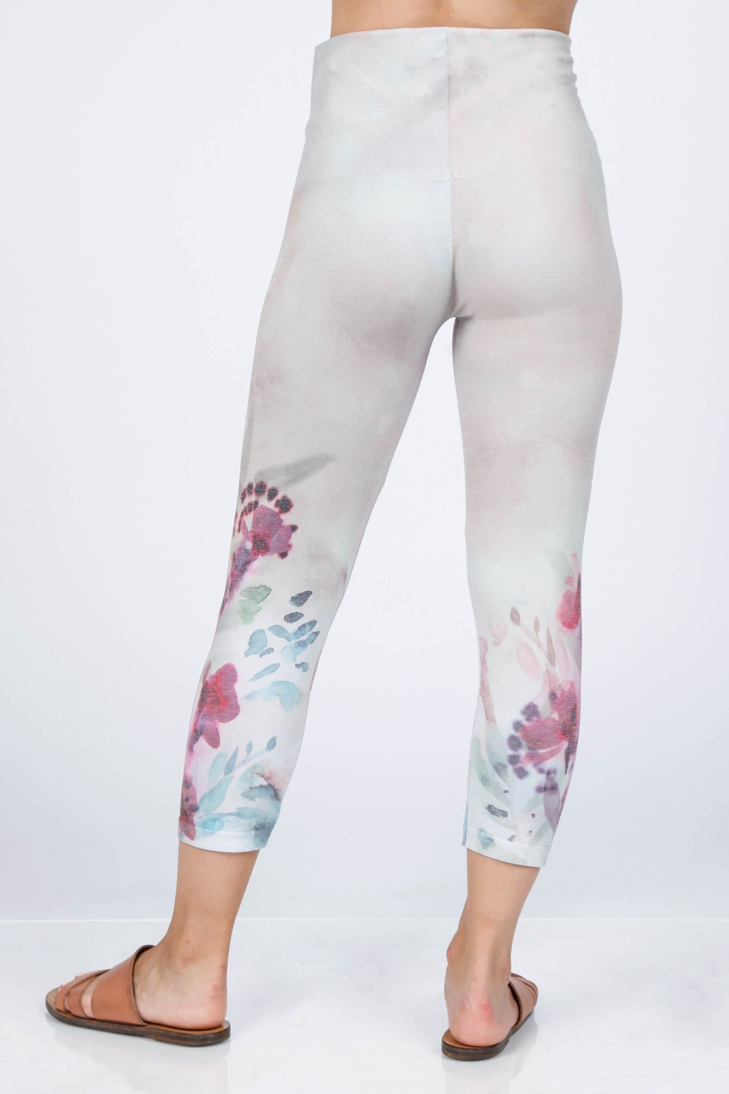 These high waist leggings are cropped & feature the iconic M.Rena tummy control waistband and a subtle watercolor floral design.