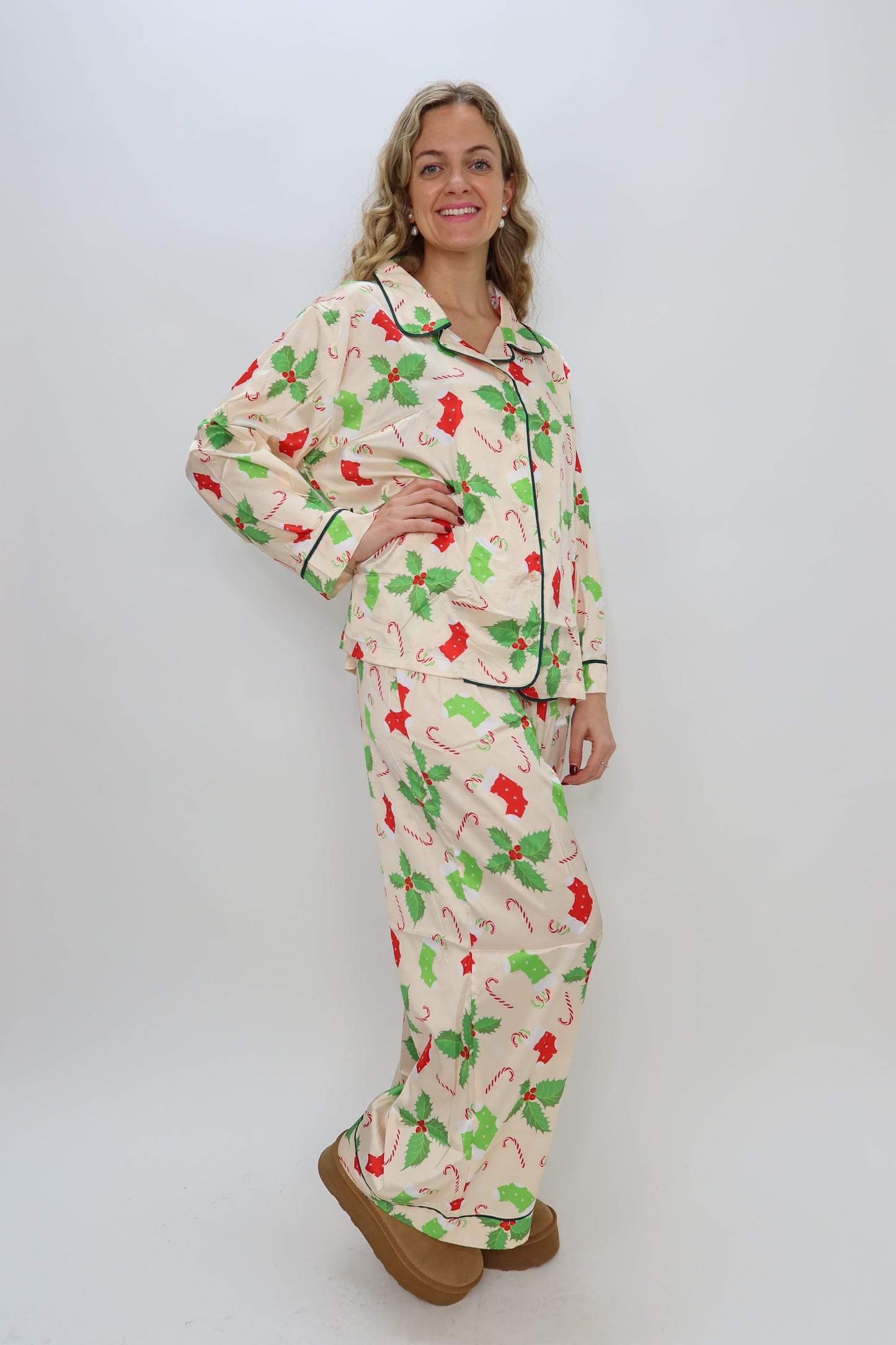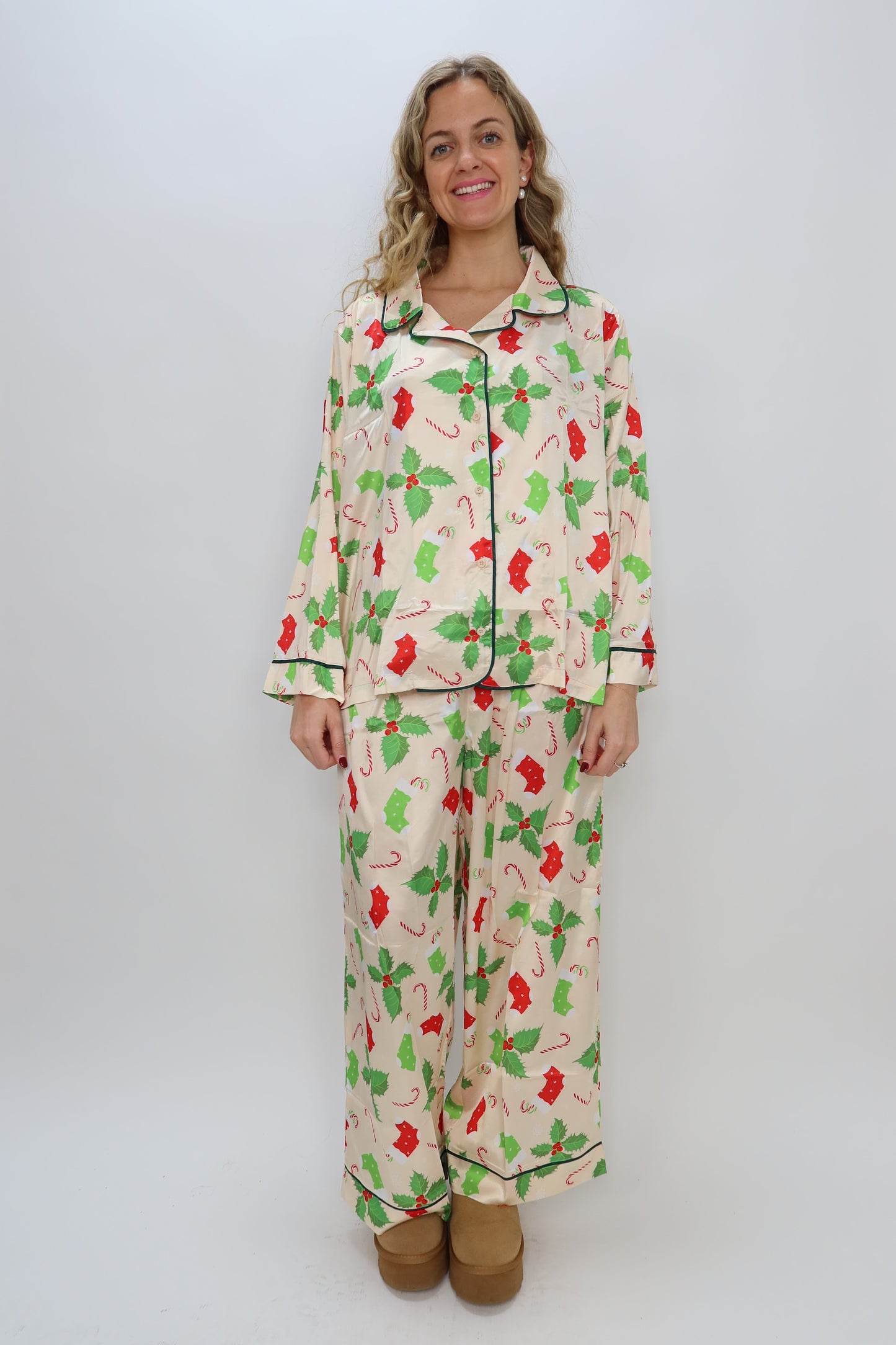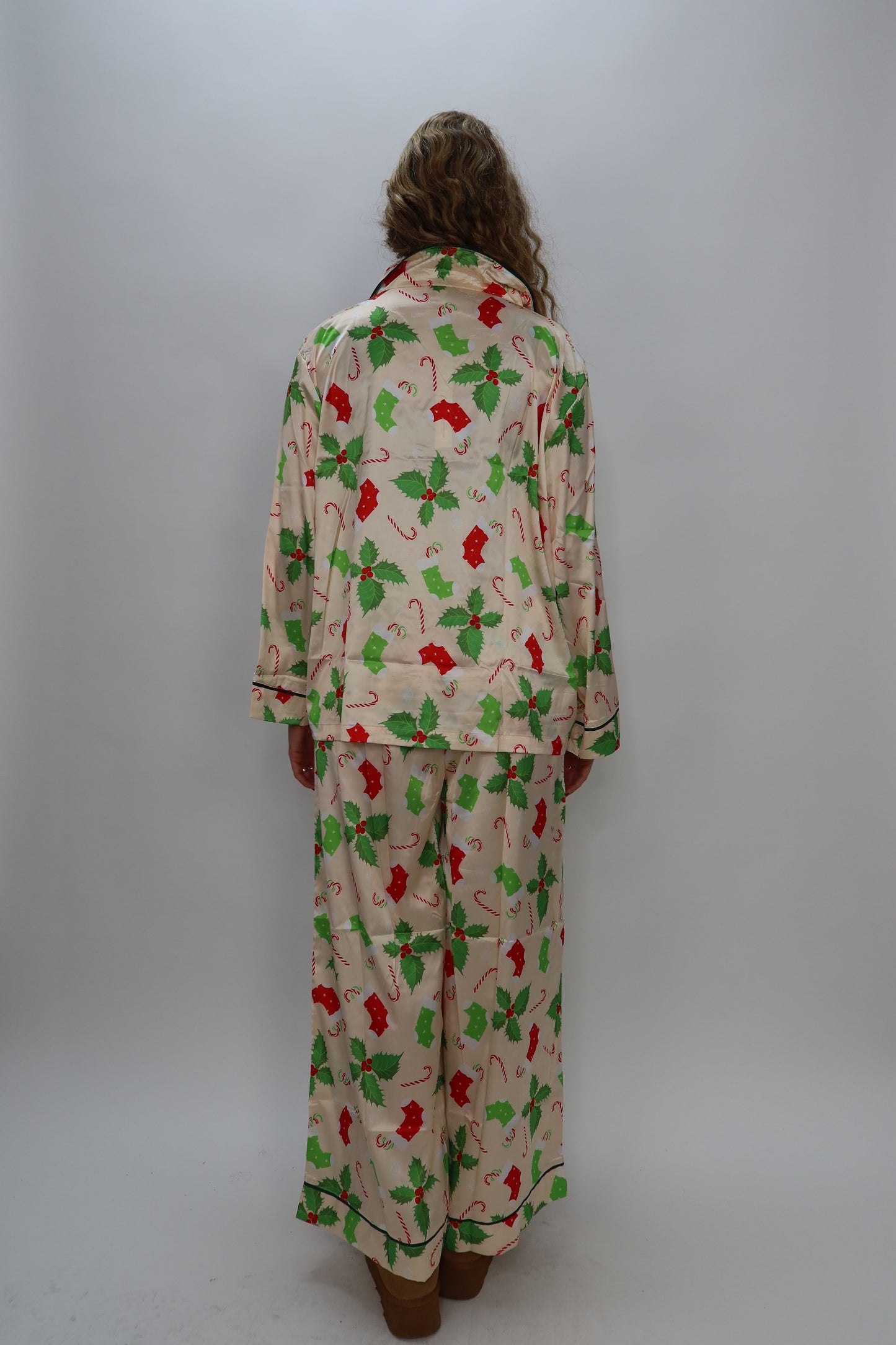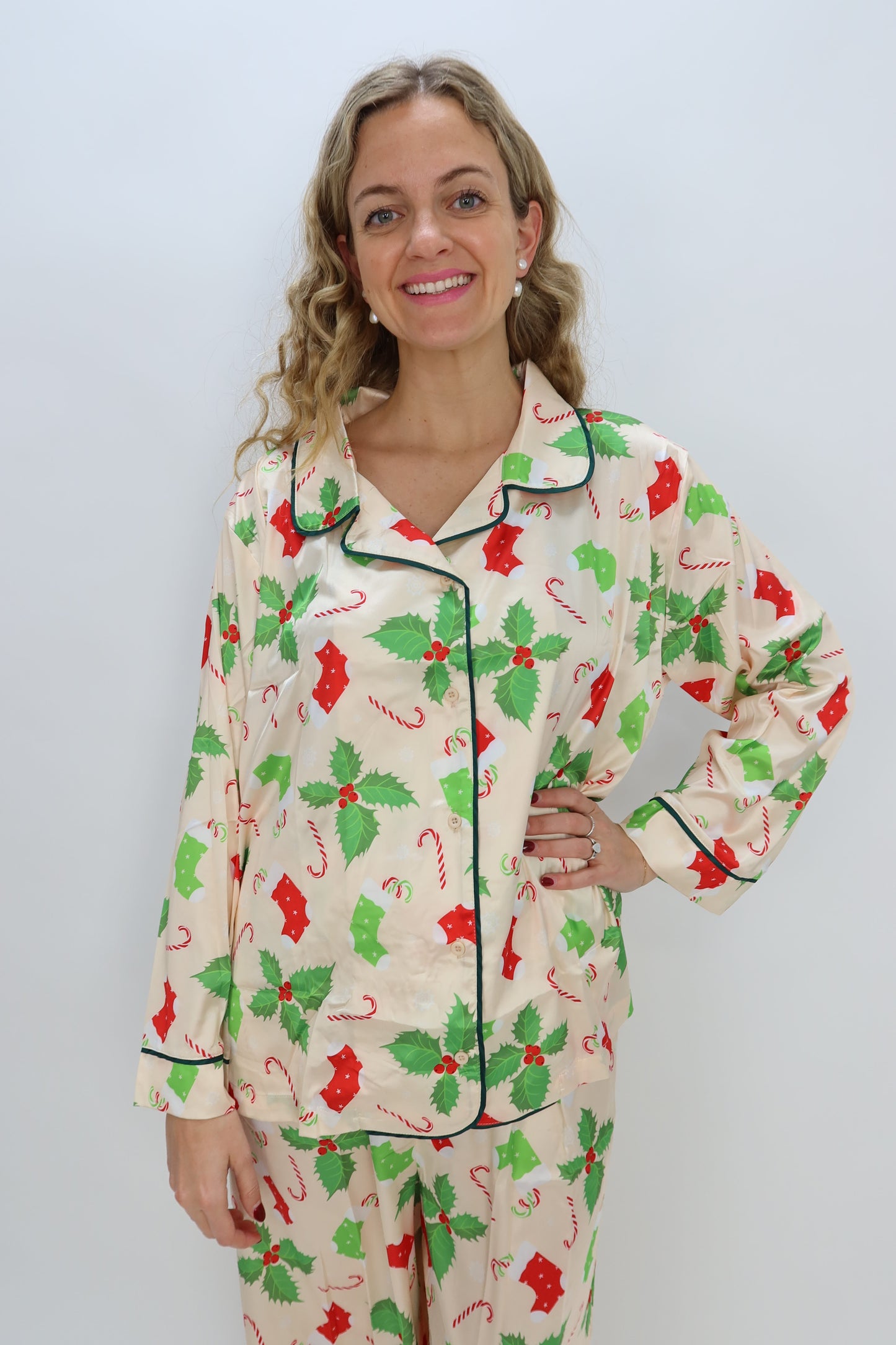 Experience festive comfort with this Cream Christmas Candy Cane Long Sleeve Button Down Silk Lounge Top. Crafted from silky soft fabric, it feels gentle against your skin while adding a cheerful pop to your holiday wardrobe. The playful pattern brings seasonal spirit to your loungewear, making it perfect for cozy winter days and holiday gatherings. Elevate your comfort and style this season with this elegant yet fun button-down pajama top!
