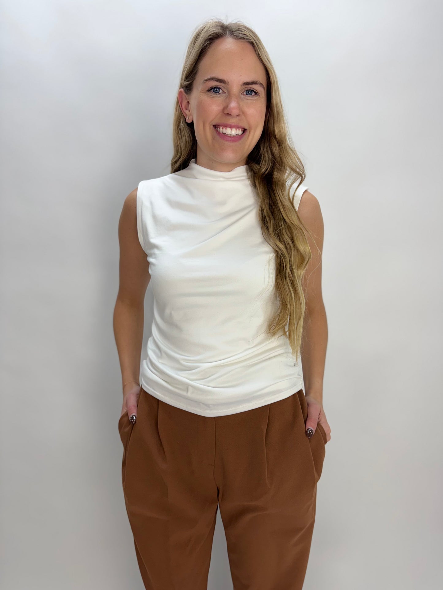 White Cotton Raw Edge Cowl Neck Hi-Low Top