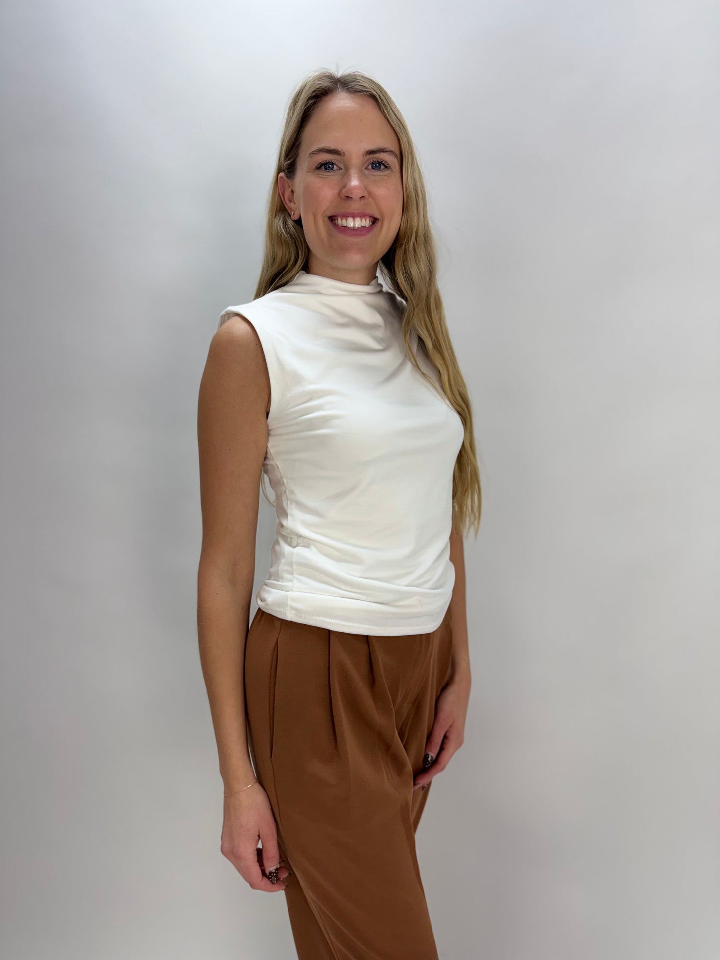 White Cotton Gauze Short Sleeve Top With Cowl Neck