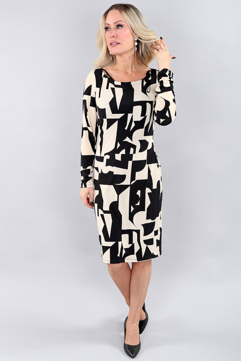 Black and Cream Printed Double Lined Long Sleeve Dress