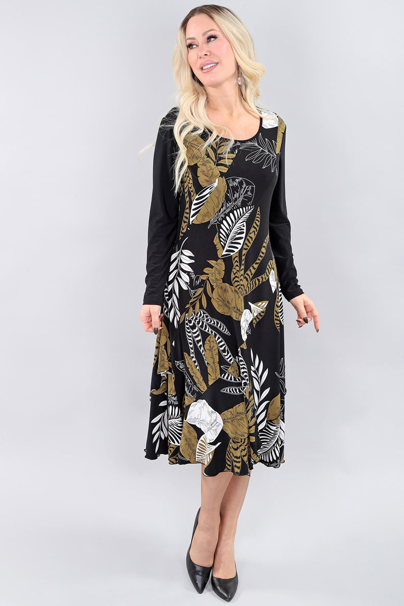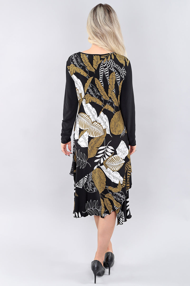 Black and Olive Leaves Printed Ruffle Long Sleeve Dress