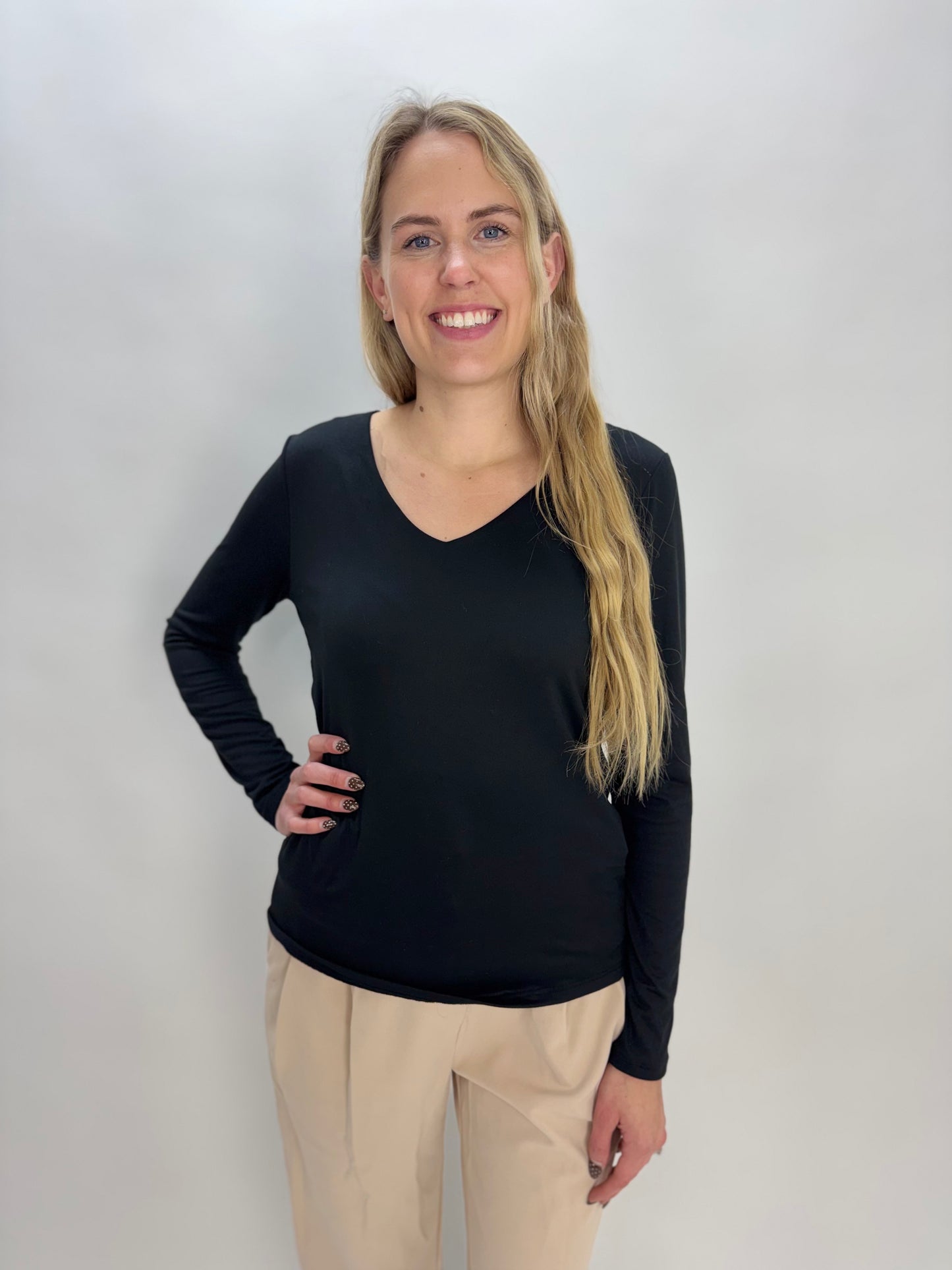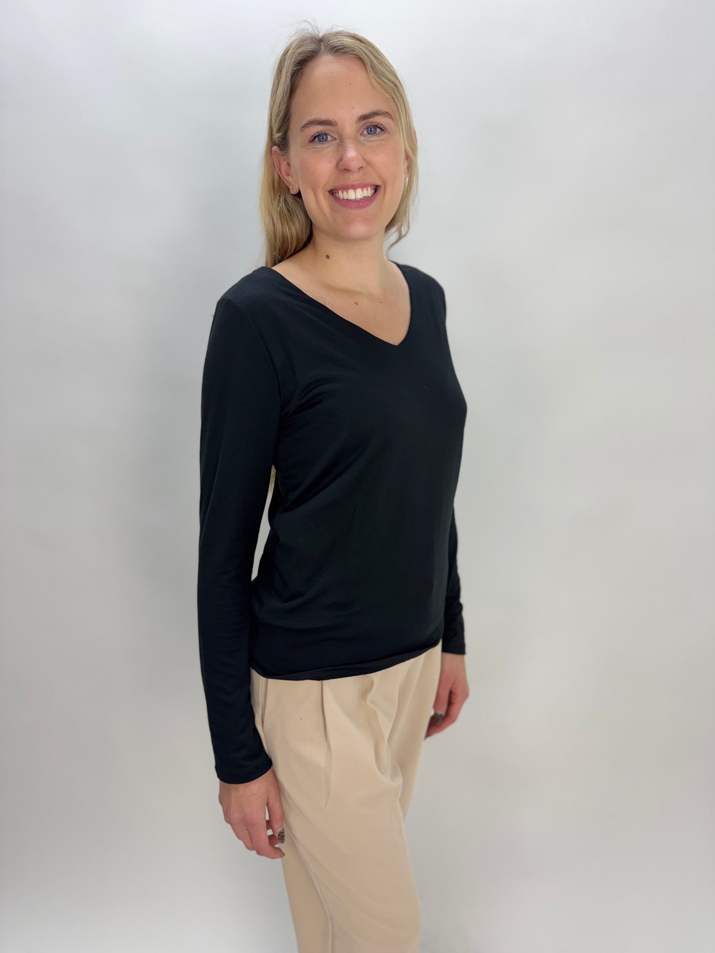 Black Modal Double Layered V Neck Long Sleeve Top