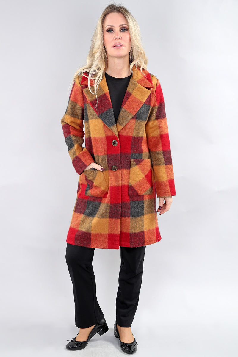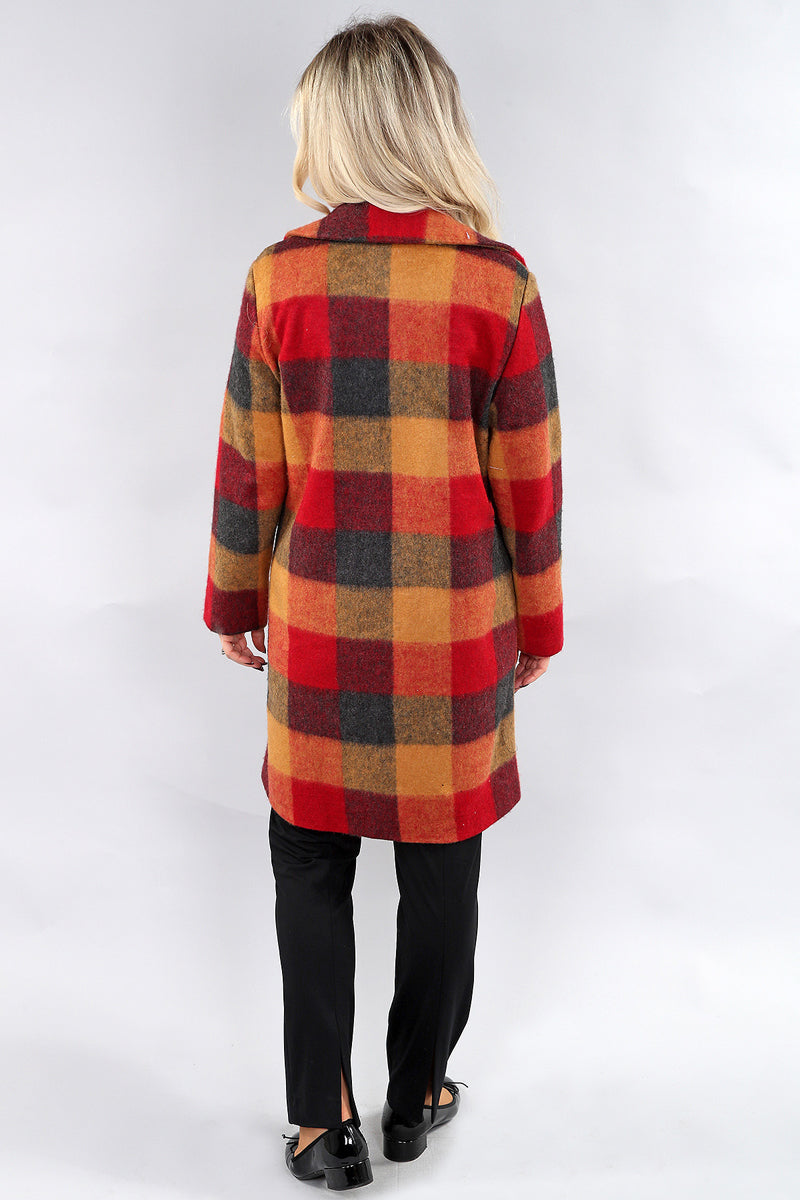 Gold and Red Plaid Long Sleeve Collared Two Pocket Coat