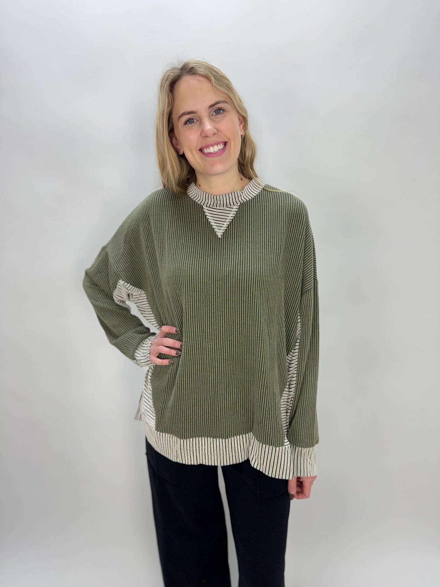 Olive Green Long Sleeve One Pocket Ribbed Top
