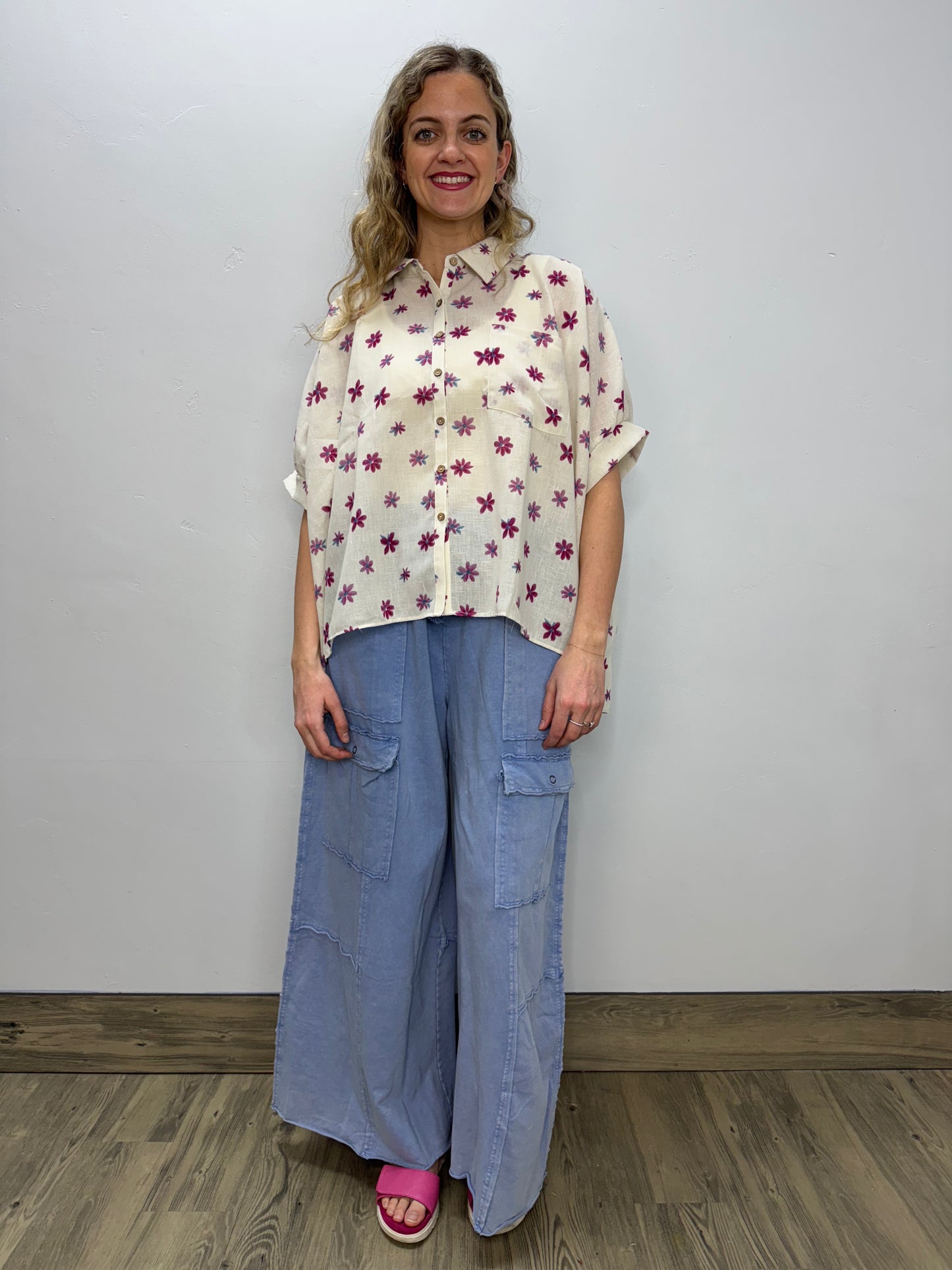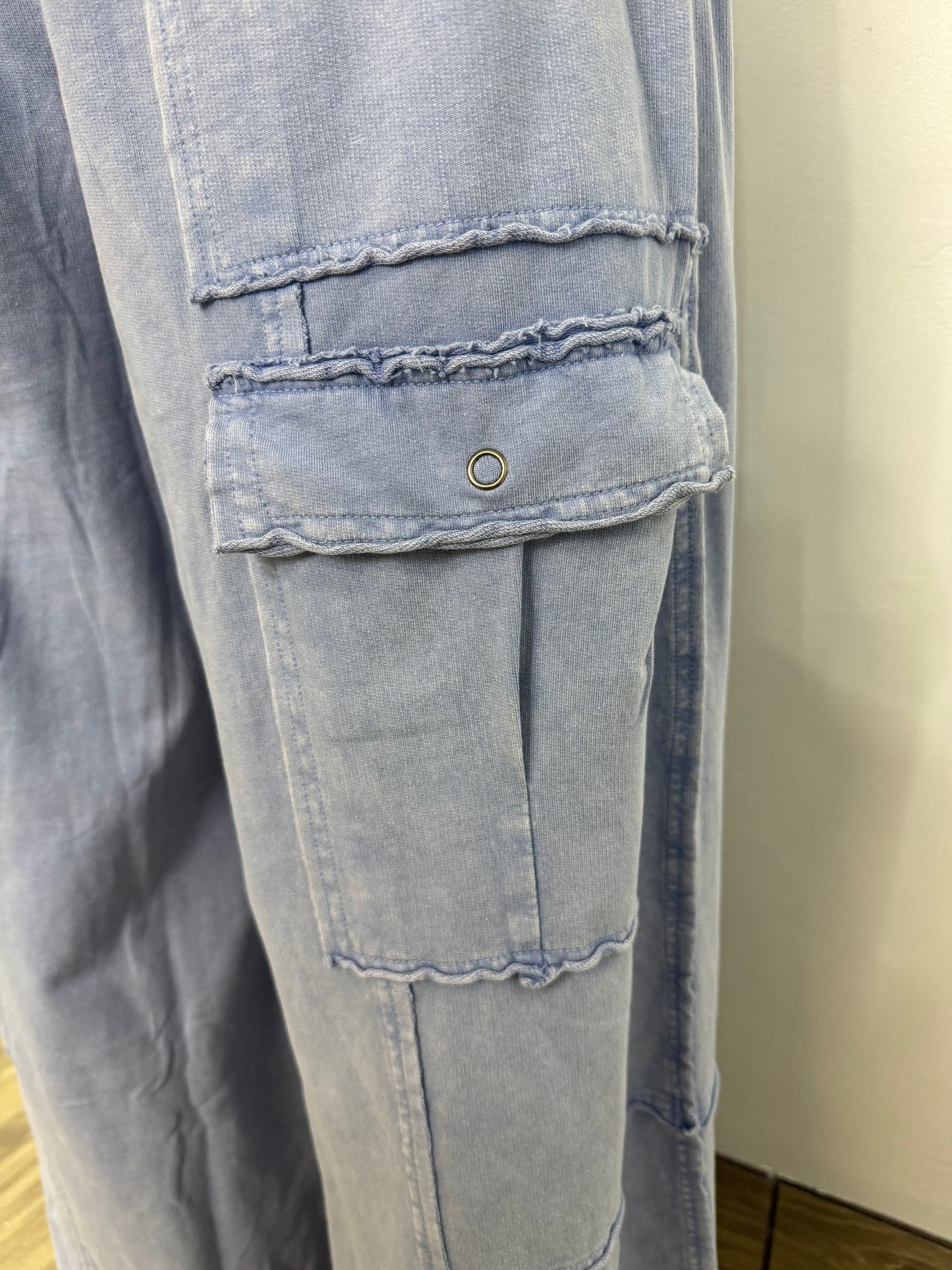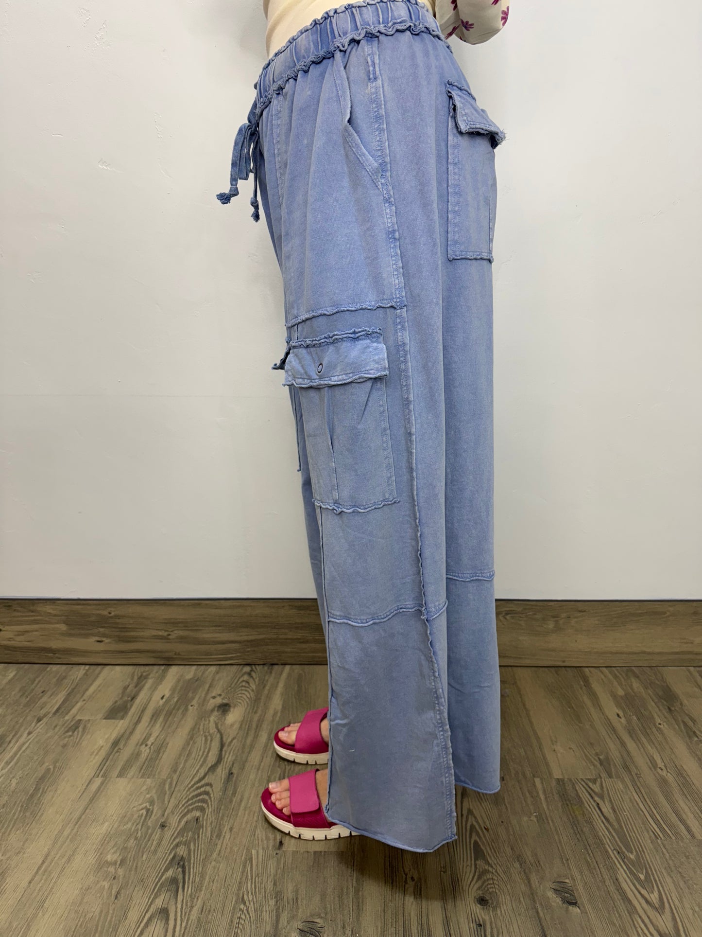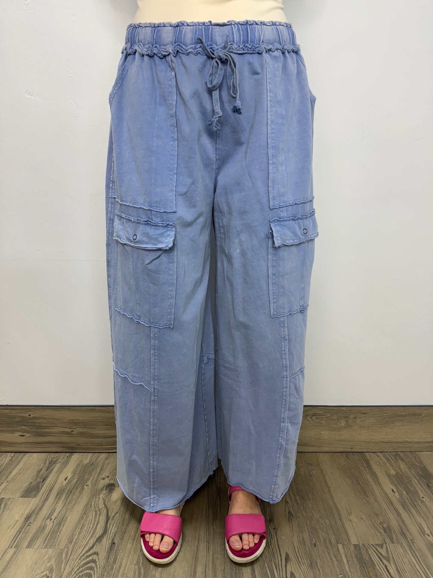Effortlessly chic with a touch of practicality, our Blue Mineral Wash Wide Leg 100% Cotton Cargo Pant features a comfortable, slouchy silhouette and multiple pockets to keep your essentials close at hand. The drawstring elastic waistband and raw hem add a laid-back touch to the wide leg design. Elevate your style game with these must-have pants!