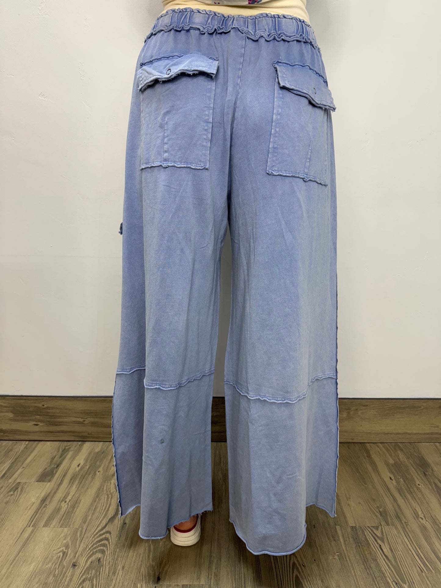 Blue Mineral Wash Wide Leg Cotton Cargo Pant