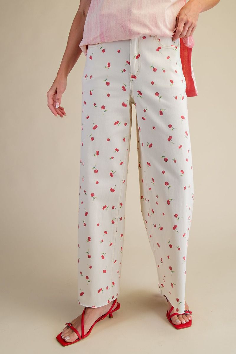 Cherry Printed Frayed Cream Jean