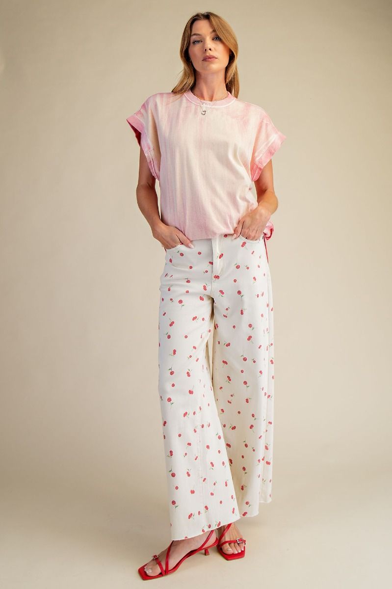 These high-waisted, cream wash jeans feature a fun and playful all-over cherry print. With a classic five pocket design, straight wide leg fit, and stretch twill fabric, these pants offer both style and comfort. Complete with a button and zipper fly closure and belt loops, these jeans are a must-have for any fashion-forward wardrobe!