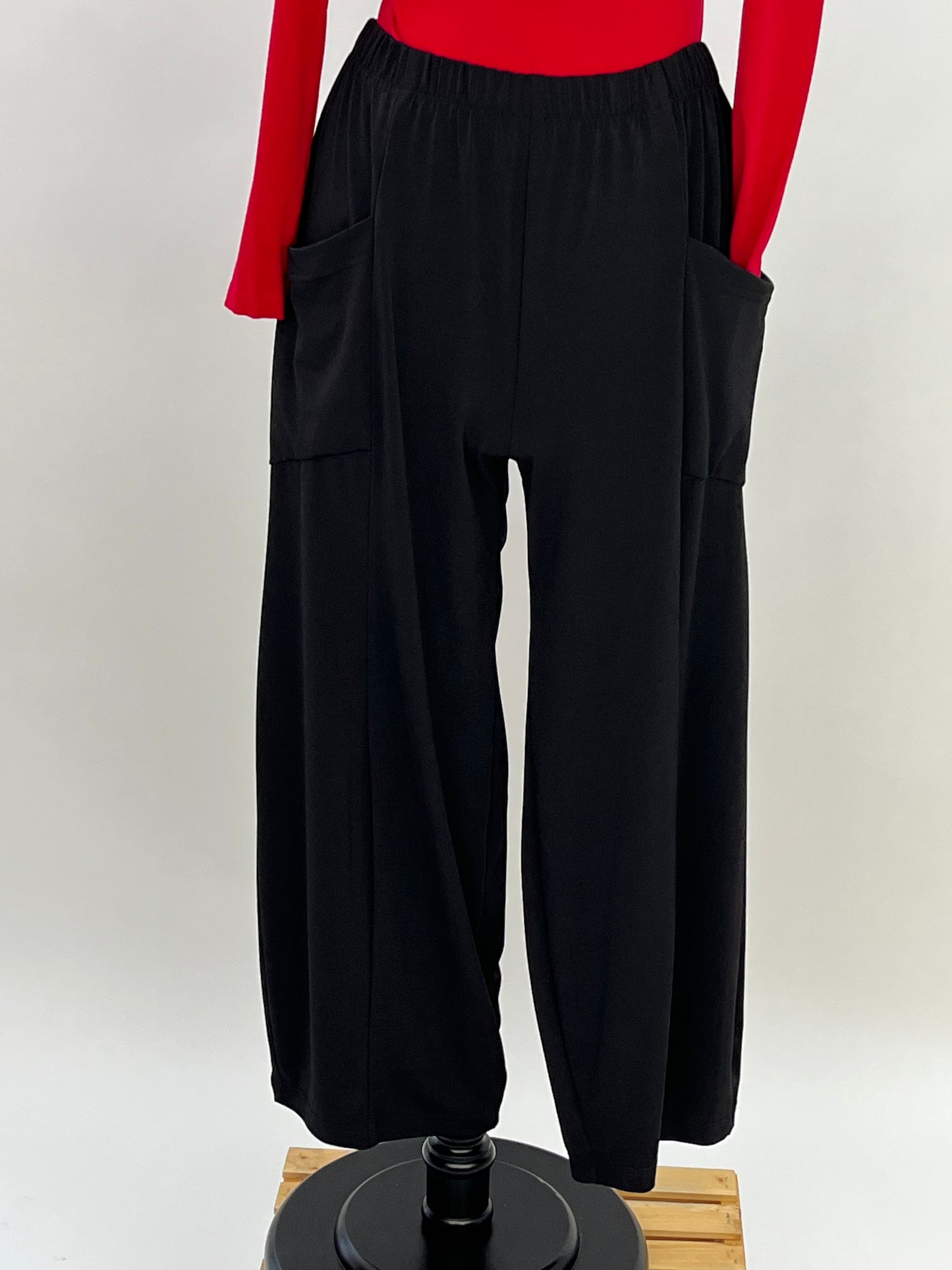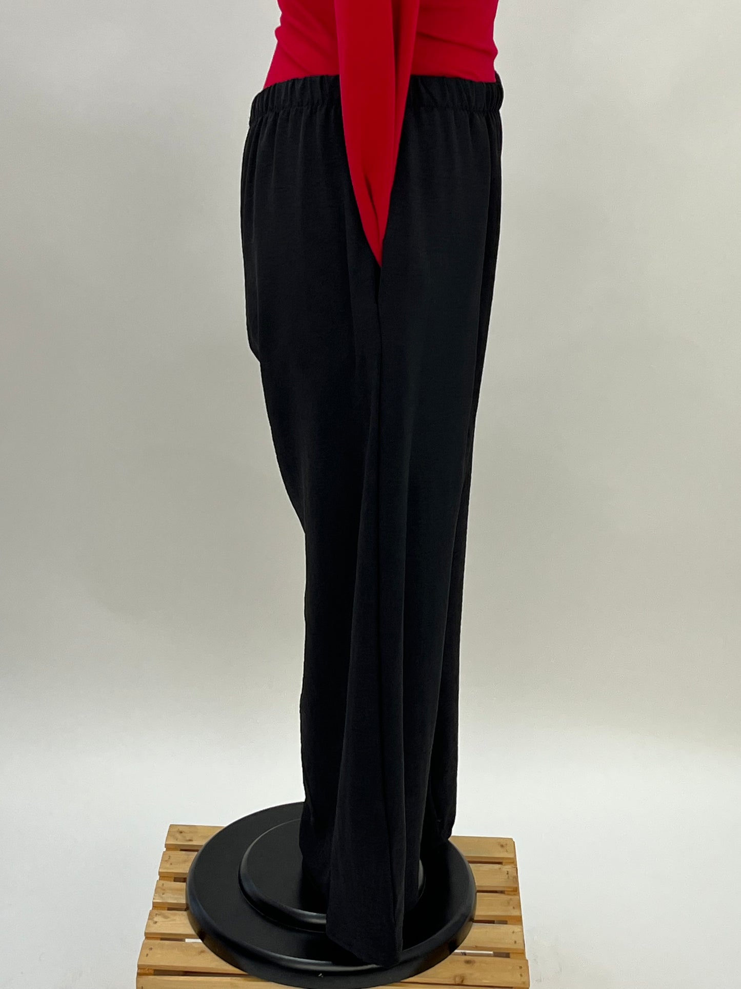 This black pant from Sydney Project is perfect for your everyday pant to the office, to an event, or just out and about. It is super comfortable with an elastic waist band and two front pockets. It is a full length pant that has a strait fit to it.