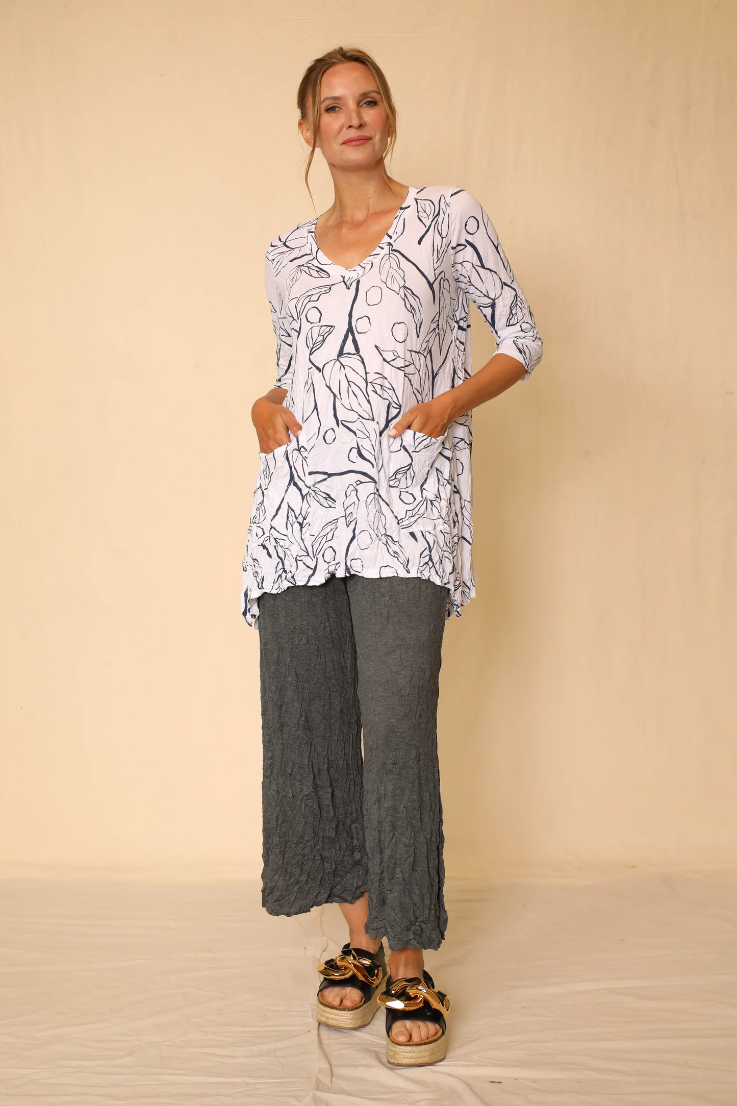 This Larshell crinkle pant showcases deep side slits at the hem, offering a stylish and comfortable fit. Crafted with an elastic waistband and a blend of 50% Bamboo Cotton and 50% Recycled Poly, it is ideal for any journey without the worry of wrinkling. To ensure the best preservation of the garment, hand wash cold and lay flat to dry. Proudly made in the U.S.A.