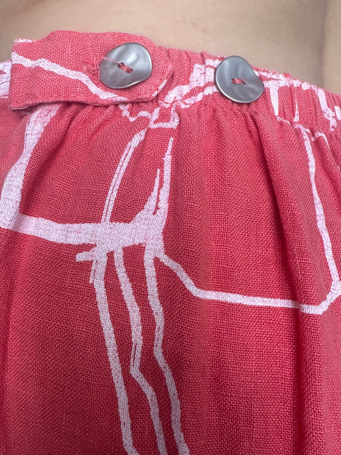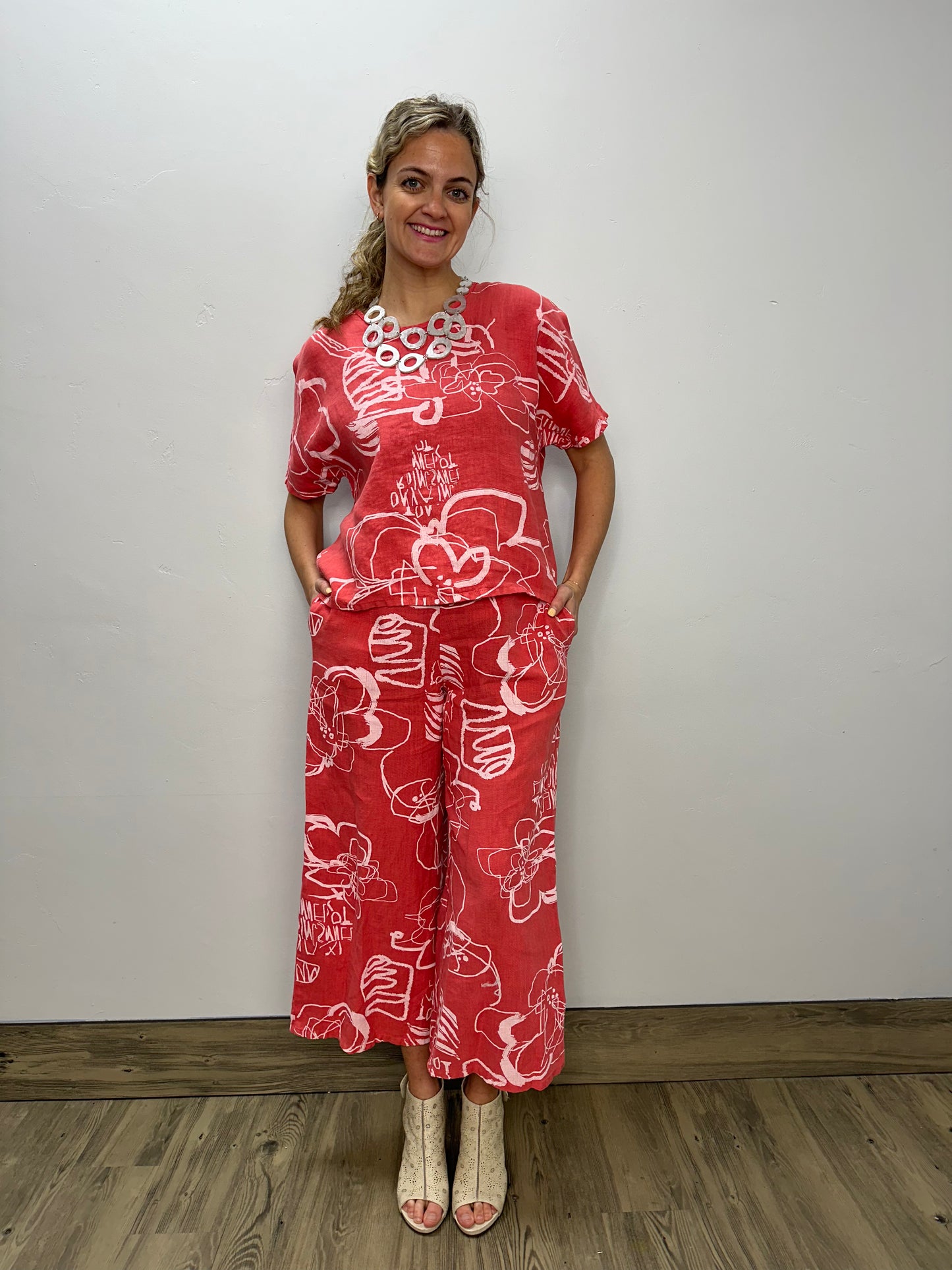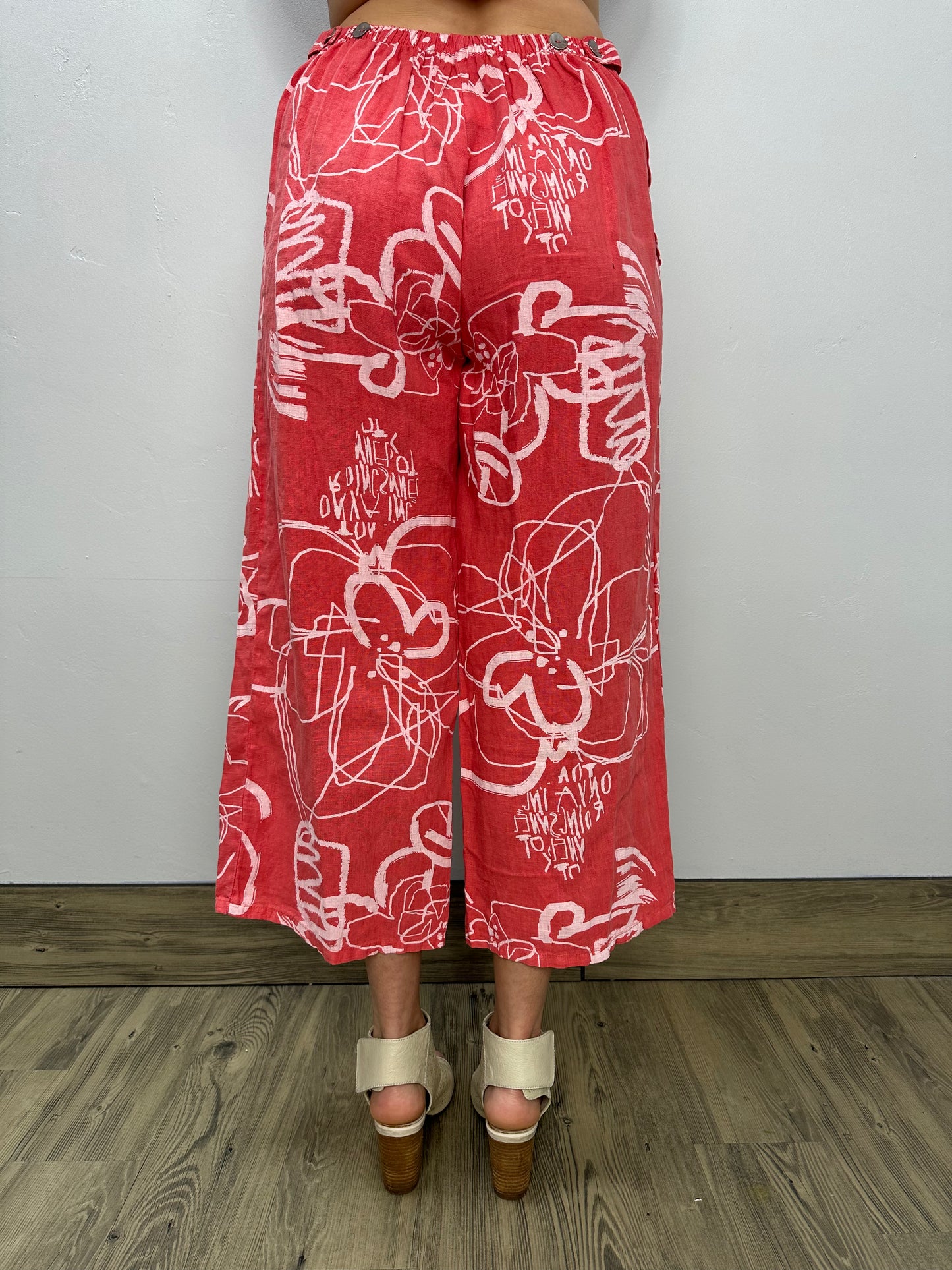 Melon Scribbles Print Linen Flat Front Crop Pant with Adjustable Waist