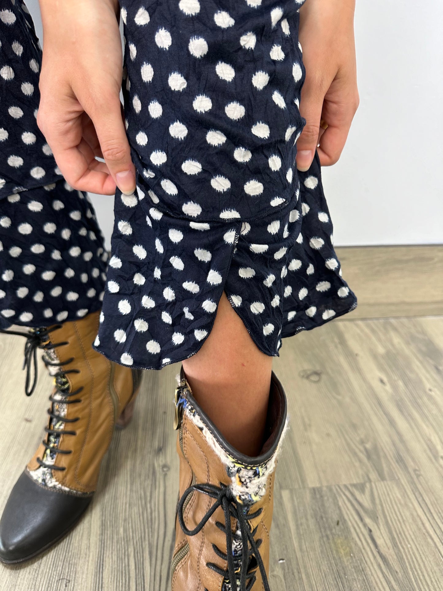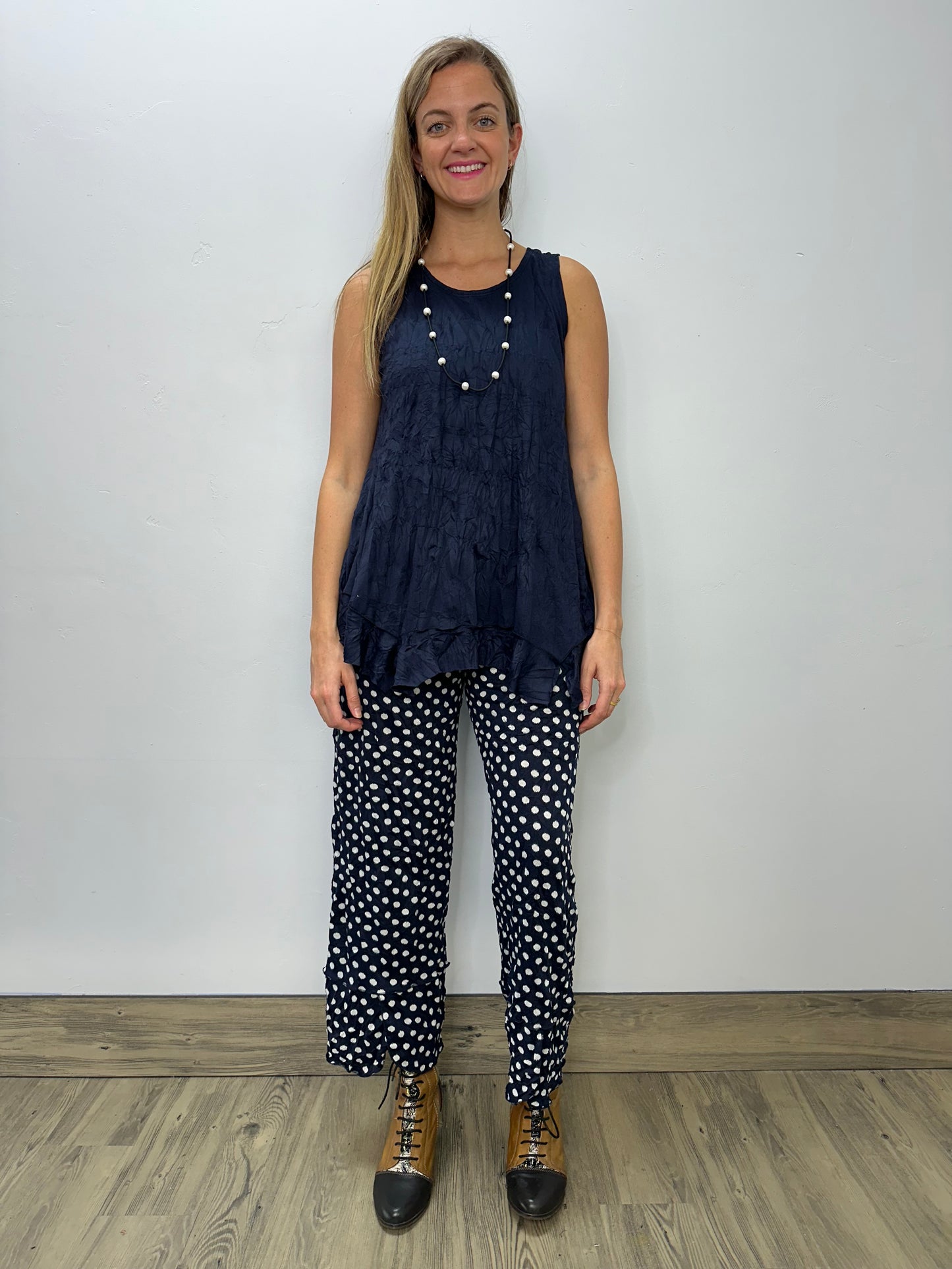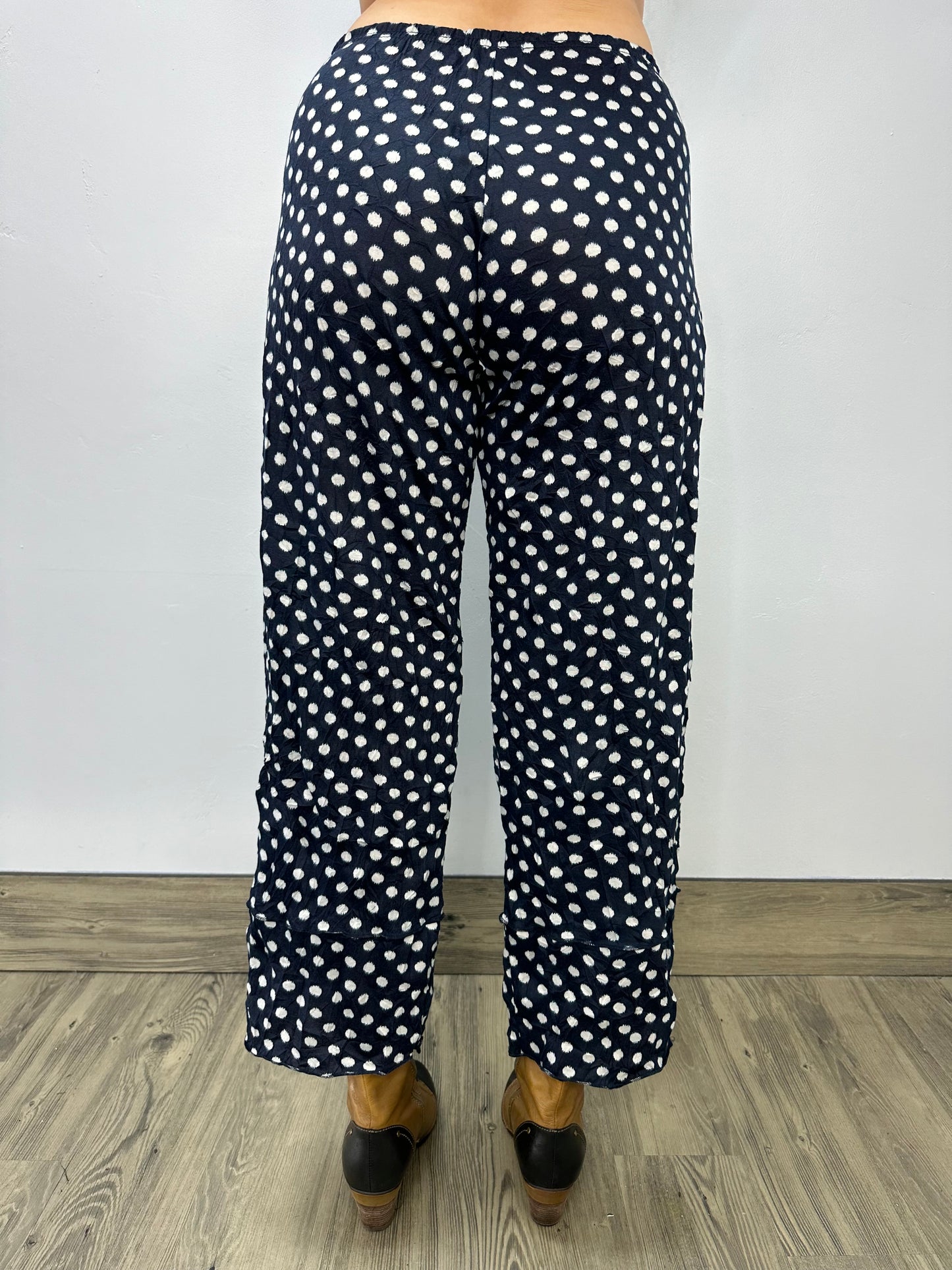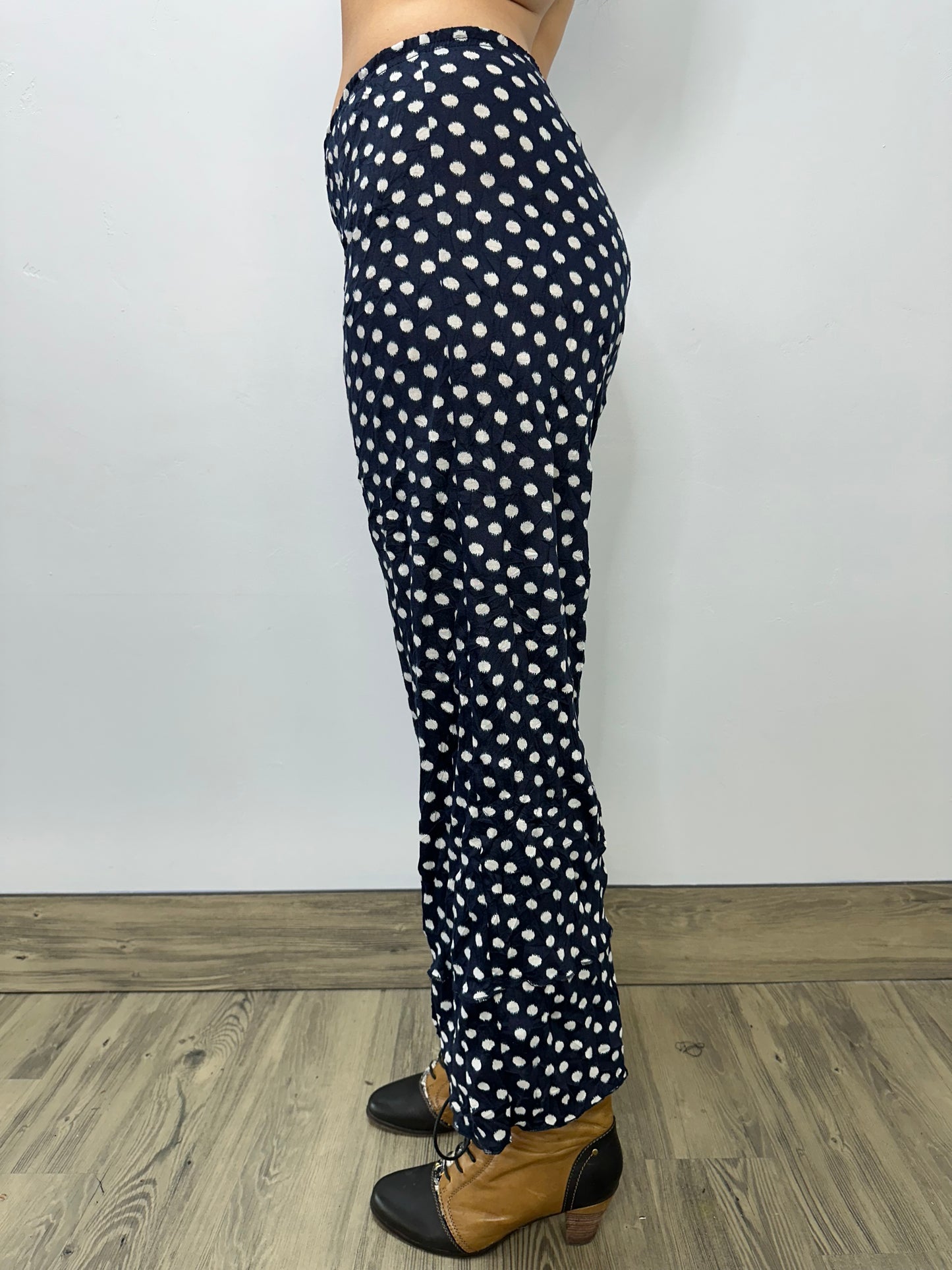 Regular price $62.30Unleash your inner fashionista with our Vine Street Navy Crinkle Dots Full Length Pant! The long crinkle mesh pant features an elastic waistband for comfort and a flattering tiered hem. The front notch adds a touch of unique style. Perfect for any occasion, this pant is a must-have for your wardrobe and pairs perfectly with other Vine Street pieces!