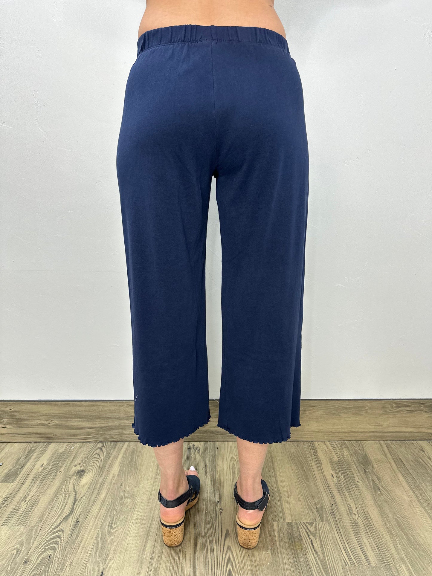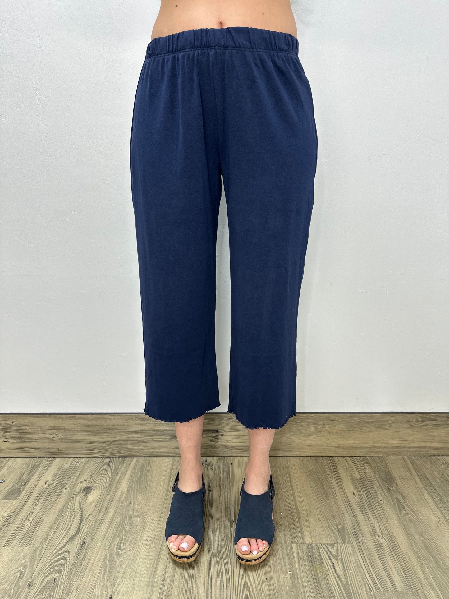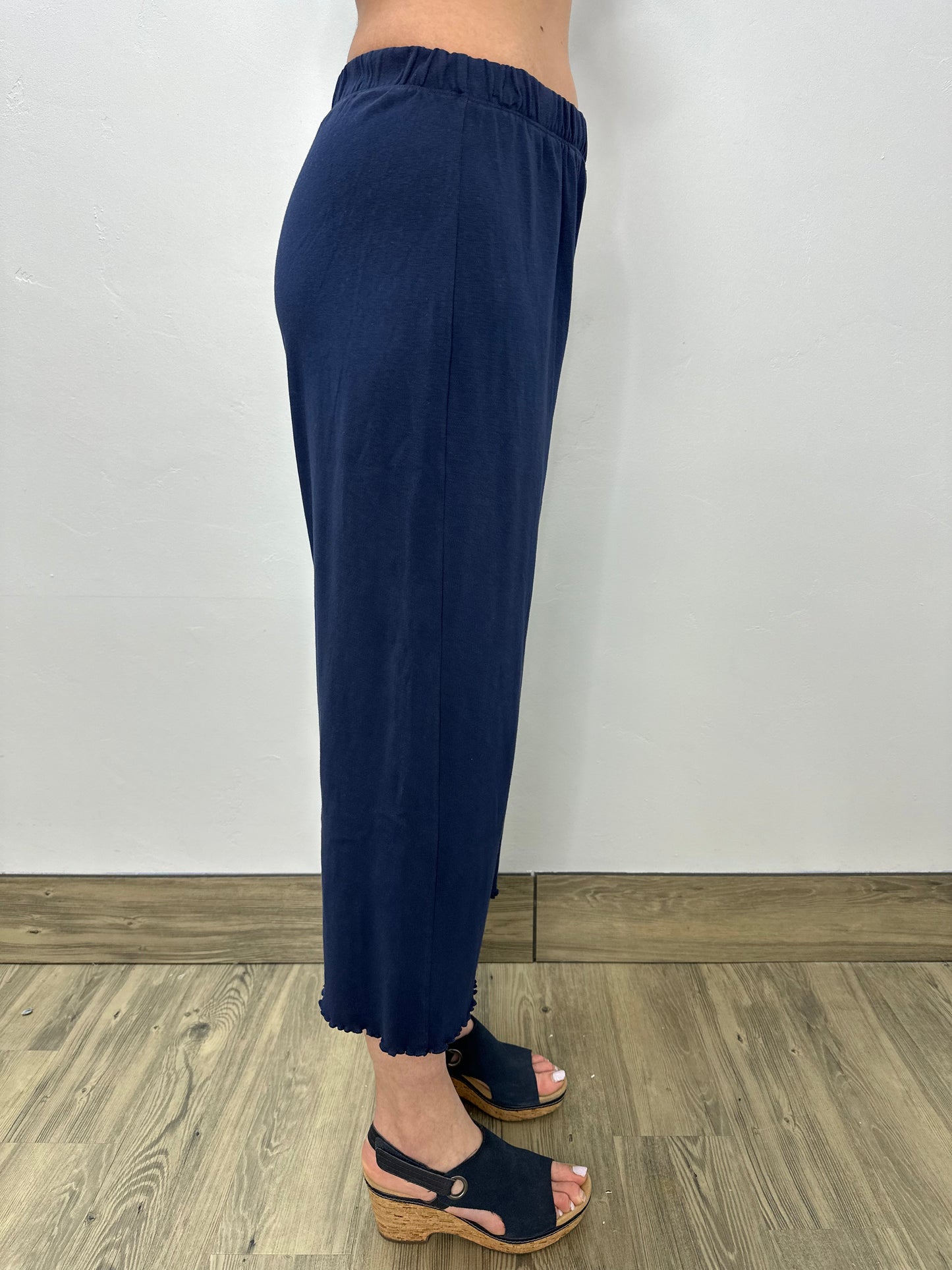 Elevate your style with our Navy Lettuce Edging Crop Pants! Featuring a charming lettuce edging, this crop cut pant is perfect for any occasion. The solid white color adds a touch of elegance to any outfit. Say goodbye to boring pants and hello to effortless chic!