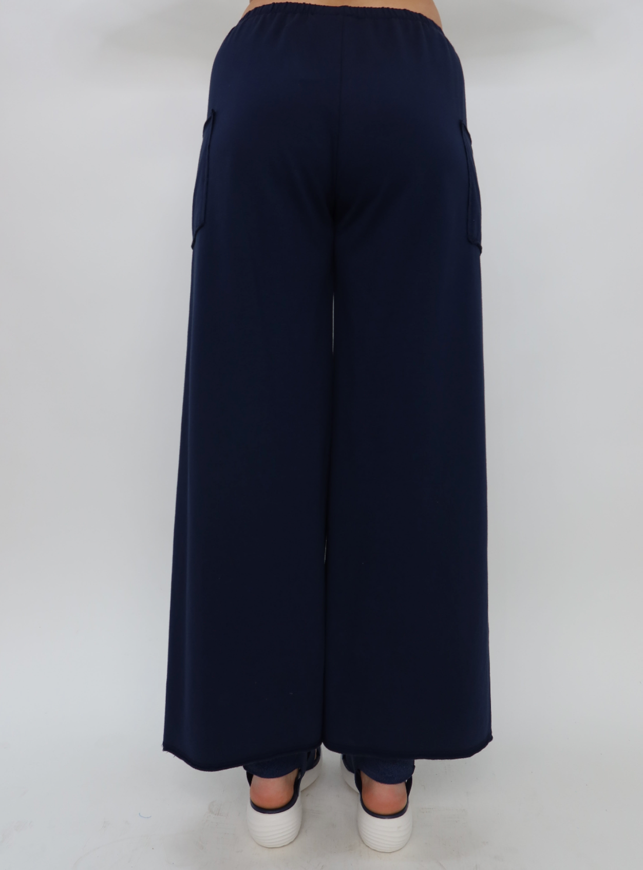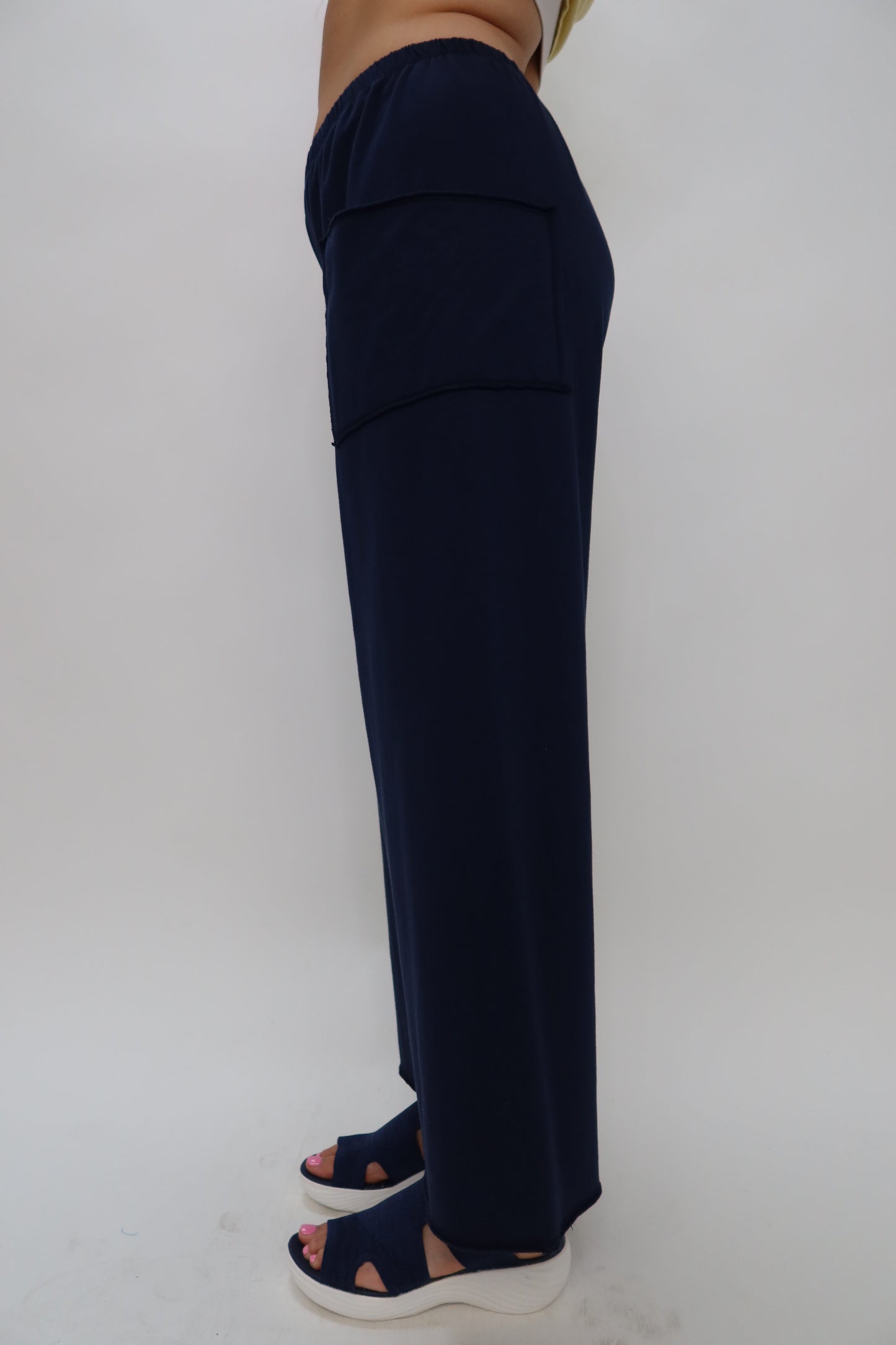 Our navy pants combine comfort and style effortlessly. Featuring an elastic waistband for a perfect fit and convenient side seam pockets, they are ideal for everyday wear. Their flattering long length adds a trendy touch, making them a versatile addition to your wardrobe.