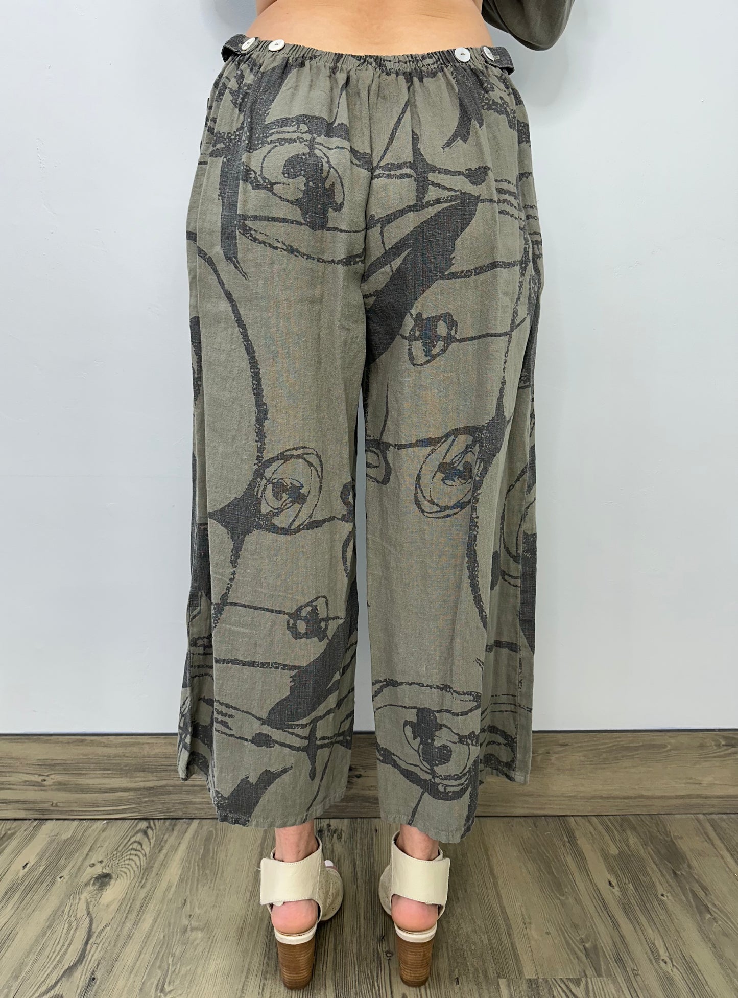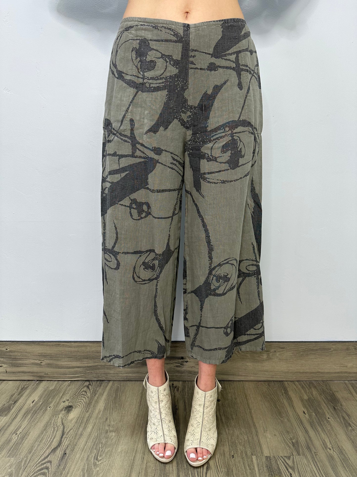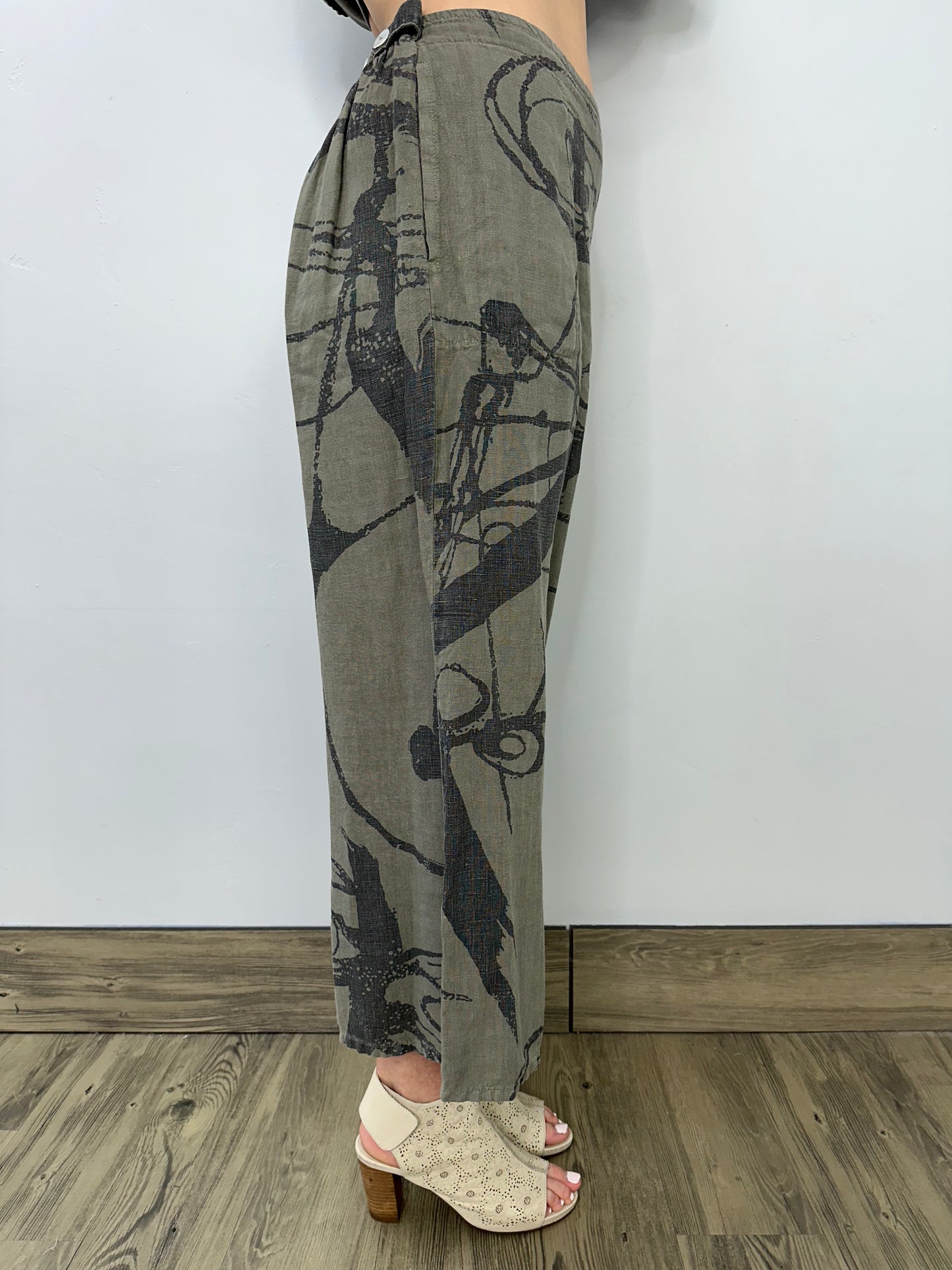 Olive Brush Strokes Linen Flat Front Crop Pant with Adjustable Waist