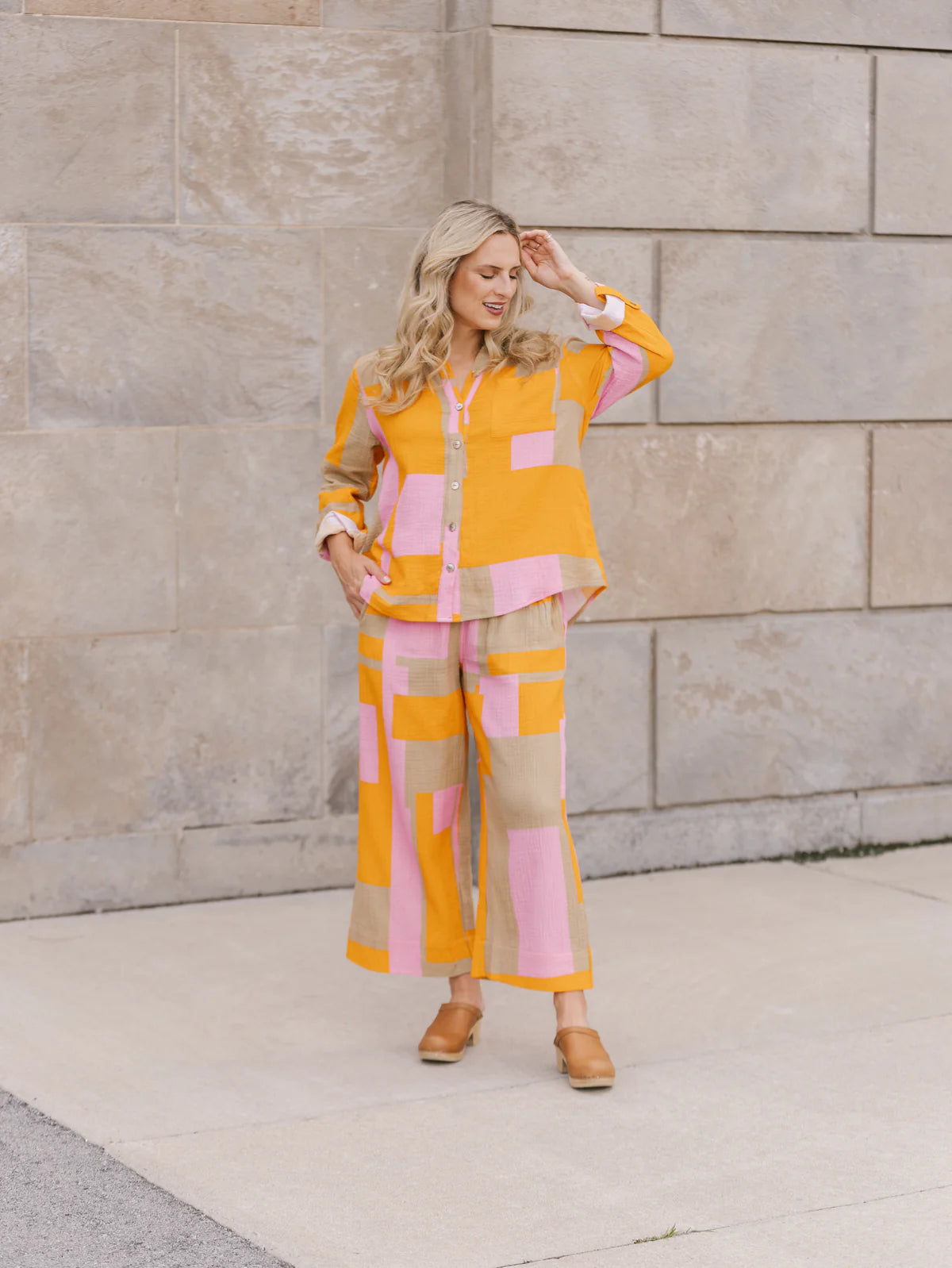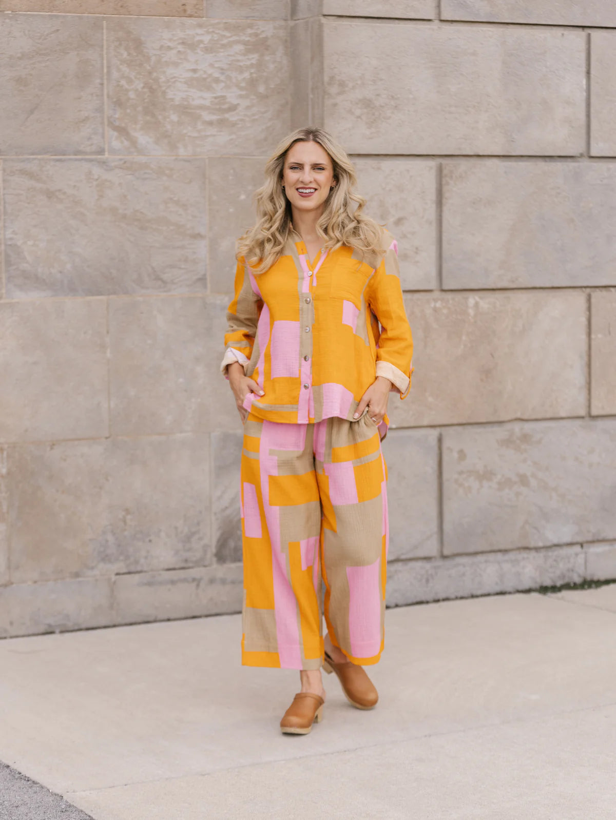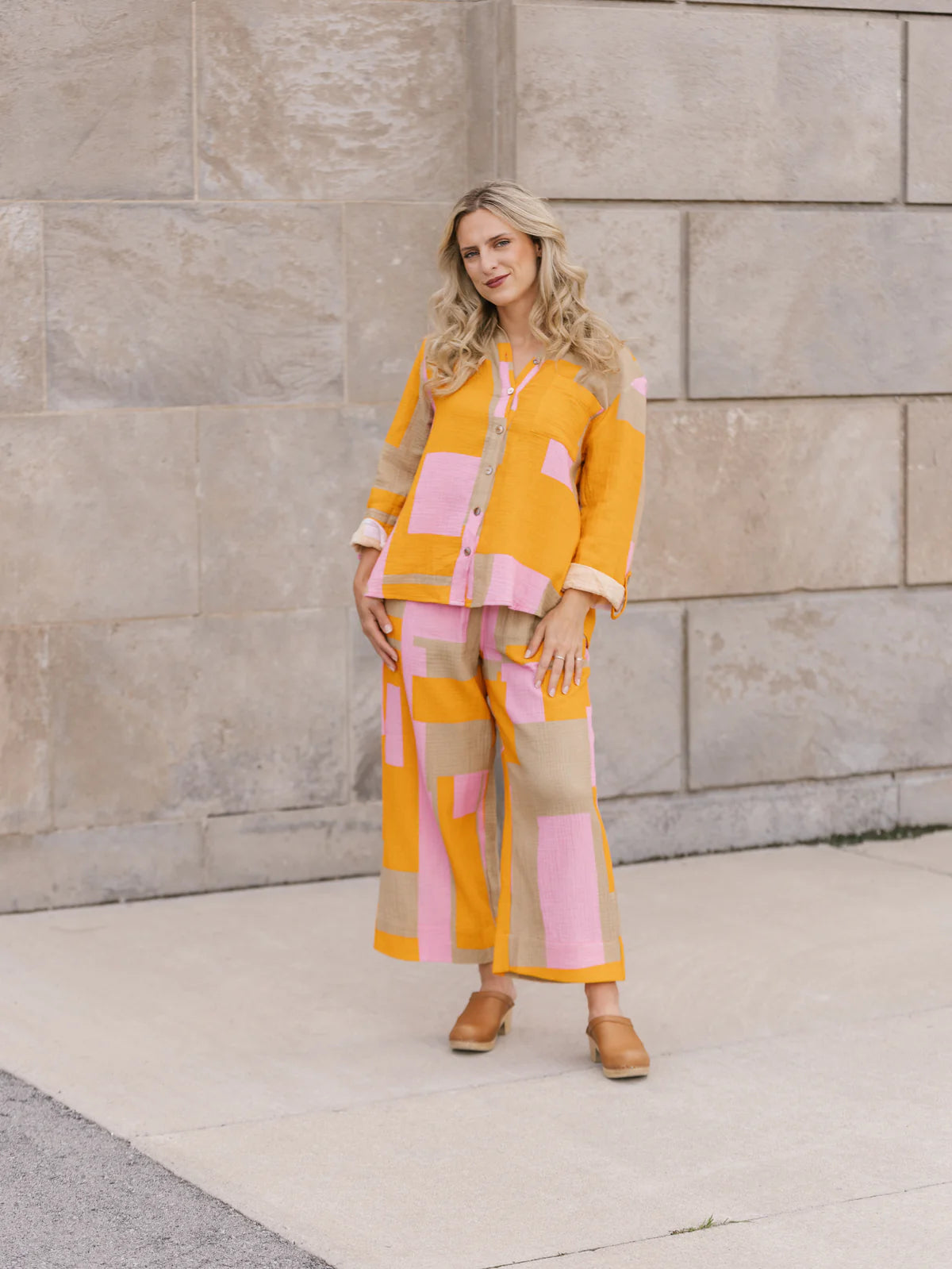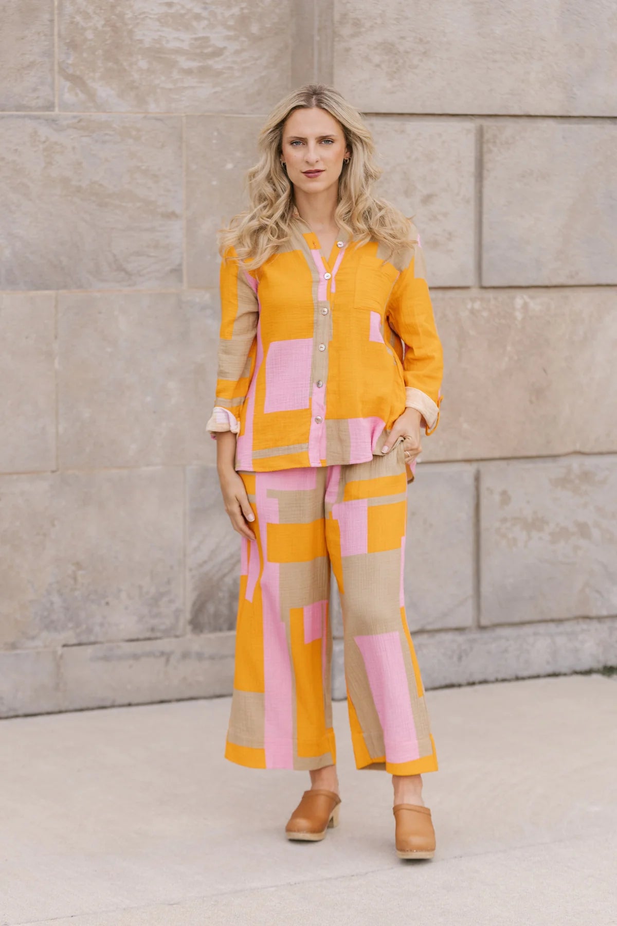 Orange Pink and Tan Cotton Gauze Crop Pants