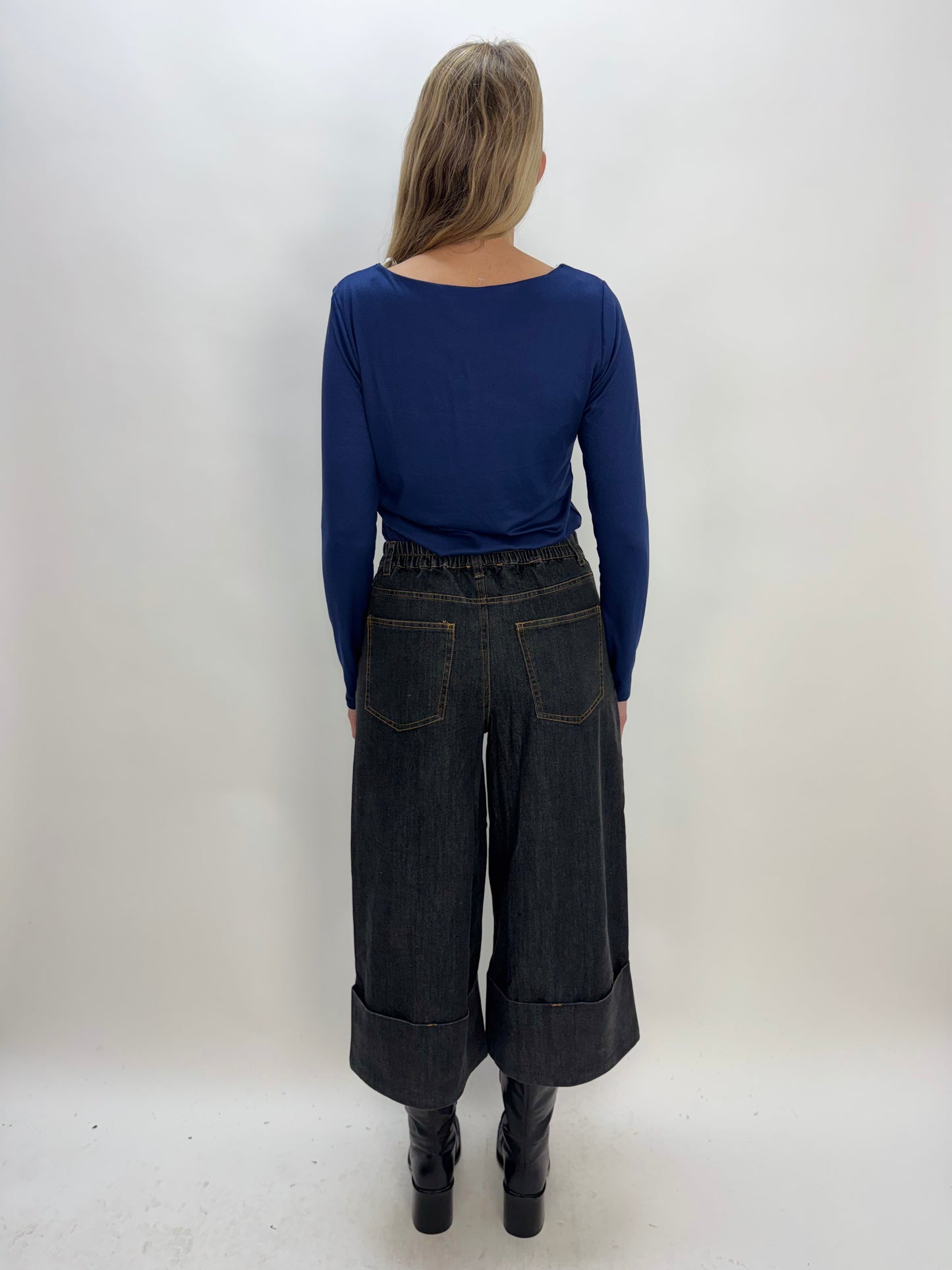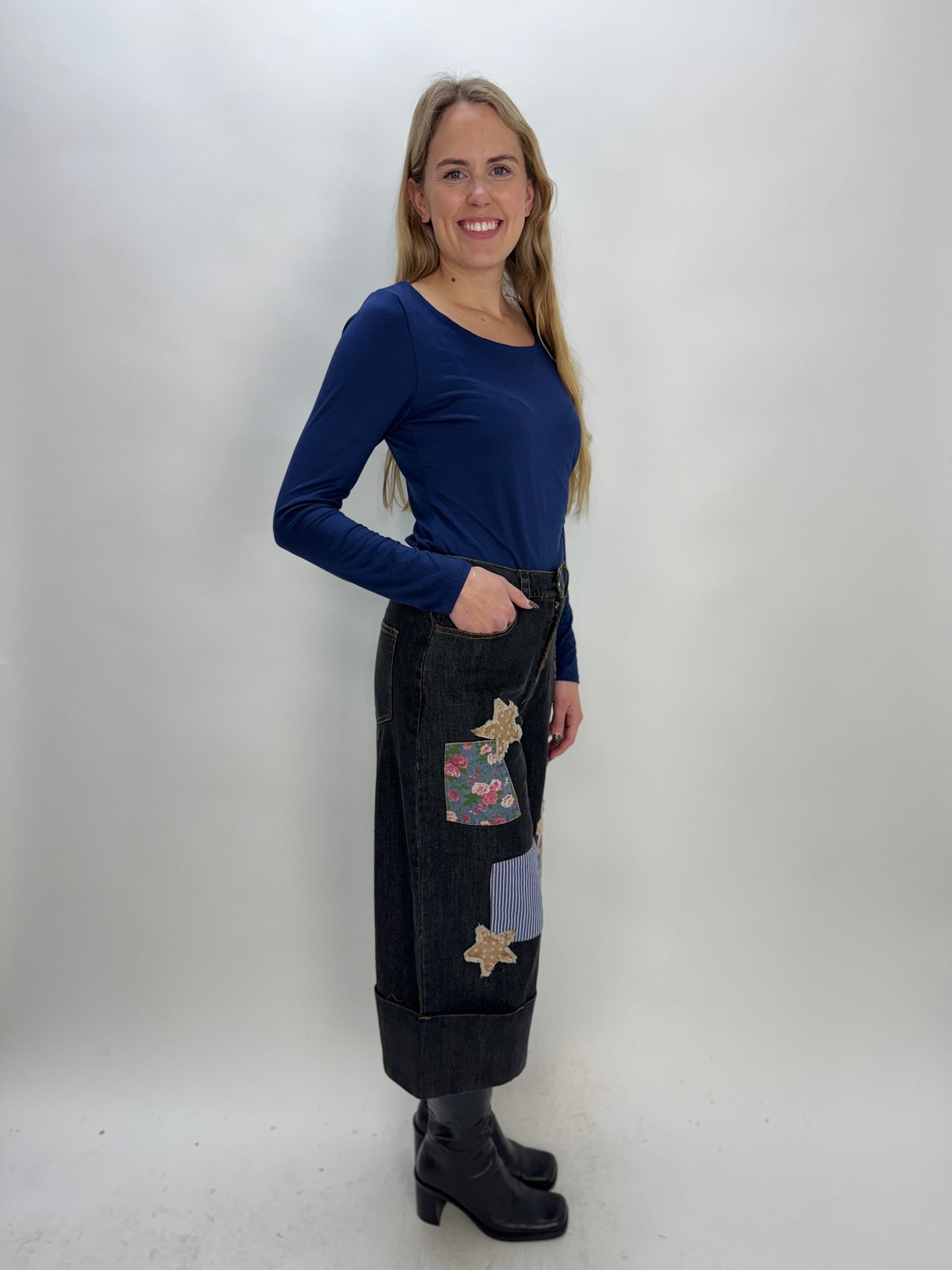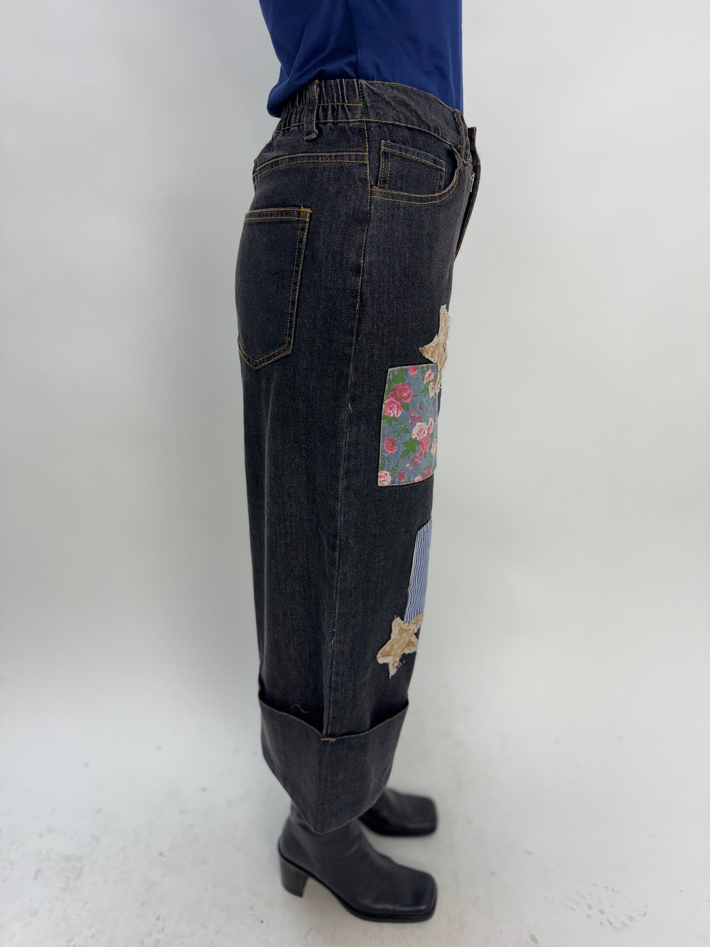 Elevate your denim game with these Patchwork Dark Denim Pants, featuring a trendy wide-leg, cropped silhouette that flatters every frame. The stretch denim moves with you for all-day comfort, while the eye-catching multi-patch design adds instant personality to your wardrobe. Practical details like the elasticized back waistband, belt loops, and zip fly with button closure ensure a secure, customizable fit. Perfect for styling with everything from sneakers to heels, these pants are the versatile piece you've been searching for.