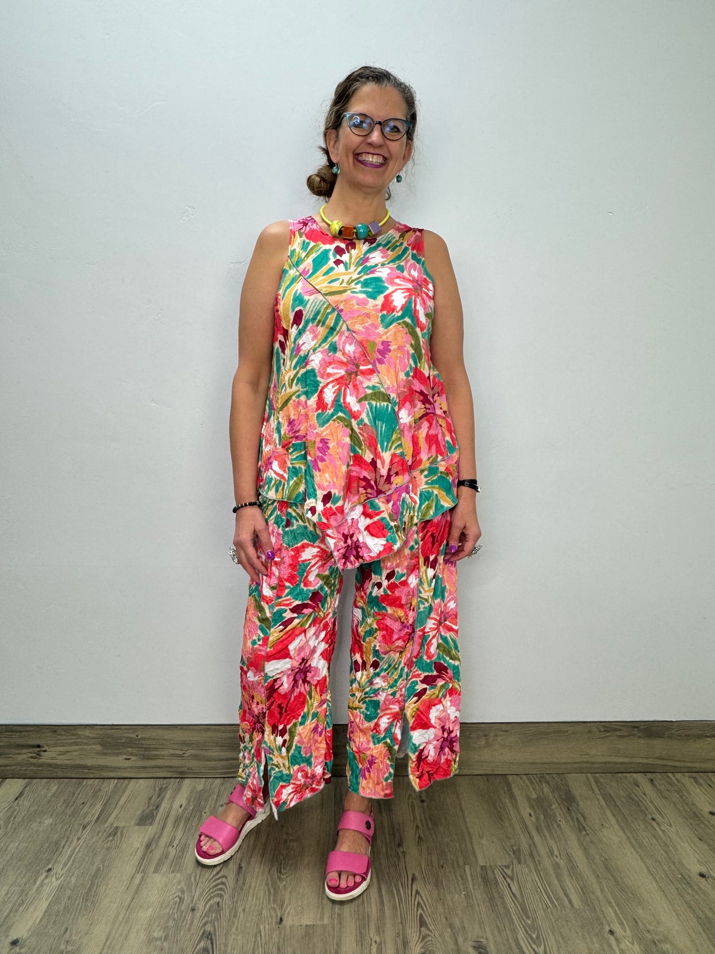 Turquoise and Pink Floral Crinkle Full Length Pant