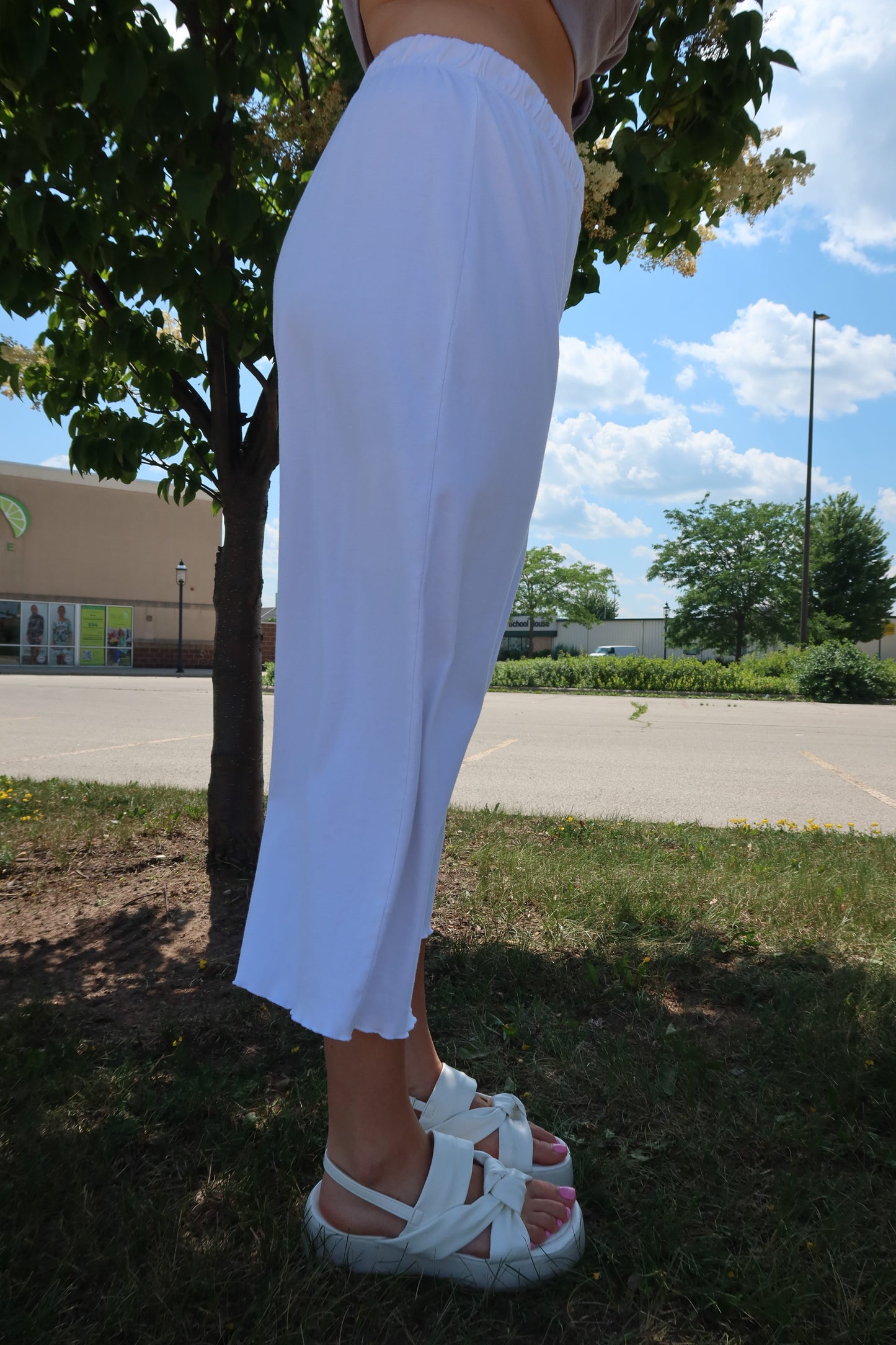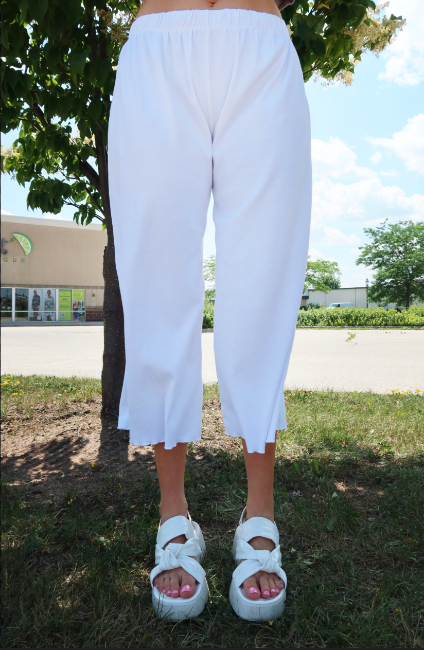 Elevate your style with our White Lettuce Edging Crop Pants! Featuring a charming lettuce edging, this crop cut pant is perfect for any occasion. The solid white color adds a touch of elegance to any outfit. Say goodbye to boring pants and hello to effortless chic!