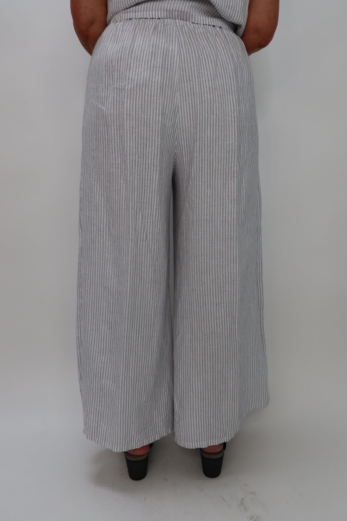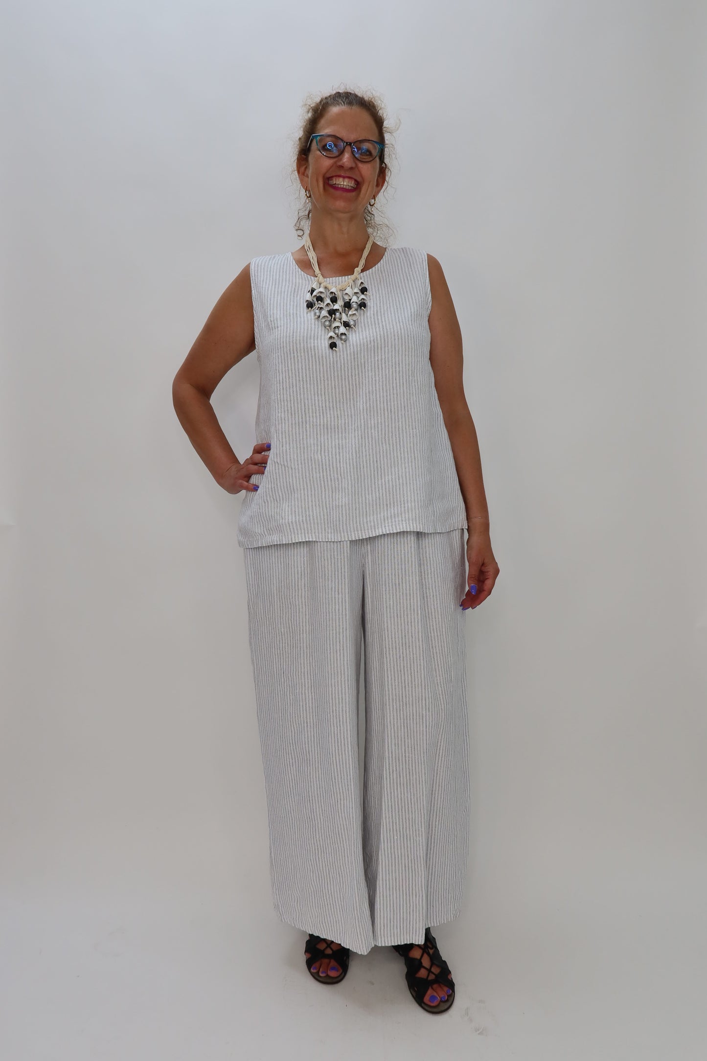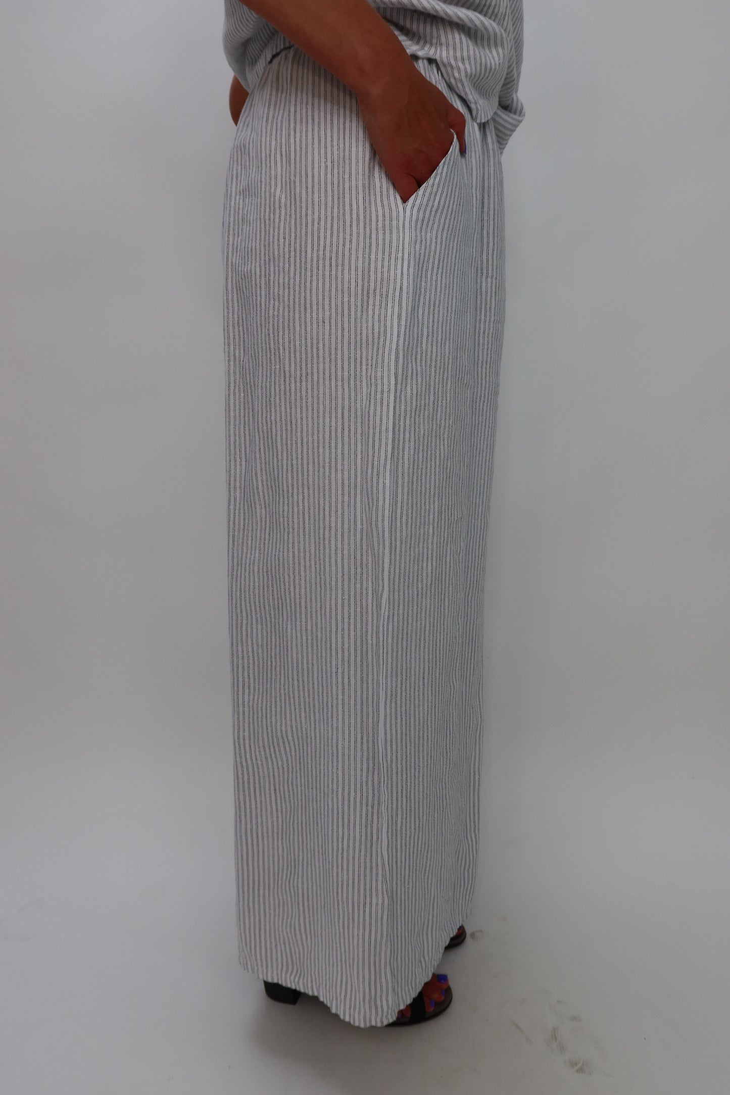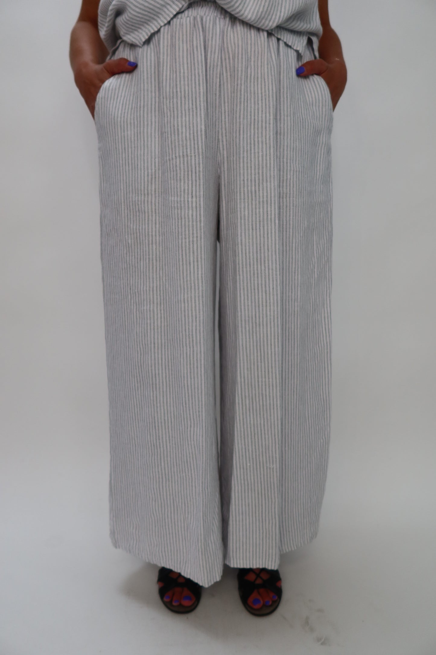 Elevate your wardrobe with these adorable long white pinstripe pants crafted from 100% breathable linen. Featuring a comfortable elastic waistband, they offer a perfect fit and effortless style. Ideal for warm days, these pants combine classic pinstripe elegance with relaxed comfort, making them a versatile choice for both casual outings and chic occasions.