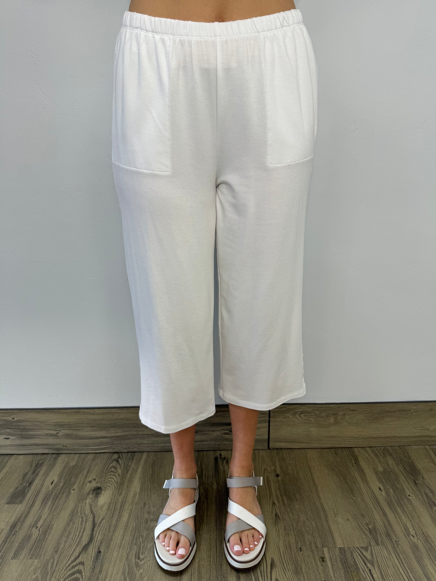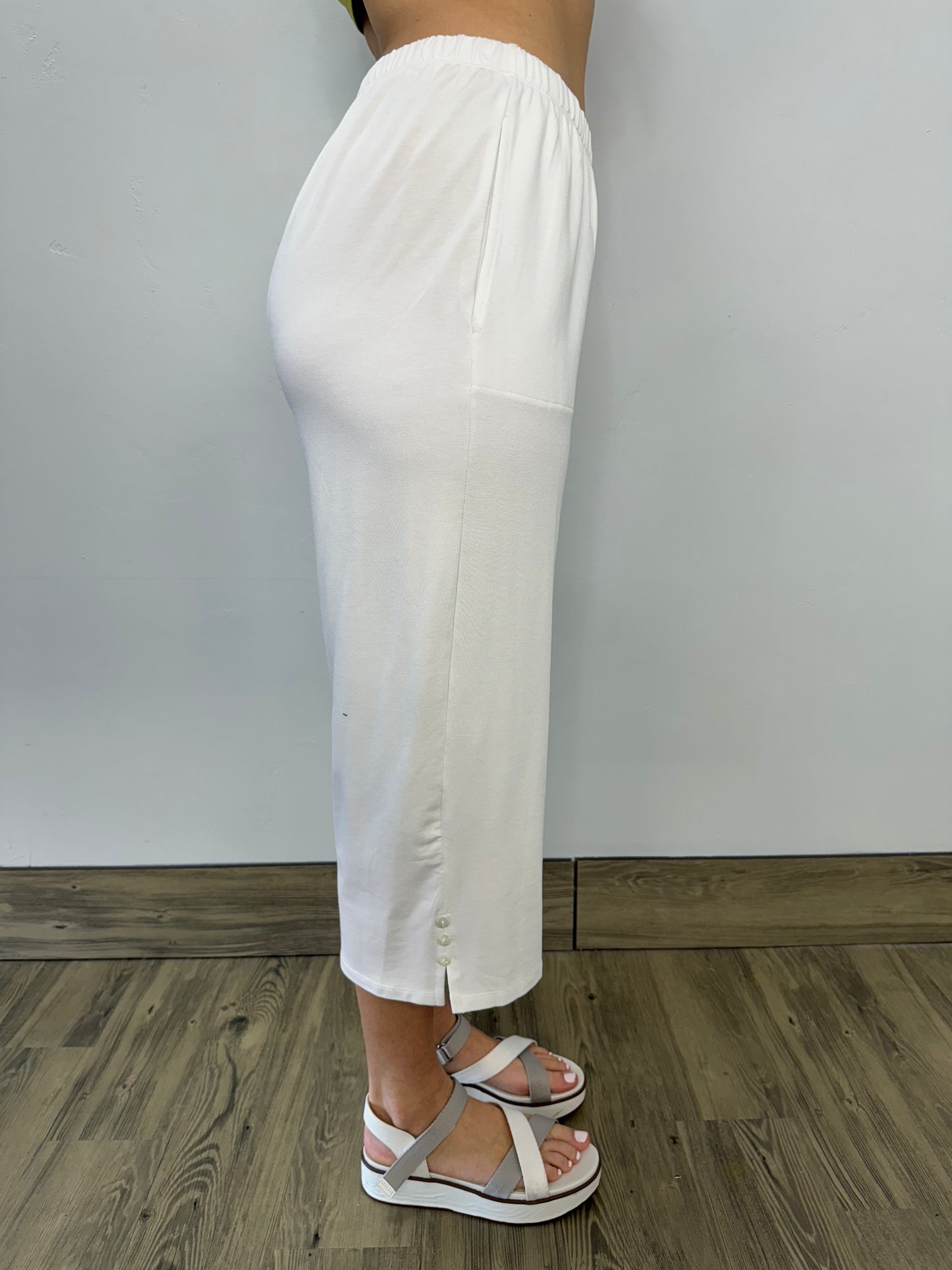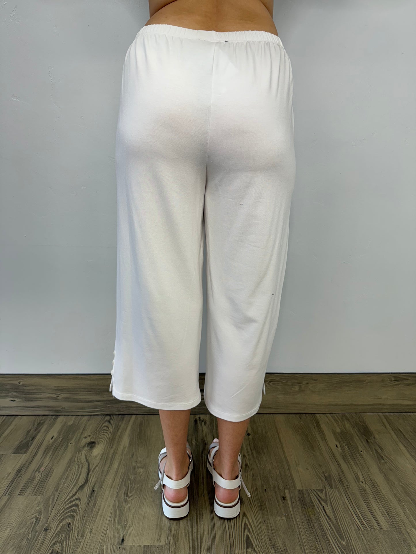 Experience ultimate comfort and style with our White Bamboo Terry Capri. Its elastic waist band and button detailing on the bottom add a unique touch while providing a comfortable and lightweight fit. Perfect for any activity, these capris will keep you feeling cool and confident all day long.
