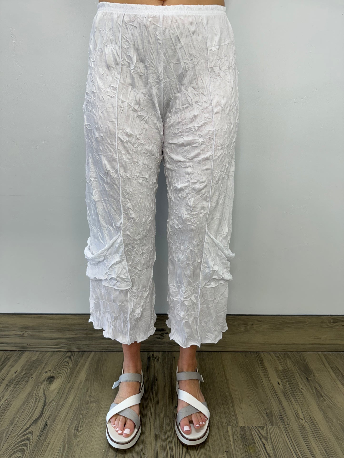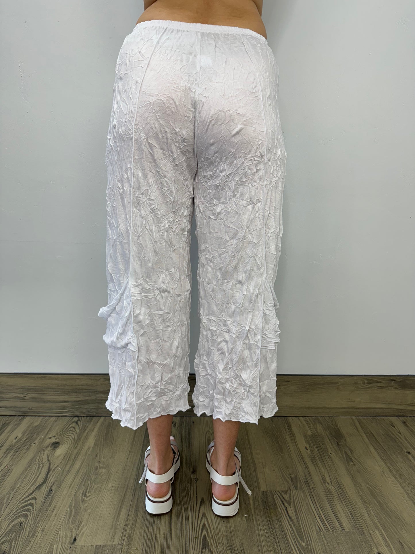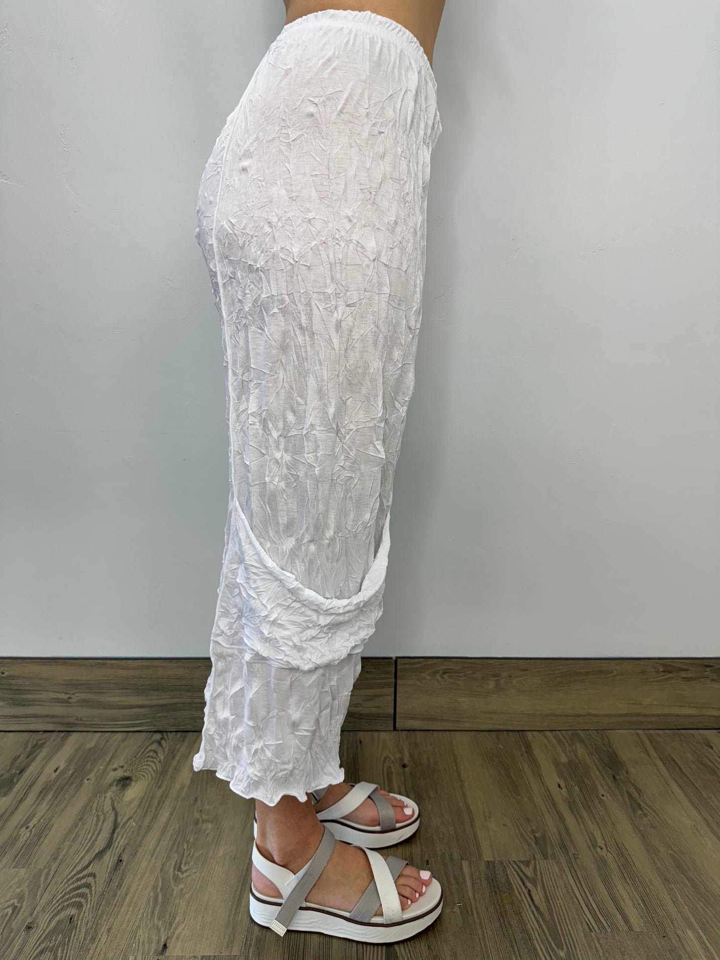 Unleash your vibrant fashion sense with our White Crinkle Crop Pants from Vine Street! These pants feature slouch pockets and an elastic waist for a comfortable fit. Perfect for any occasion and available in multiple colors. Elevate your wardrobe with these eye-catching pants!
