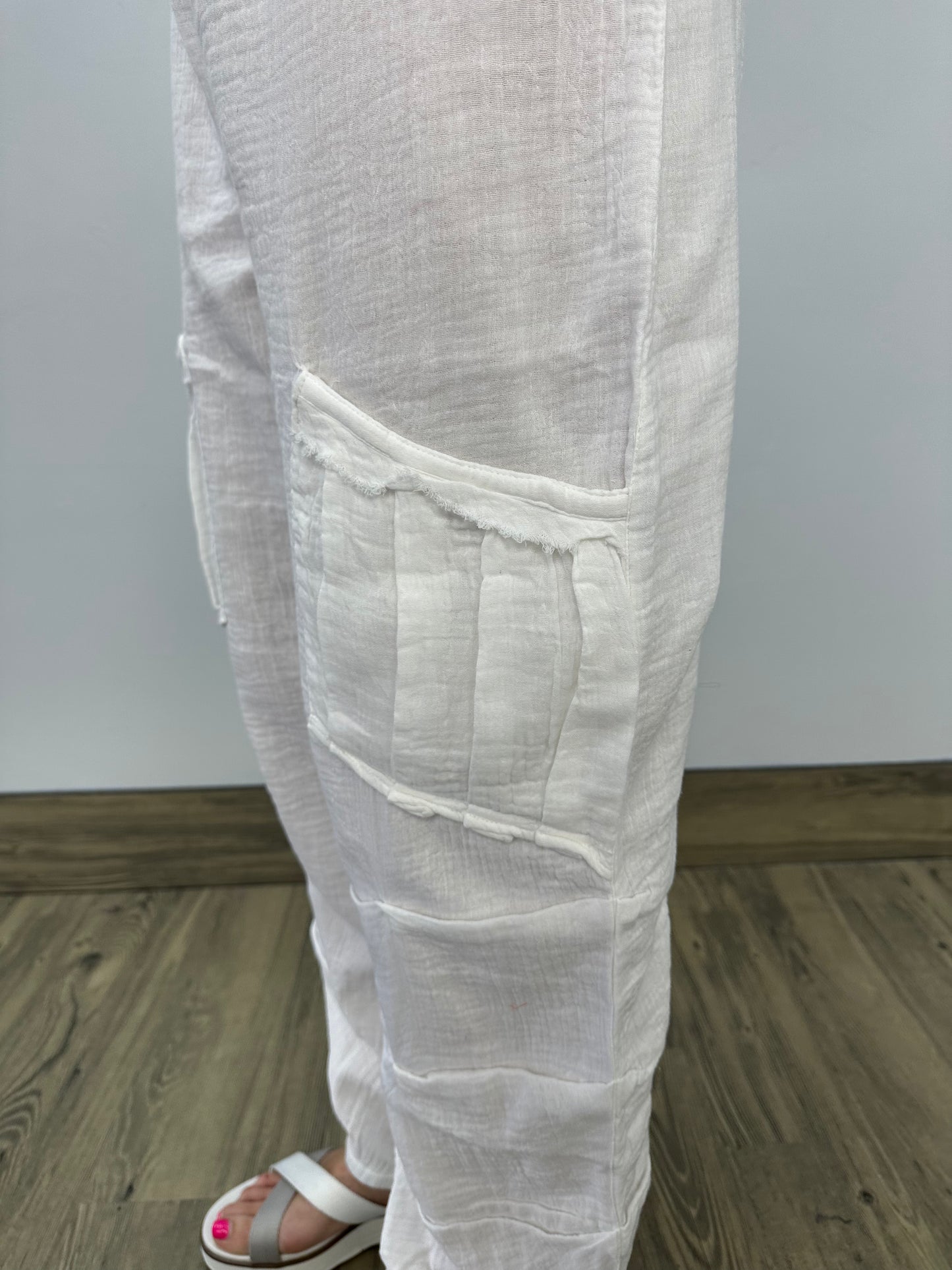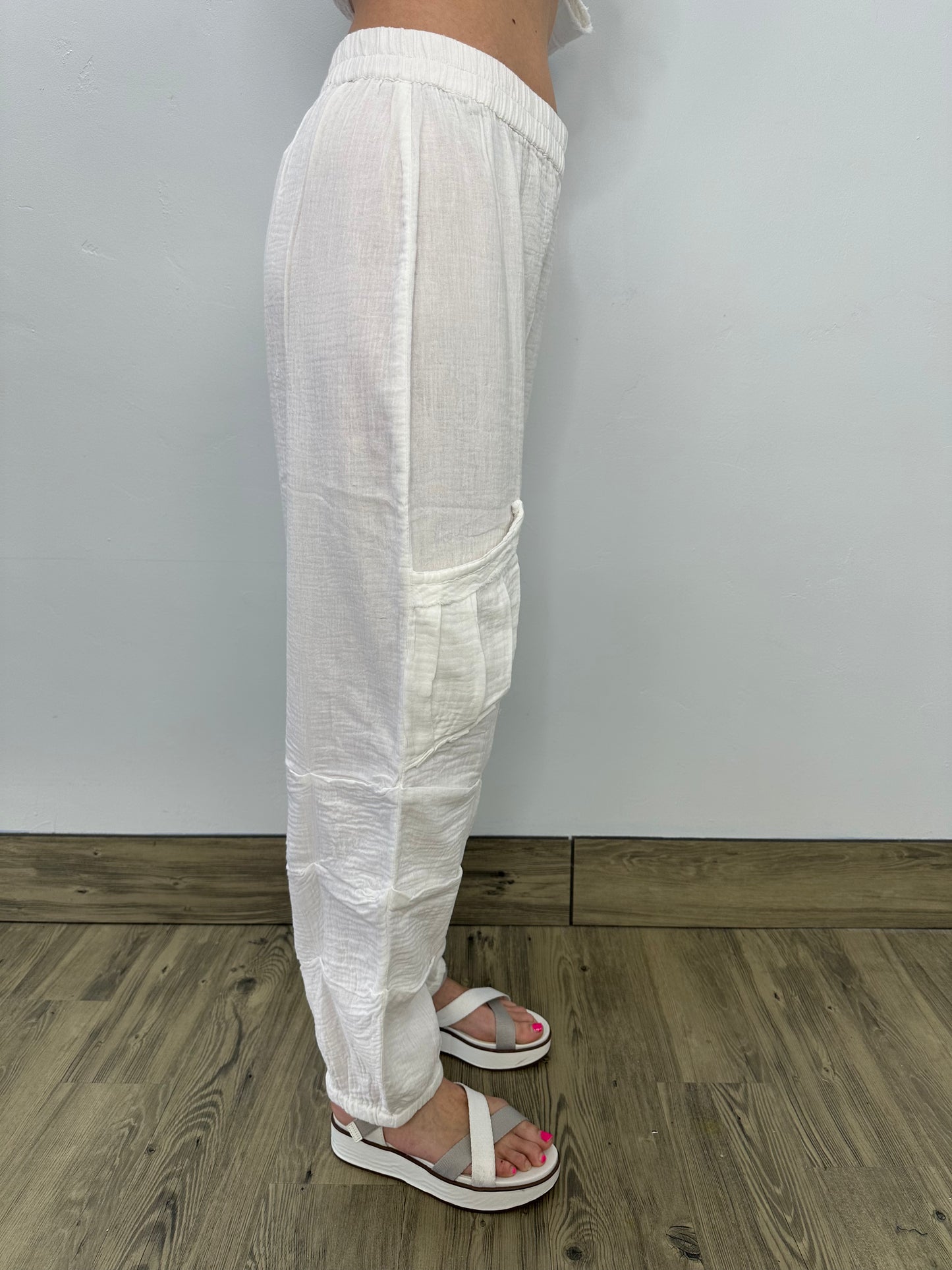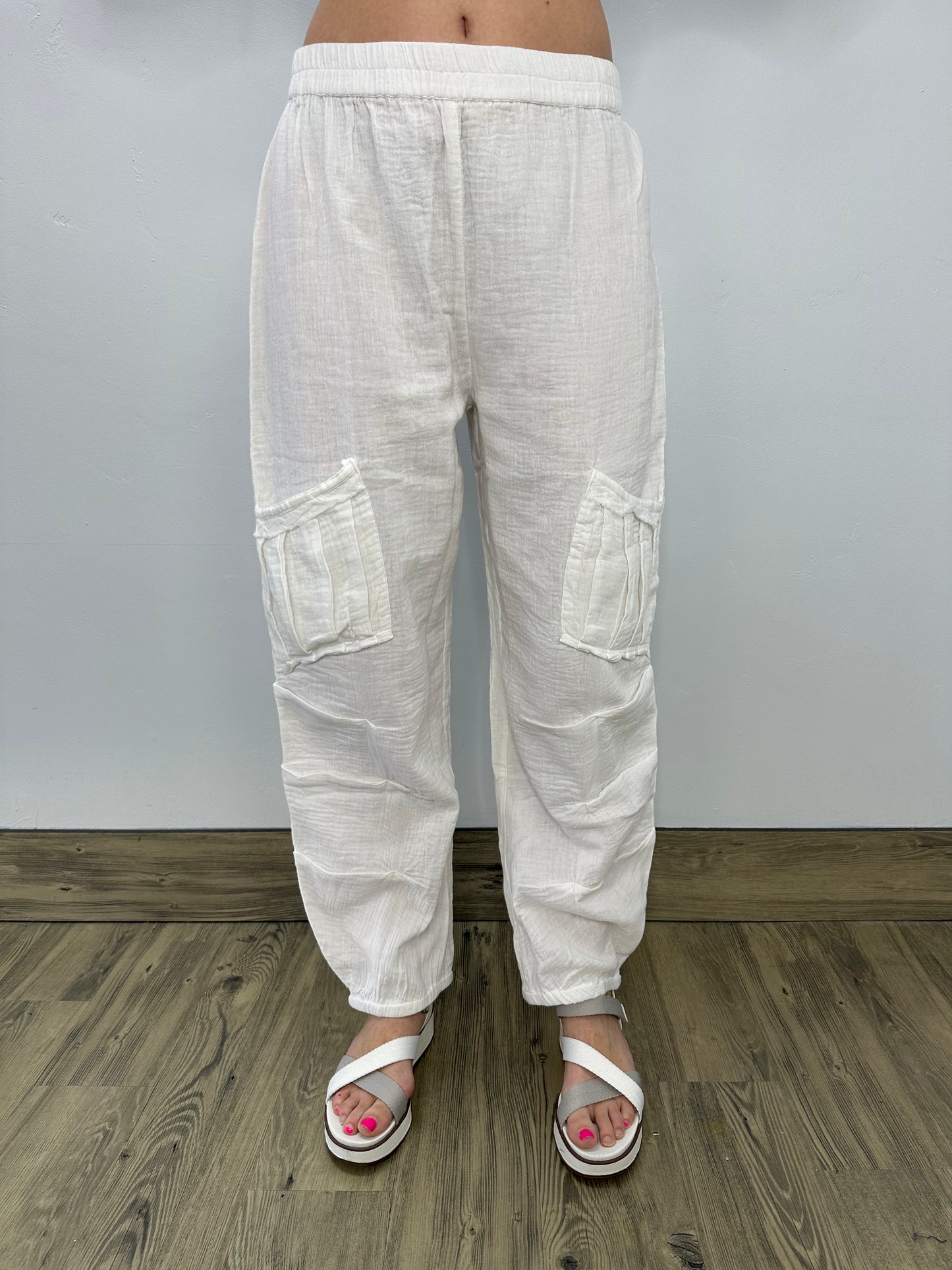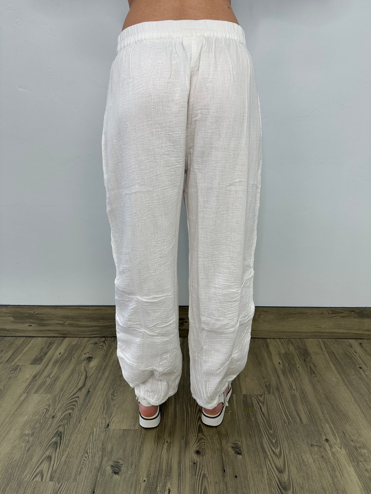 Regular price $76.30These White Stone Wash Gauze Pants with Pockets are made from a beautiful gauze material, providing both comfort and style. The long pant length and elastic waistband ensure a perfect fit, while the two pockets add convenience. A perfect addition to any wardrobe, these pants are both functional and fashionable.