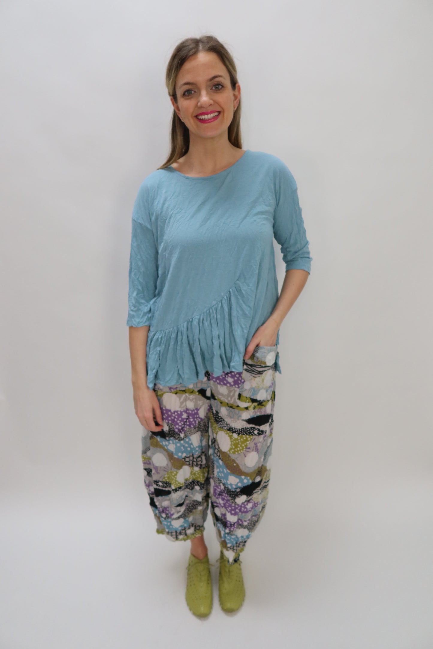 Sky Blue 3/4 Sleeve Bamboo Crinkle Jersey Asymmetrical Top