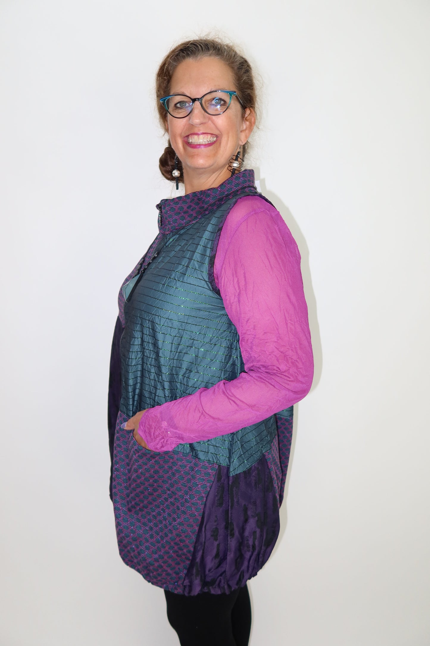 This sleeveless zip-up features a charming purple polka dot and teal stripe patchwork design crafted from soft crinkle fabric for all-day comfort. Its adjustable elastic bottom hem ensures a perfect fit, while the collar neck adds a stylish touch. A handy pocket offers convenience, making it easy to carry essentials. Pair it effortlessly with our Pink Crush crinkle sheer long sleeve underneath to create a layered look that's both trendy and cozy.