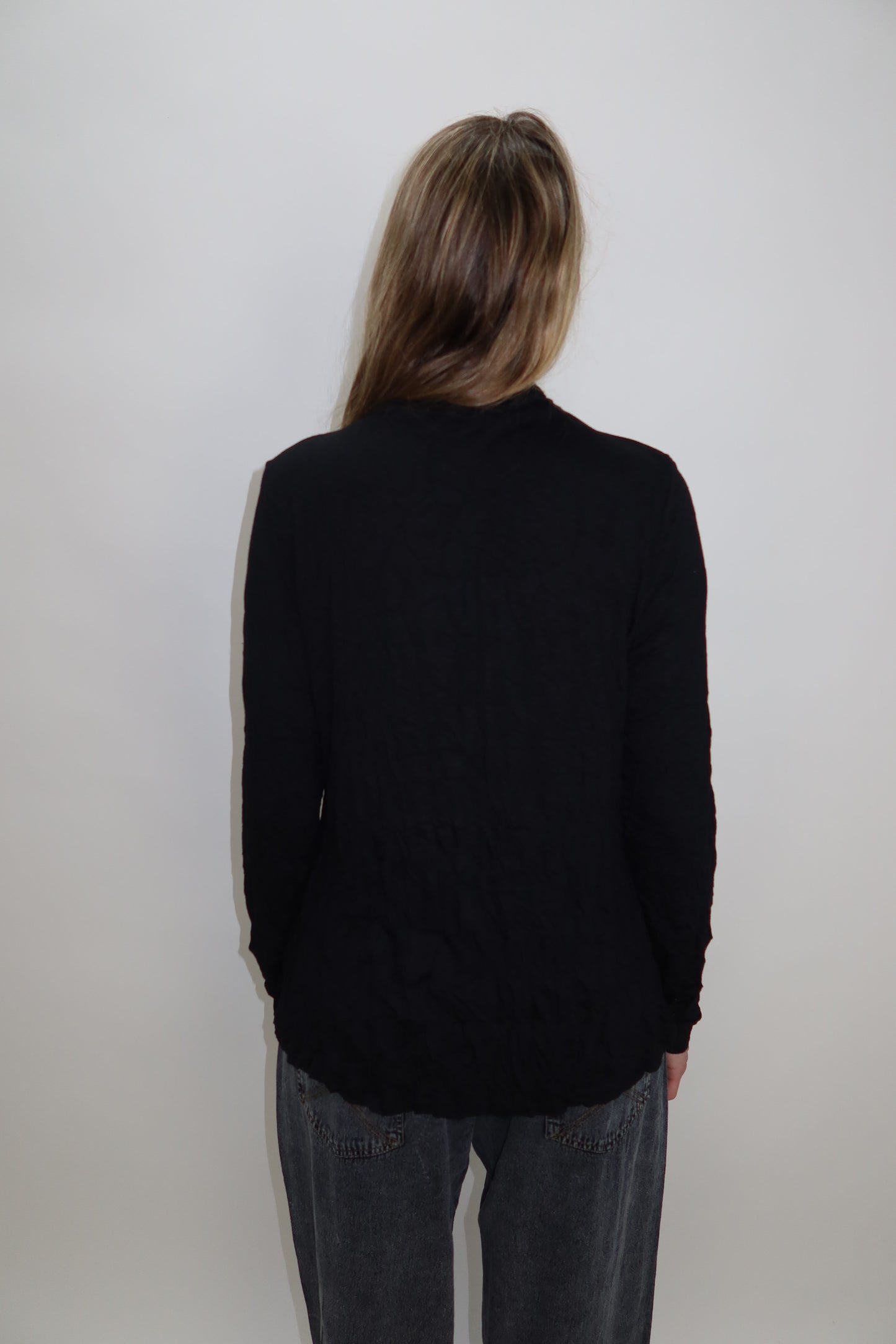 Embrace fall in style with this Black Crinkle Jersey Mock Neck Top. Featuring a high mock neck and long sleeves, it offers cozy warmth while the rich chocolate hue adds a versatile, flattering touch to any outfit. Its soft crinkle jersey fabric makes it perfect for layering, easily pairing with jackets or scarves for effortless seasonal chic. A must-have piece that combines comfort and fashion for your autumn wardrobe.